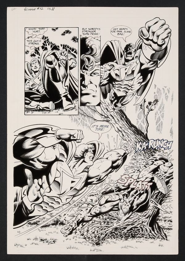 WOW what a page! The Ultraverse's heavy hitters are doing some...well, some heavy hitting as Prime and Sludge (both under the influence of evil forces) have a knockdown drag-out fight in Central Park. Pencil and ink on Malibu Comics art board. 12" x 17 1/2".