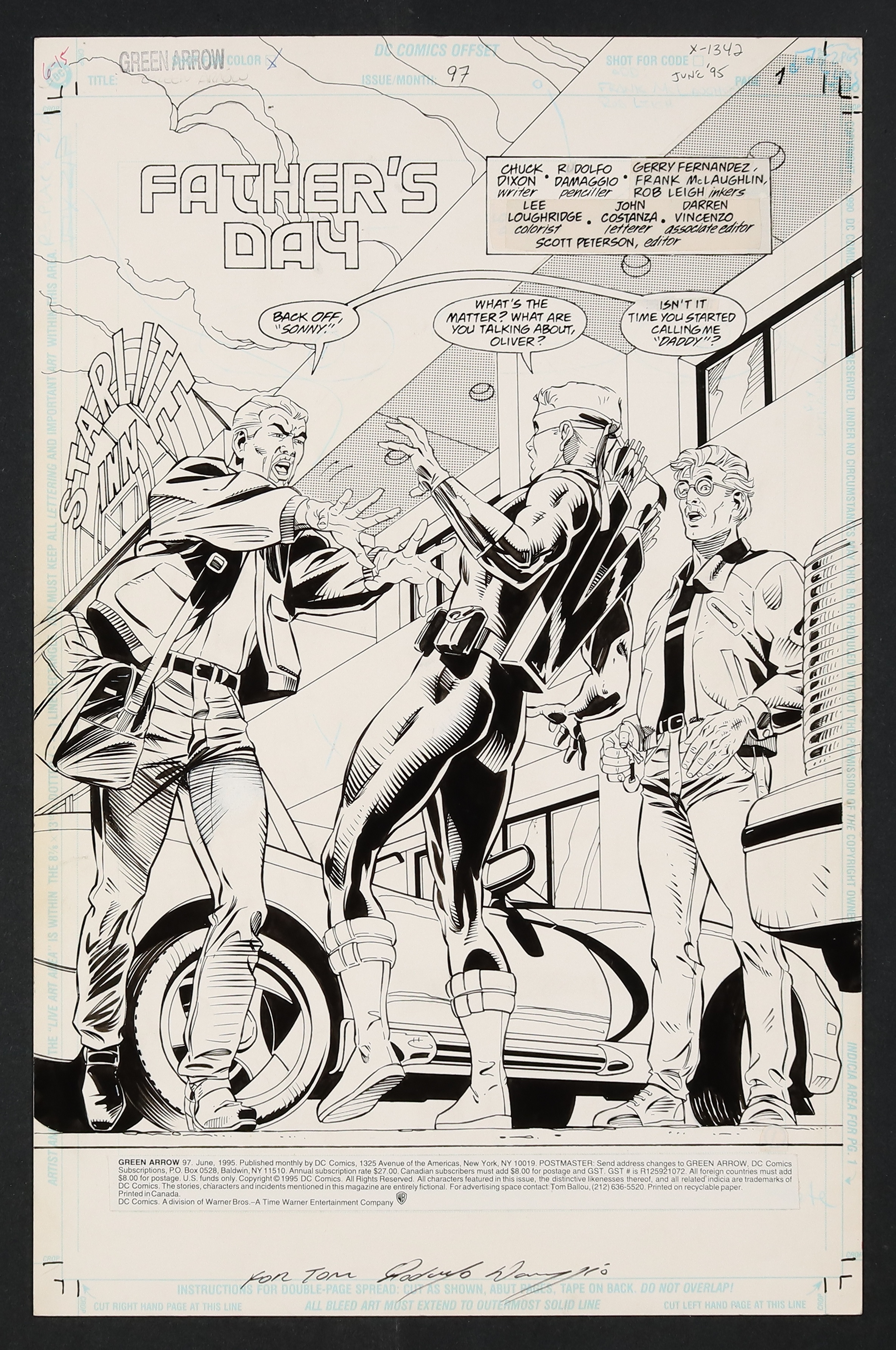 A dramatic opening to this issue, part of Ollie's last arc (for a while, anyway) before his shocking death! Having learned secondhand that Connor Hawke is his son, Ollie is NOT happy about being deceived by the young hero and wants to make that clear. It's a big moment in the story that ups the stakes for what's to come! Signed by Damaggio in lower margin. Pencil, ink, and screentone on DC Comics art board. 11" x 17". NOTE: Multiple inkers are credited for this issue- Gerry Fernandez, Frank McLaughlin, and Rob Leigh.