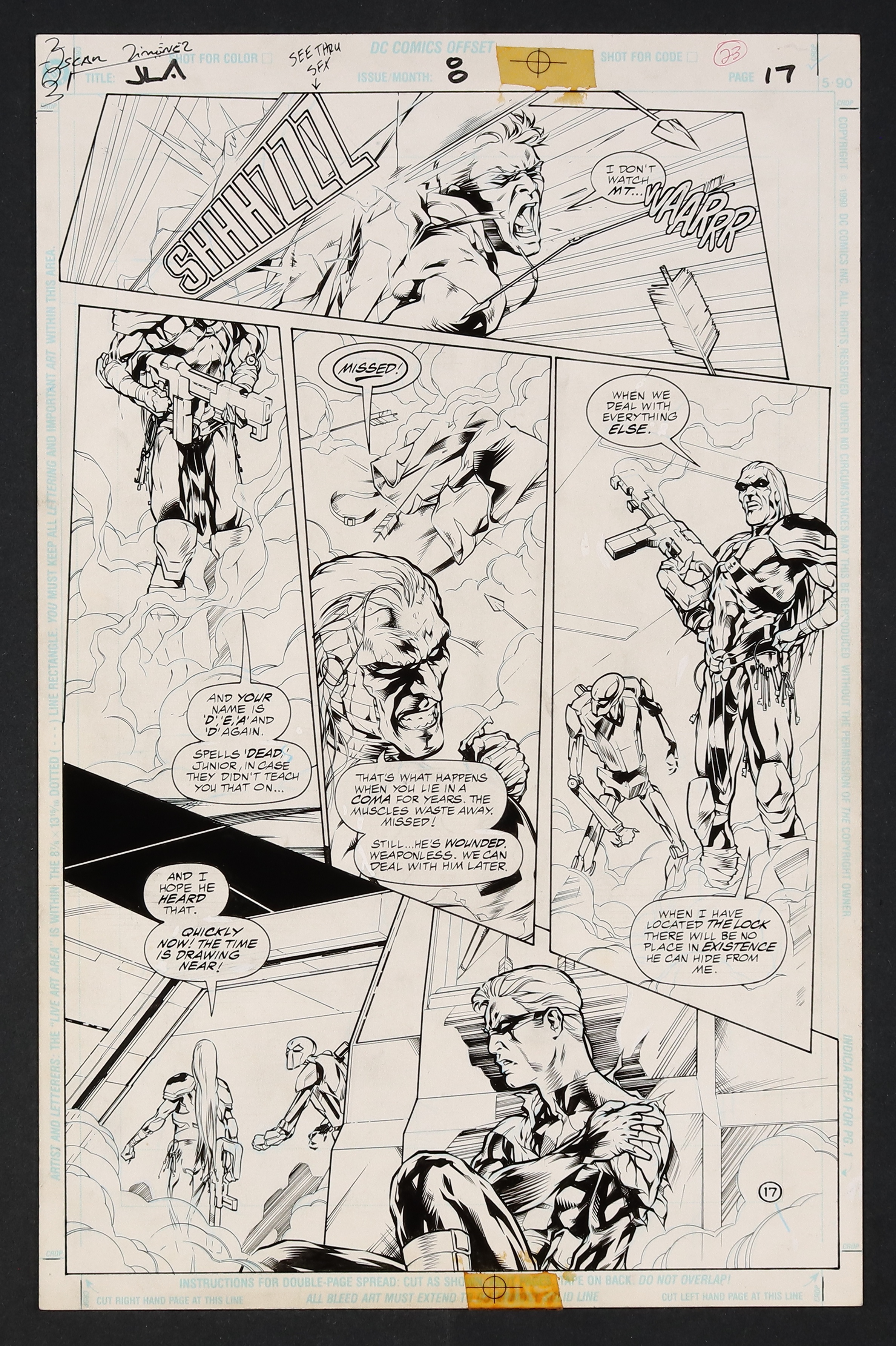 We're doing a Die Hard! Provisional JLA member Connor Hawke arrives at the JLA satellite to find the League captured by The Key and trapped in elaborate dreams. A nice action beat and villain showcase on this page that sees Connor making a tactical retreat! Signed by Jimenez in top right margin. Pencil and ink on DC Comics art board.
