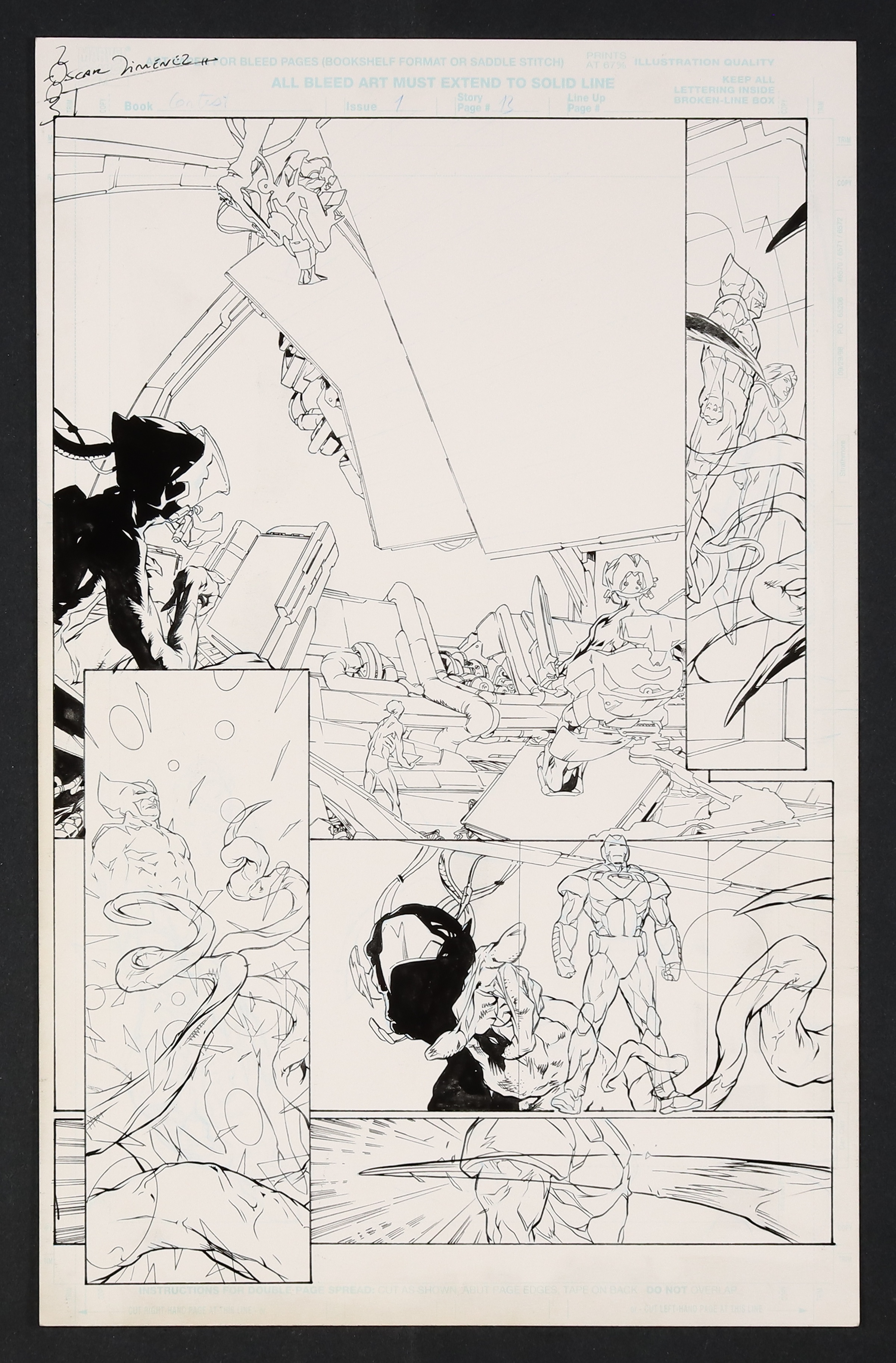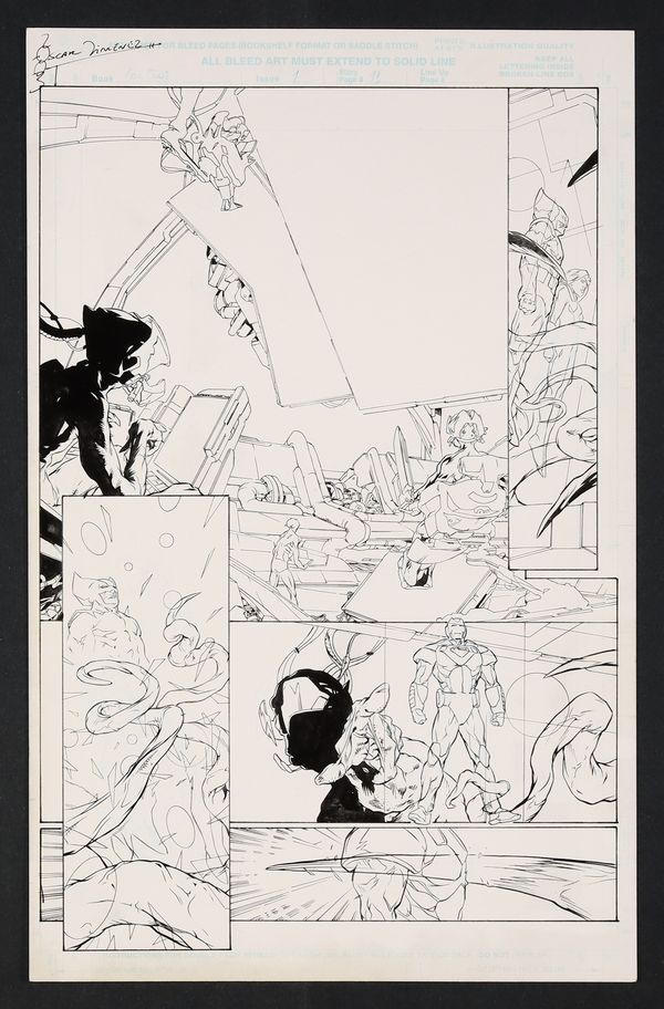 While Johnny Storm and Rogue are enamored with their generous alien hosts, Iron Man is immediately suspicious- and even more so when his suit informs him that the air is filled with nanites! Here we see the control room of the mysterious ship, with the unseen aliens ominously observing the competitors! Signed by Jimenez in top left margin. Pencil and ink on Marvel Comics art board. 11" x 17 1/4".