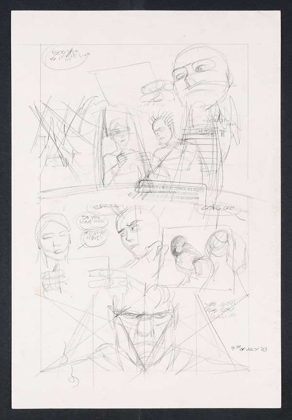 A bit of levity here as the Bat-family gathers for a 'staff meeting' with Tim and Cass admiring some action shots of the subject at hand while Bruce makes a rare joke- though you might not be able to tell by his face. Pencil and ink on DC Comics art board. 11 1/2" X 17".