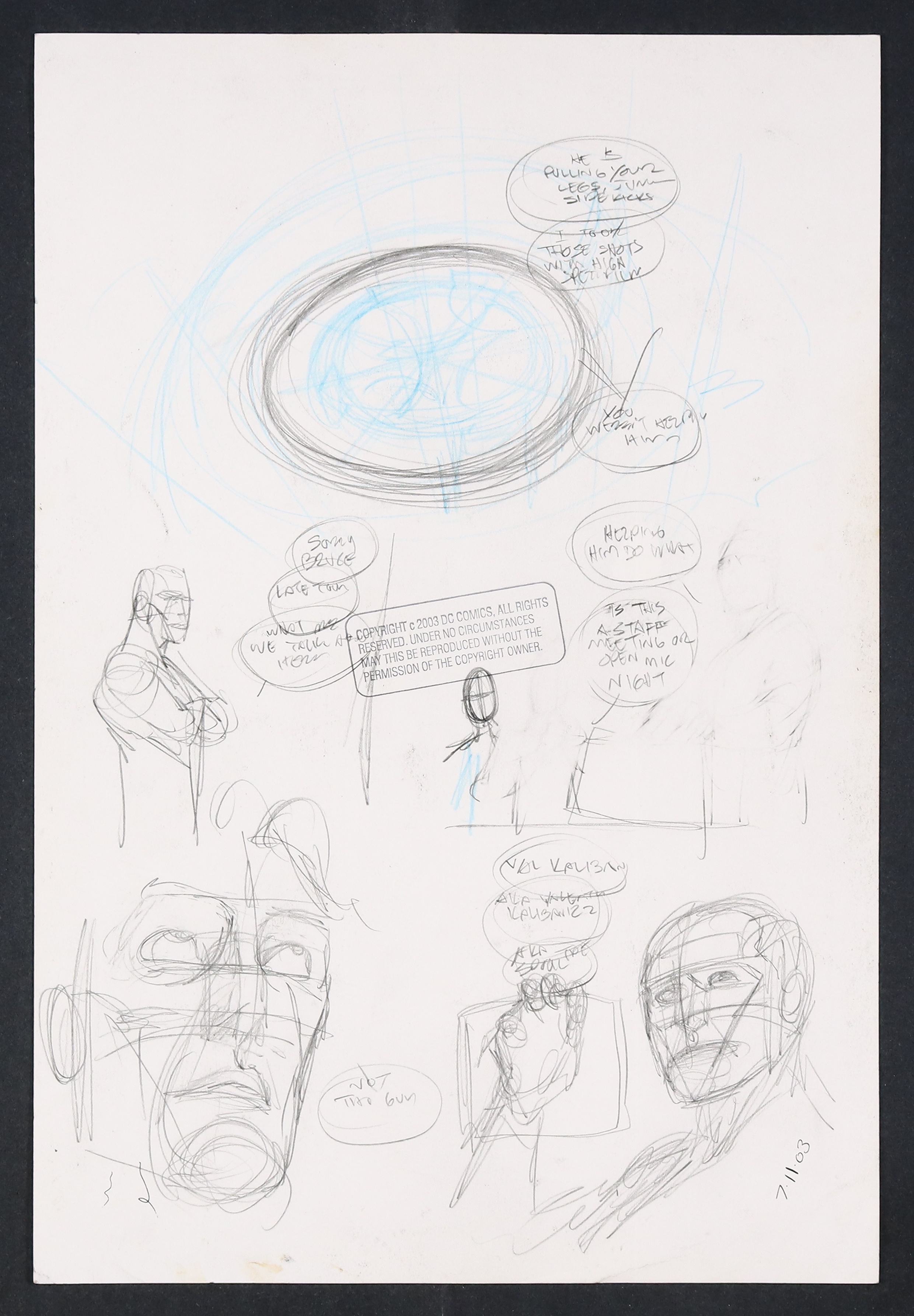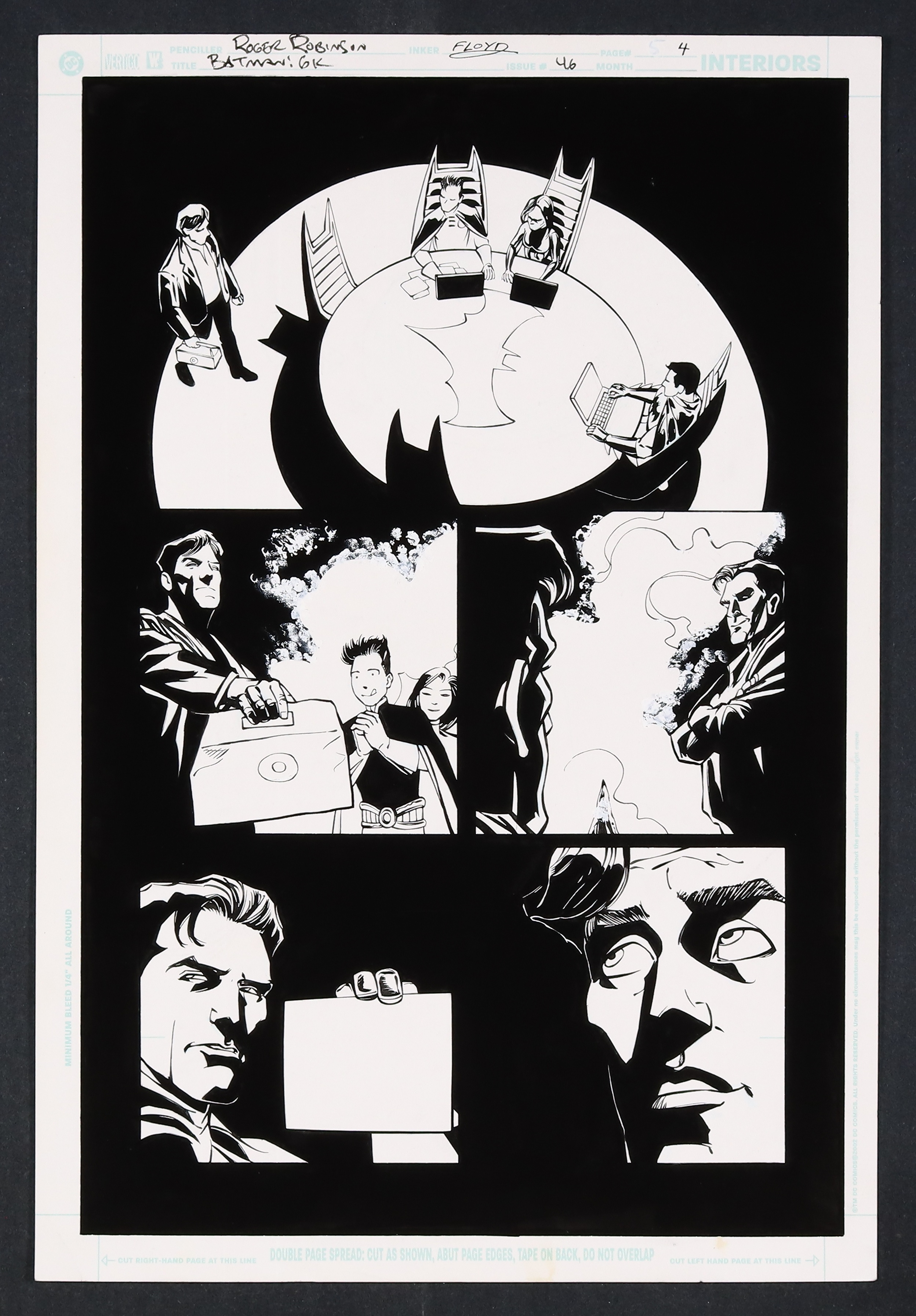 Its an all hands on deck meeting and Dick brought the Donuts! A great bit of family dynamics here as the eldest son clarifies to Tim and Cass that Batman is trolling them and a great dip into the cartoony in panel two as Time eyes the snacks. Some great old-school smoke effects here, contrasting nicely with the almost mundane 'staff meeting' vibe of the conference table setting. Pencil and ink on DC Comics art board. 11 1/2" X 17".