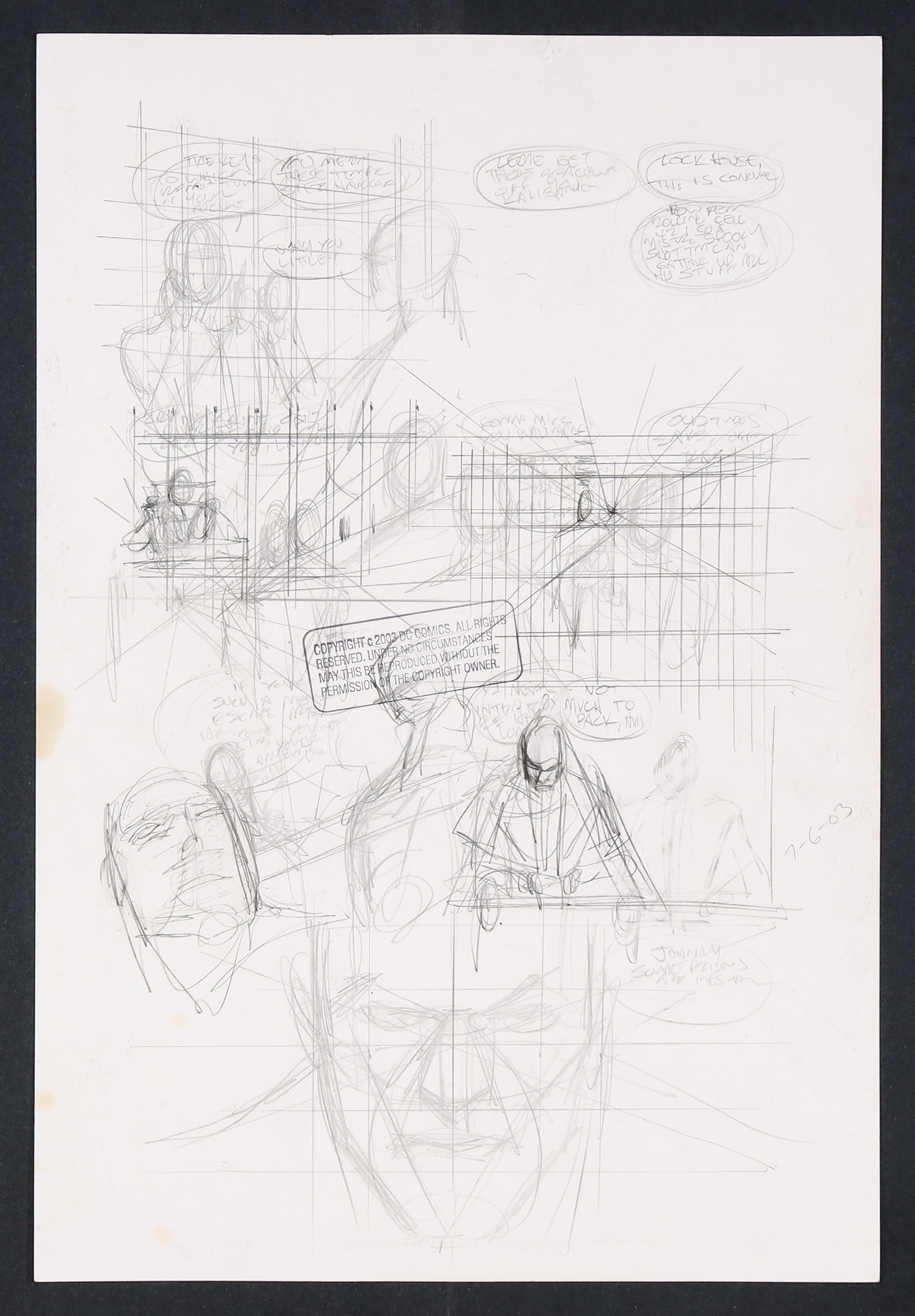 The Spook, having just been cleared for parole, returns to his cell for his final night in Blackgate Penitentiary. After charming the guards a little bit, Spook has a chat with his cellmate Johnny LaMonica (Black Spider) responding to LaMonica's question as to why he never escaped his current detention with the cryptic answer of "Johnny, some prisons are inescapable." Pencil and ink on DC Comics art board. 11 1/2" X 17".
