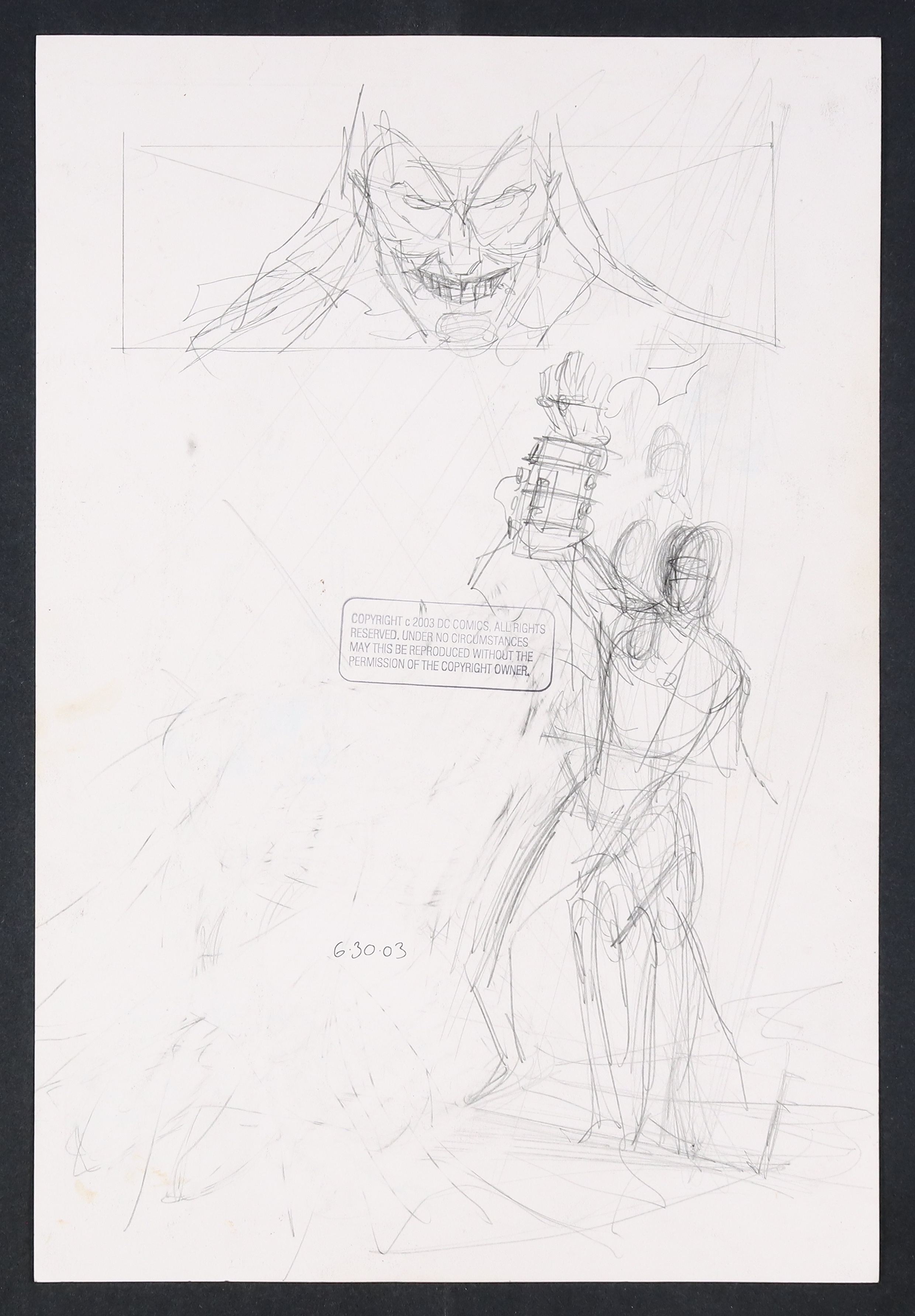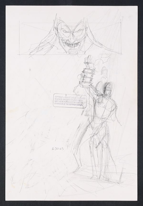 A stunning flashback splash page! While in the present The Spook is seemingly reformed and on his way to freedom, here we see him in his prime with Batman bound before him and crackling power in his hands! Pencil and ink on DC Comics art board. 11 1/2" X 17".