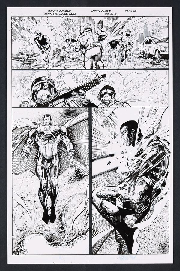 As Curtis Metcalf (Hardware) deals with the problems that come along with becoming a major defense contractor, Icon continues his mission to stabilize the world- something he finds is more difficult than he'd like! Cowan and Floyd combine powerful figure work and energetic background flourishes here to create an incredible sense of battlefield atmosphere. Ink over printed pencils on comic art board. 11" X 17".