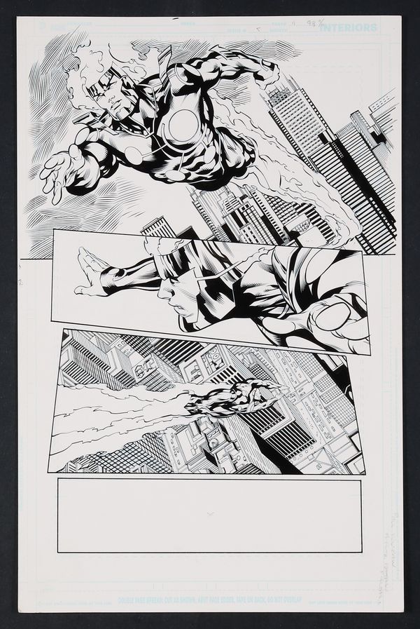Though most heroes are having some trouble in this future-set series, things are looking good for Firestorm! With Ronnie Raymond in the driver's seat, Firestorm heads home from a night at the Playboy mansion and finds that his other (better?) half Jason Rusch isn't very talkative. A big, bold hero shot of Firestorm soaring over the streets of NYC opens this great showcase page for the molecule-manipulating hero. Well, half of Firestorm anyway. Ink over printed pencils on DC Comics art board. 11" x 17".