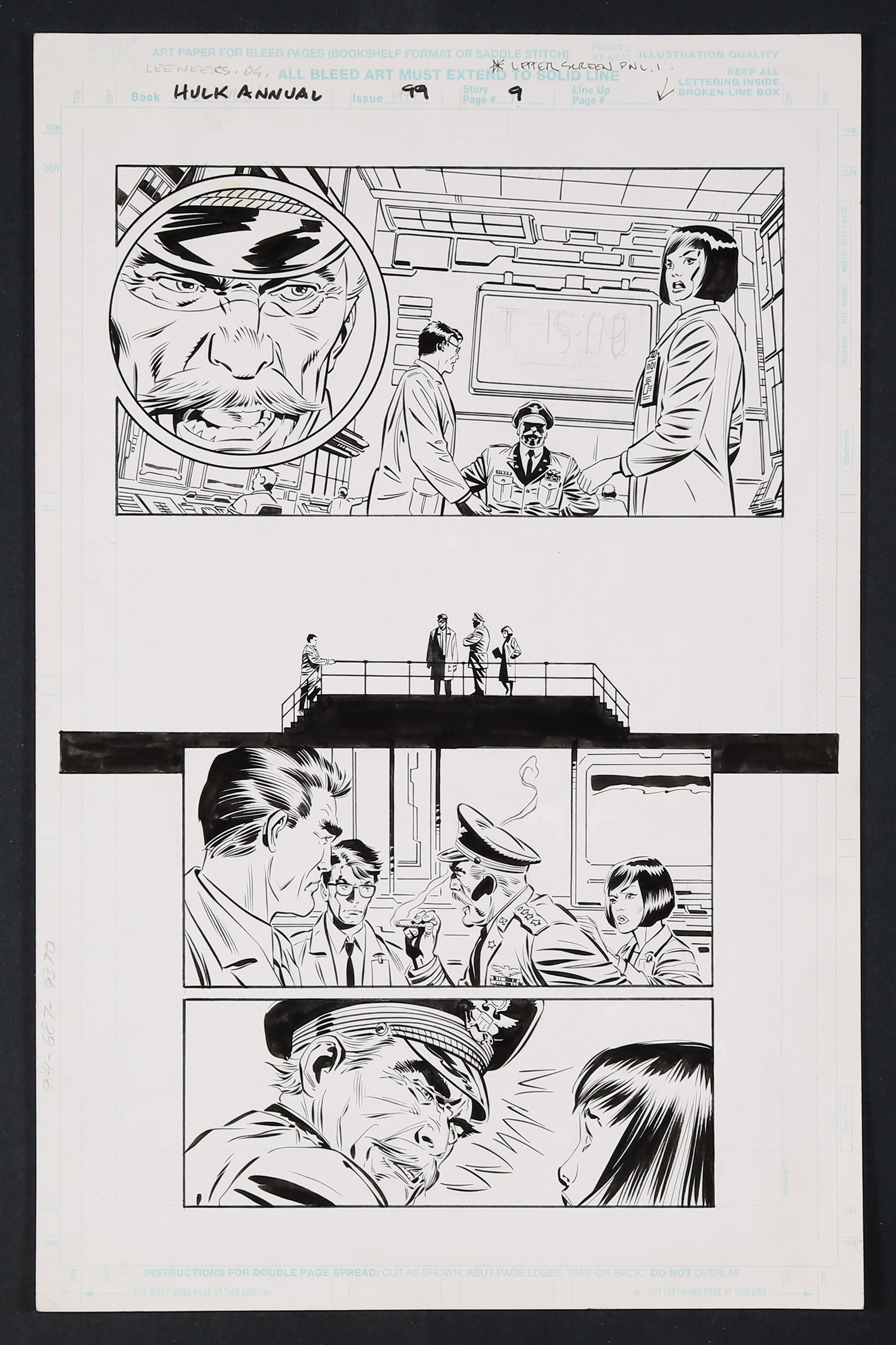 Re-Origin! The 1999 Hulk annual retells the origin of the Jade Giant with an all-star creative team (Pencils by Lee Weeks, inks by Dan Green and Klaus Janson, and a script from John Byrne!) with a slight twist- there are Skrulls lurking about! Here, the test for the Gamma Bomb (actually a laser) is about to commence and Bruce, Betty Ross, General Ross, and lab assistant Igor Rasminski argue over the safety of the test. Gee, wonder which one of them is the Skrull... Pencil and ink on Marvel Comics art board. 11" x 17".