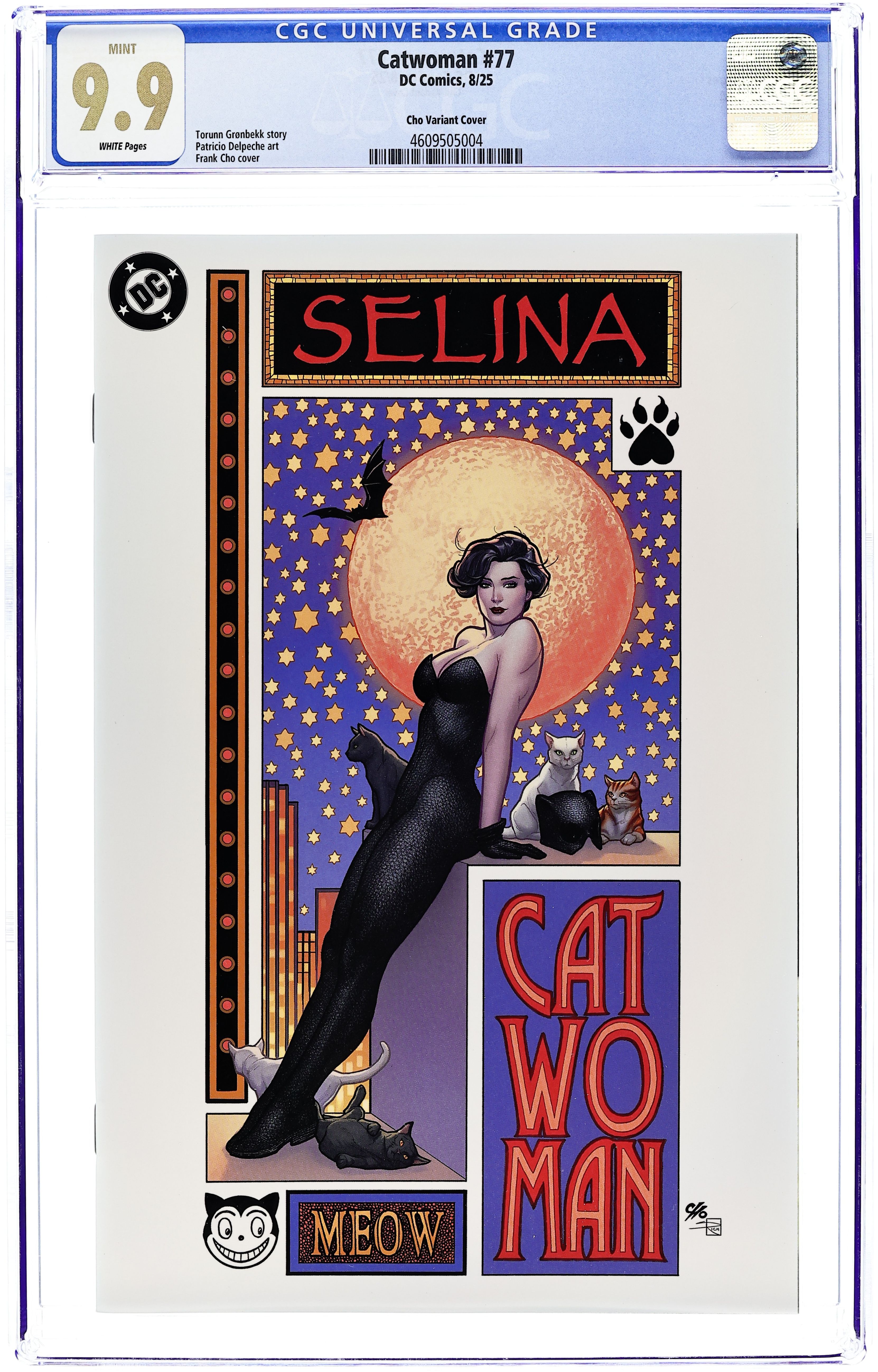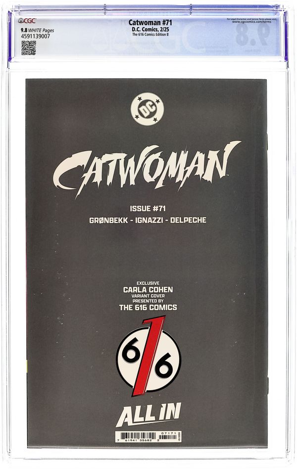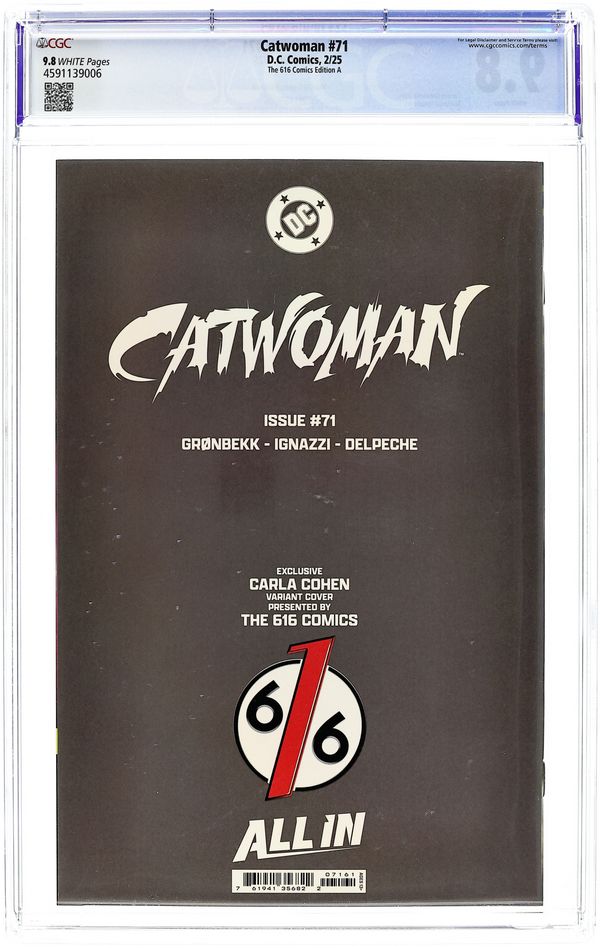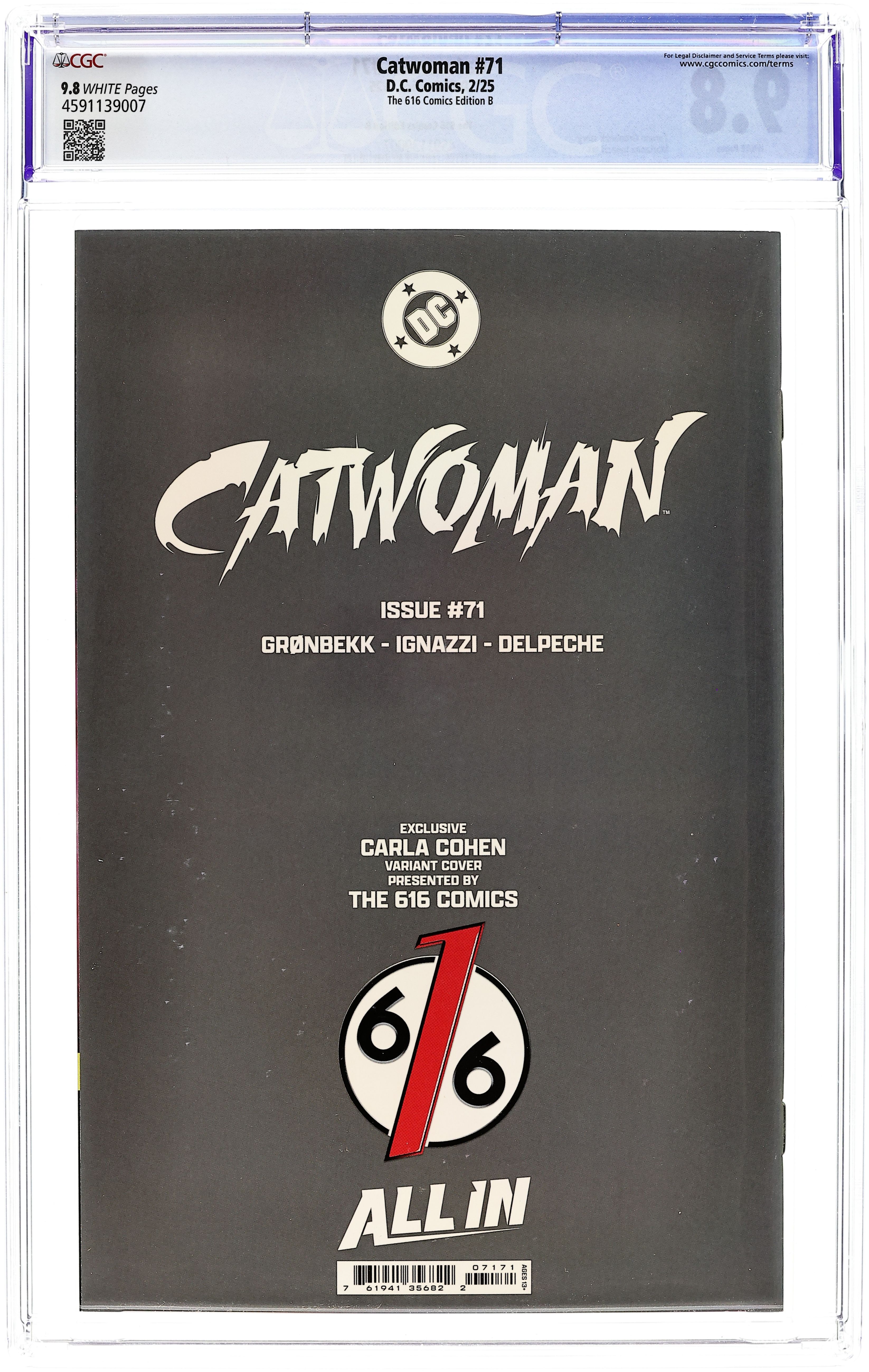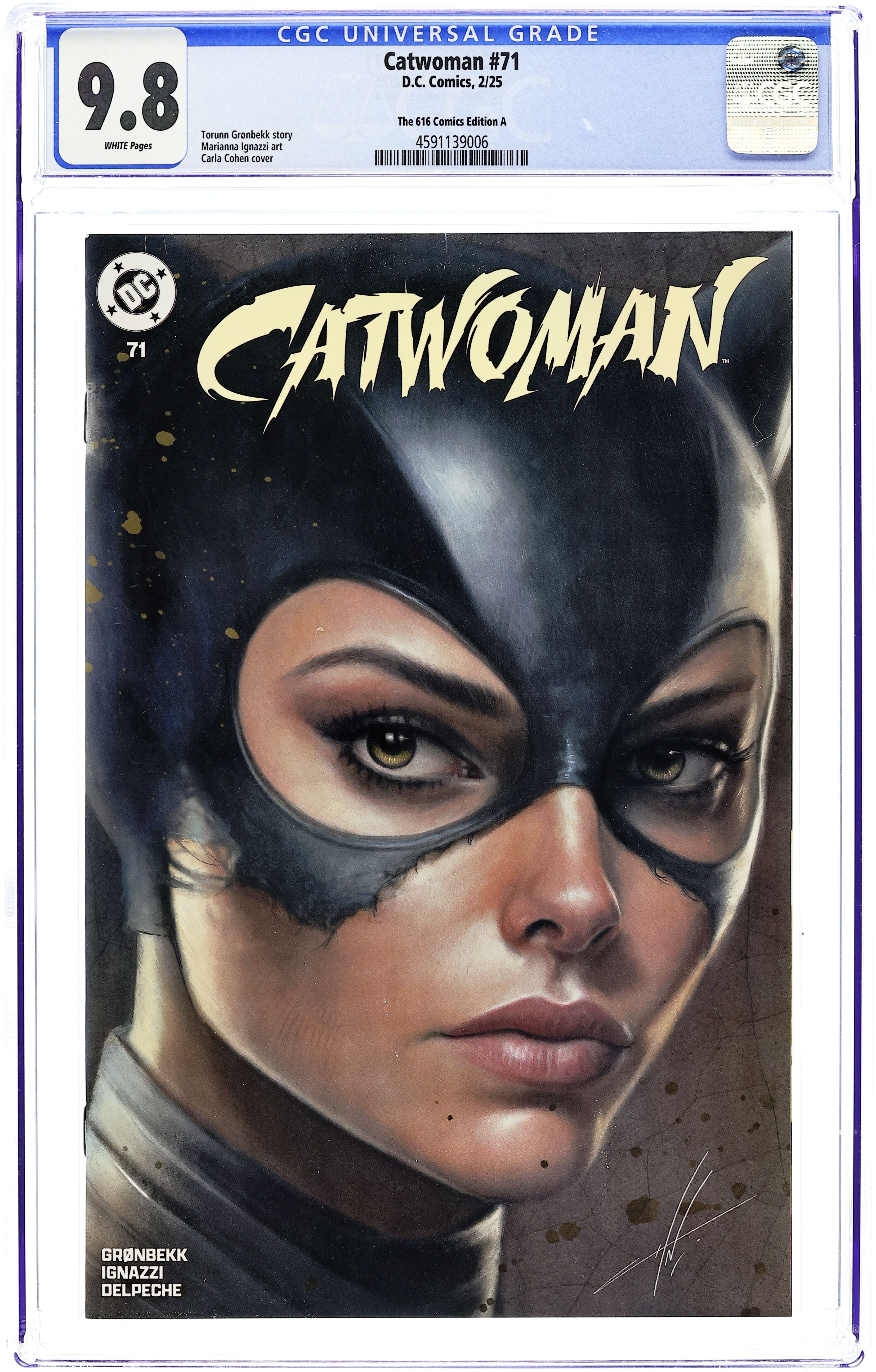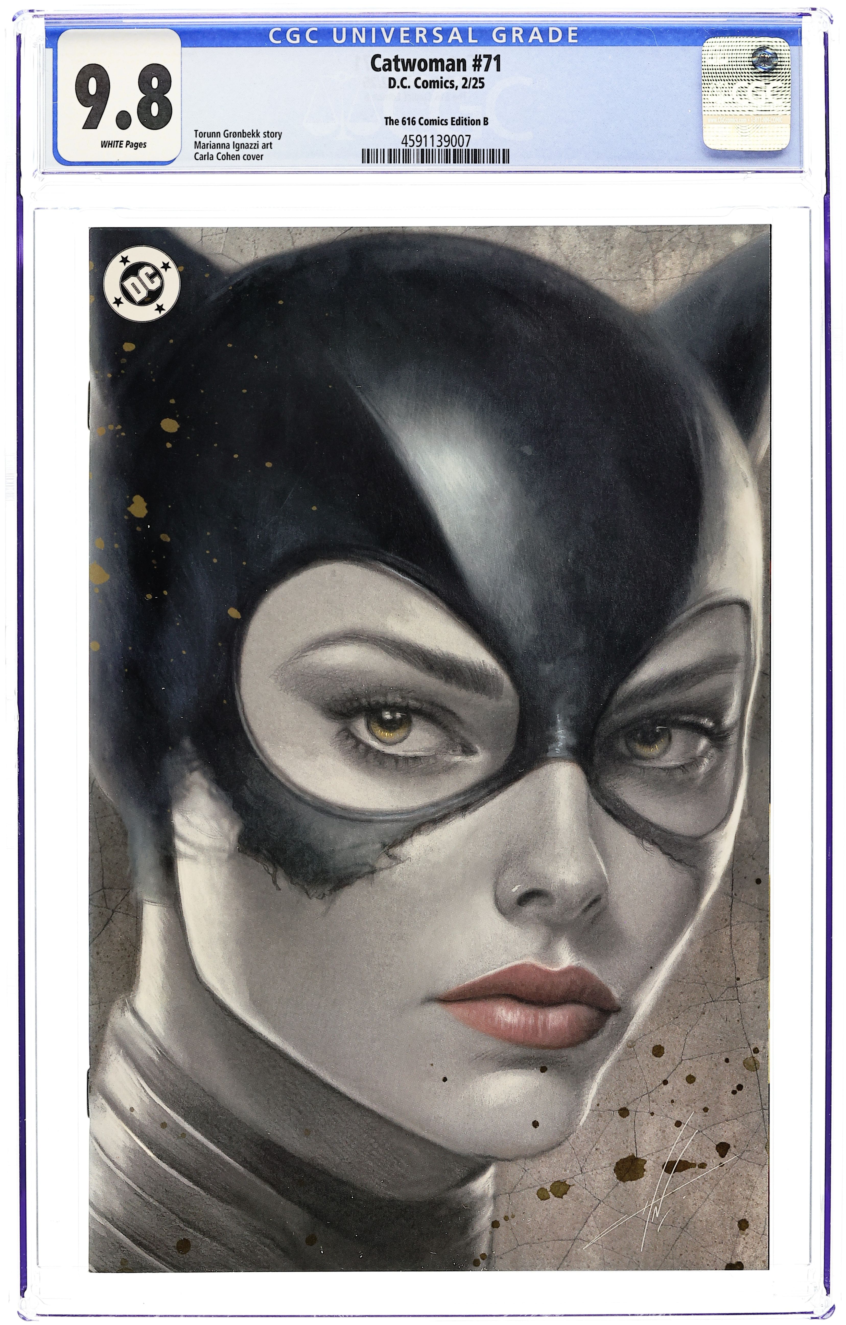 The 616 Comics, Fandom Comic Shop, and Comic Traders Exclusive Foil Edition Virgin Cover by Pablo Villalobos. Written by Tini Howard. Art by Carmine Di Giandomenico. NINE LIVES NEARS ITS LETHAL CONCLUSION! Catwoman has escaped everything from the Suicide Squad to the clutches of death itself, but along the way, she's made more than a few enemies--and their vengeance is rapidly approaching! Not even a tenth life could save Selina from what's coming, but could an old friend help this cat land on her feet? 32 pages, full color. Rated T+