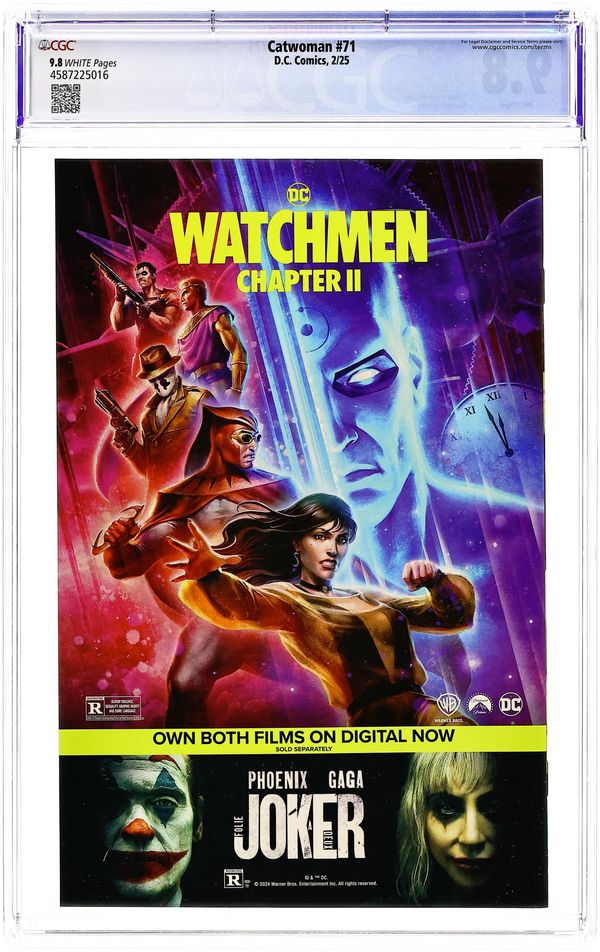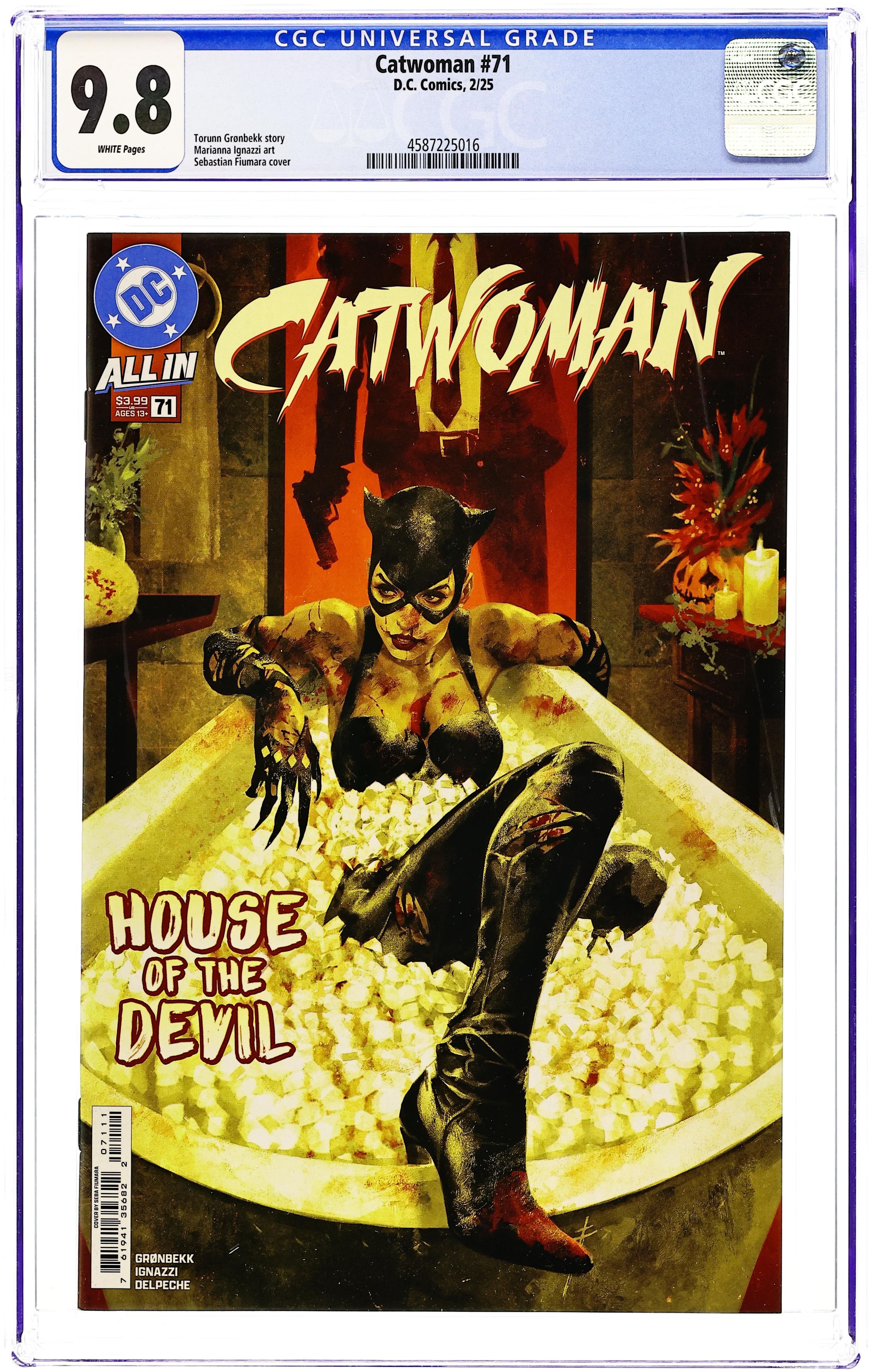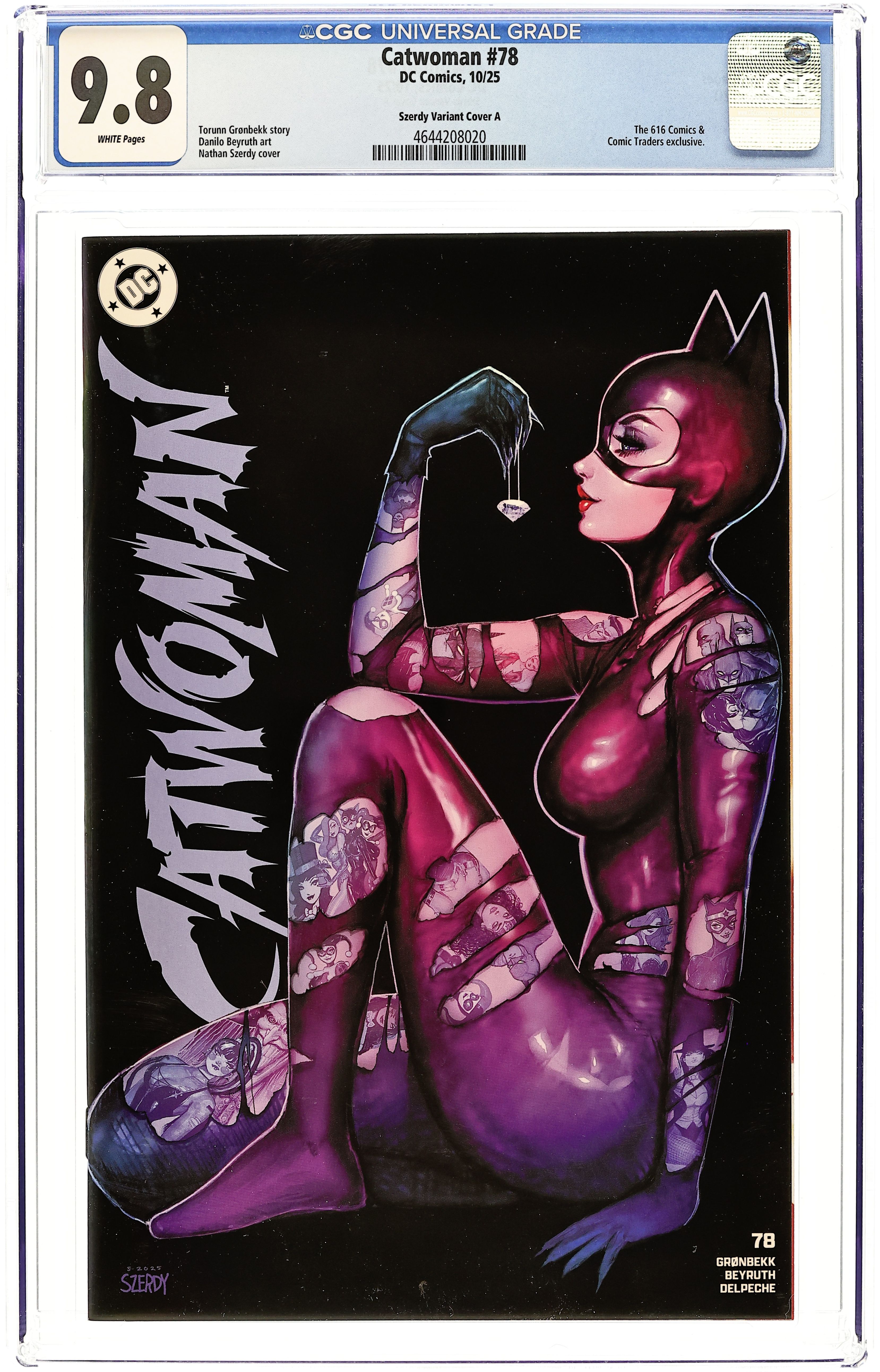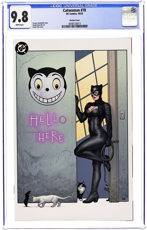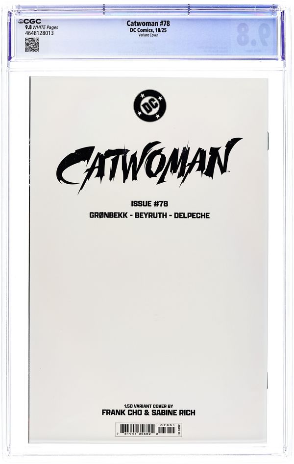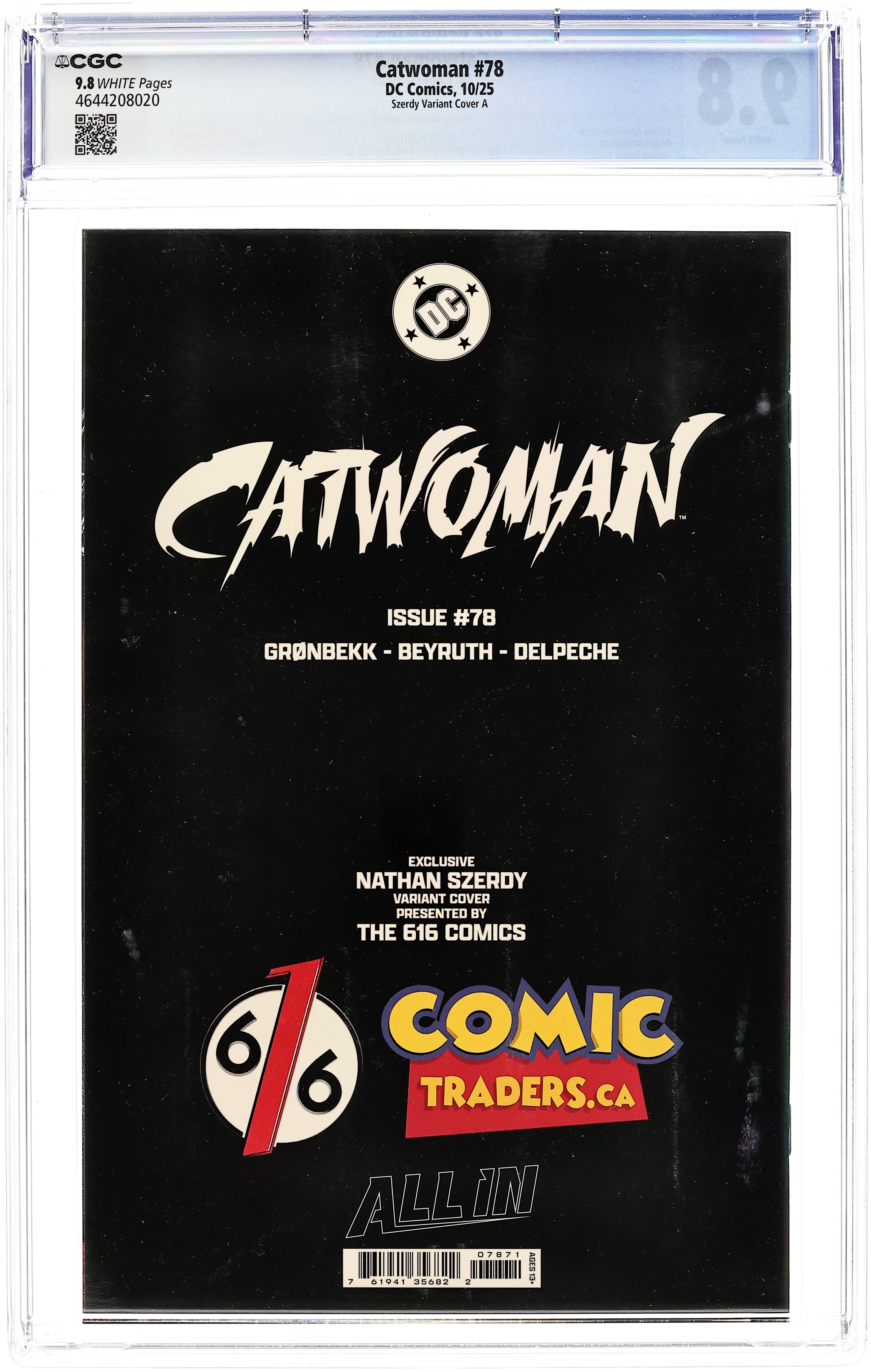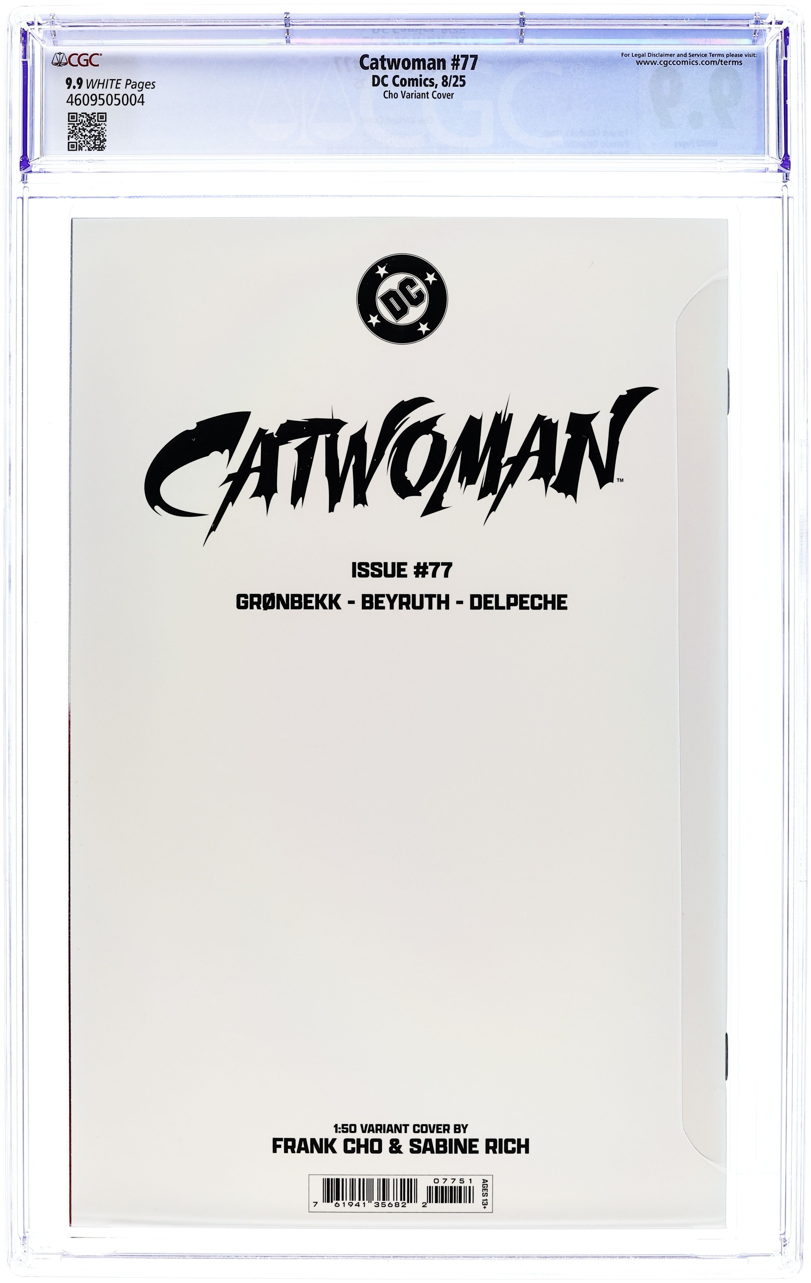The 616 Comics, Fandom Comic Shop, and Comic Traders Exclusive Foil Edition Virgin Cover by Pablo Villalobos. Written by Tini Howard. Art by Carmine Di Giandomenico. NINE LIVES NEARS ITS LETHAL CONCLUSION! Catwoman has escaped everything from the Suicide Squad to the clutches of death itself, but along the way, she's made more than a few enemies--and their vengeance is rapidly approaching! Not even a tenth life could save Selina from what's coming, but could an old friend help this cat land on her feet? 32 pages, full color. Rated T+