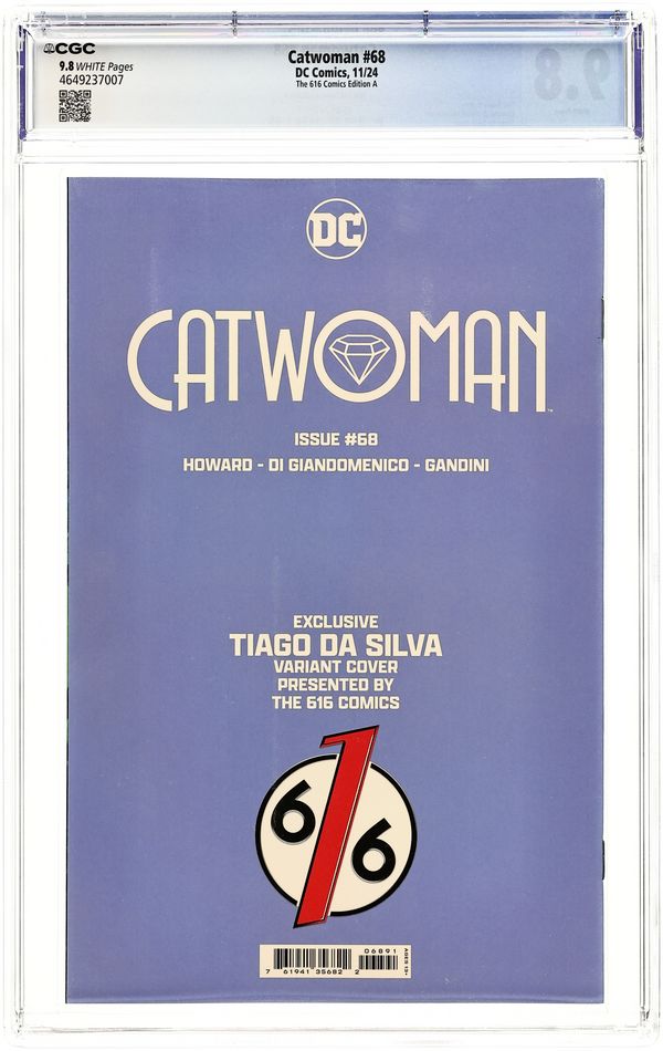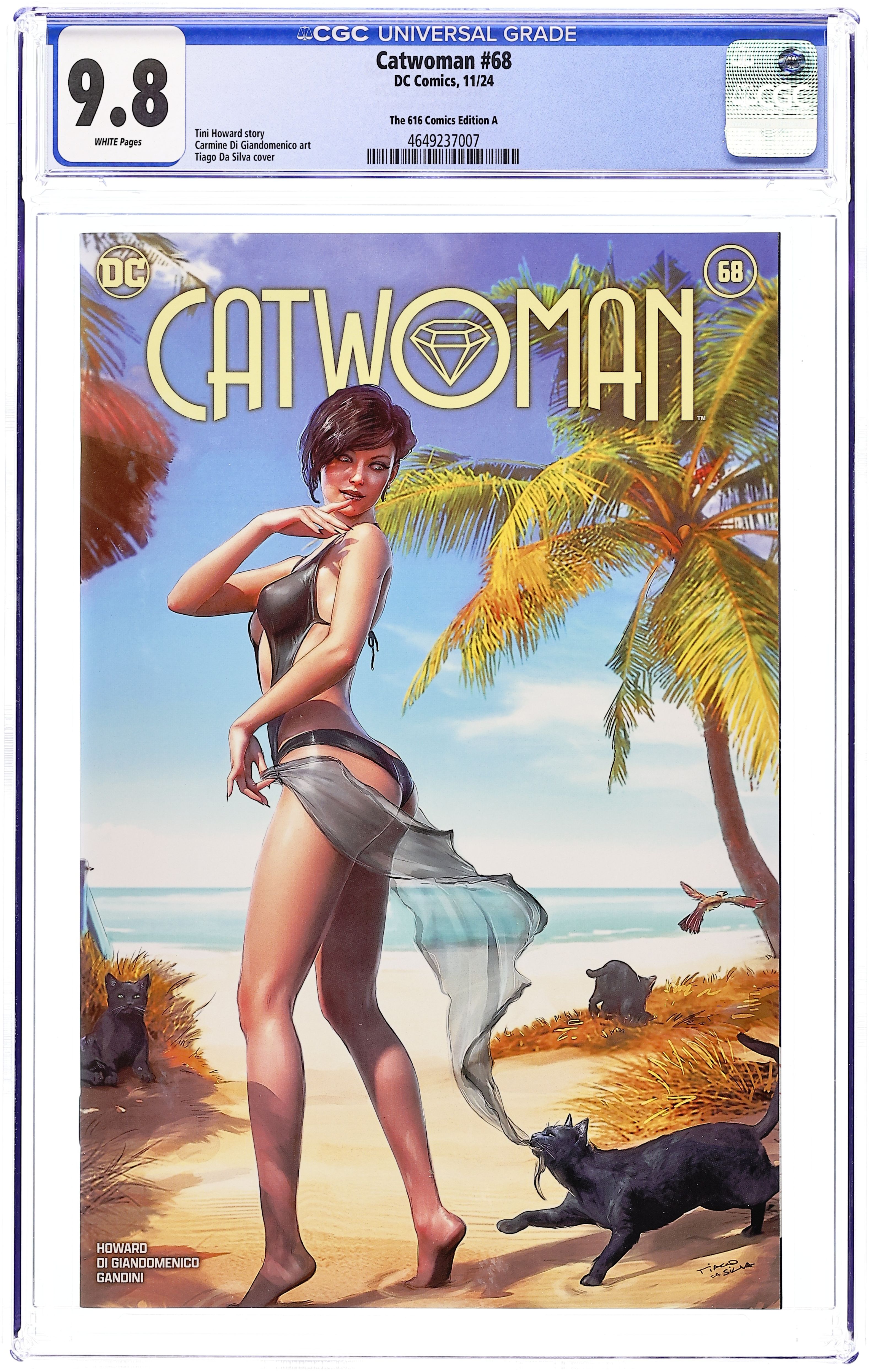 The 616 Comics Exclusive Foil Edition Virgin Cover by Tiago Da Silva. Written by Tini Howard. Art by Carmine Di Giandomenico. THE CAN'T-MISS FINALE TO TINI HOWARD'S RUN, DRAWN BY ALL-STAR CARMINE DI GIANDOMENICO! As the forces of the WHITE GLOVE prepare to put Gotham City in a stranglehold, Selina finds herself in need of emergency medical treatment from the steady hands of none other than HUSH. Will the Feline Fatale survive her procedure and live to protect her beloved precious city...or will she be reduced to fish food at the bottom of the Gotham City bay? 32 pages, full color. Rated T+
