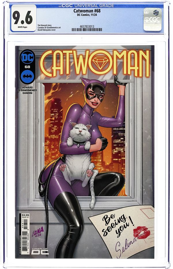 Starts Dec 15 Written by Tini Howard. Art by Carmine Di Giandomenico. Cover by David Nakayama. THE CAN'T-MISS FINALE TO TINI HOWARD'S RUN, DRAWN BY ALL-STAR CARMINE DI GIANDOMENICO! As the forces of the WHITE GLOVE prepare to put Gotham City in a stranglehold, Selina finds herself in need of emergency medical treatment from the steady hands of none other than HUSH. Will the Feline Fatale survive her procedure and live to protect her beloved precious city...or will she be reduced to fish food at the bottom of the Gotham City bay? 28 pages, full color. Rated T+ Cover price $3.99.