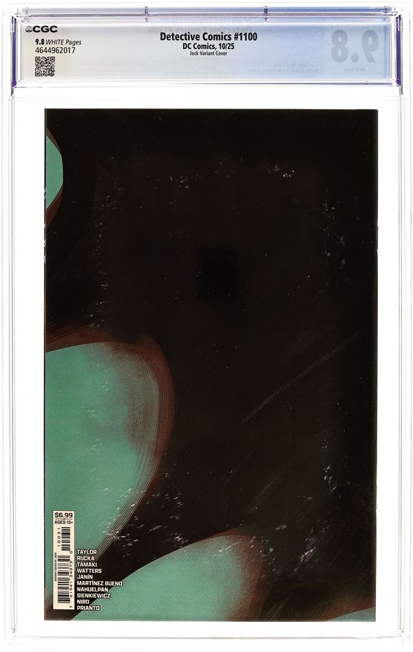 Written by Tom Taylor, Mariko Tamaki, Various. Art by Mikel Janin, Amancay Nahuelpan, Various. Cover by Jock. AN EPIC, STAR-STUDDED, OVERSIZE CELEBRATION 1,100 ISSUES IN THE MAKING! Written by Tom Taylor, Greg Rucka, Mariko Tamaki and Dan Watters Art by Mikel Janin, Alvaro Martinex Bueno, Amancay Nahuelpan and Bill Sienkiewicz In March 1937, a comic book was published that changed the world as we know it. Now, 1,099 issues later, some of comics' top talents have gathered to celebrate the comic that birthed a legend! Tom Taylor and Mikel Janin join forces once again to tell a heartfelt and action-packed story of Batman rescuing a young boy's best friend. Greg Rucka and Alvaro Martinez Bueno team up for a tale that asks the question: was Gotham better off before Batman? Mariko Tamaki reunites with Detective Comics collaborator Amancay Nahuelpan for a yarn that explores Bruce Wayne's world outside of the cowl and how his double life as Batman intersects with his alter ego's actions. Dan Watters and legendary artist Bill Sienkiewicz bring us a story that illustrates just how similar Batman's motivations are to the criminals he has sworn to fight and how he fights against his own darkness. 56 pages, full color. Rated T+ Cover price $6.99.