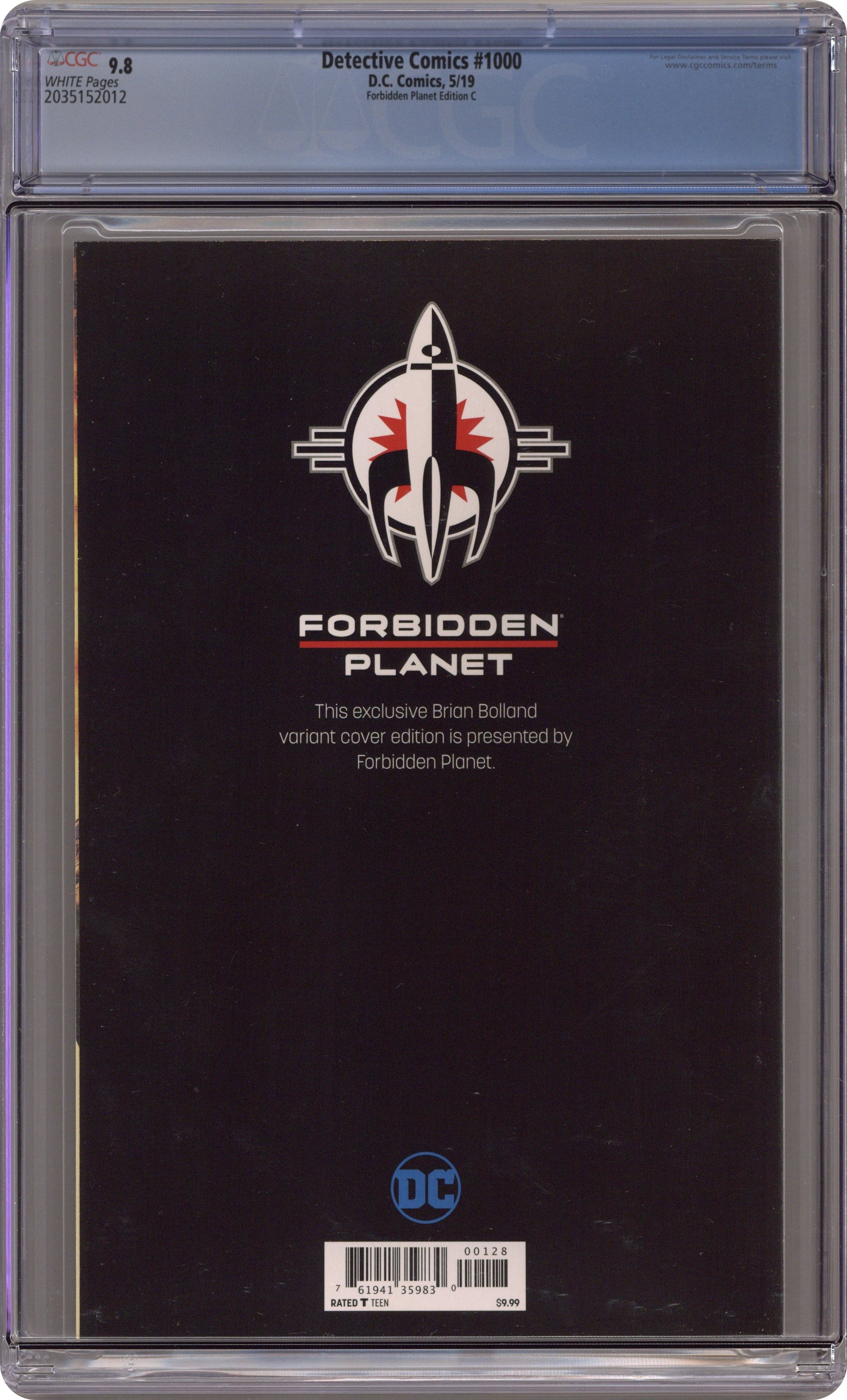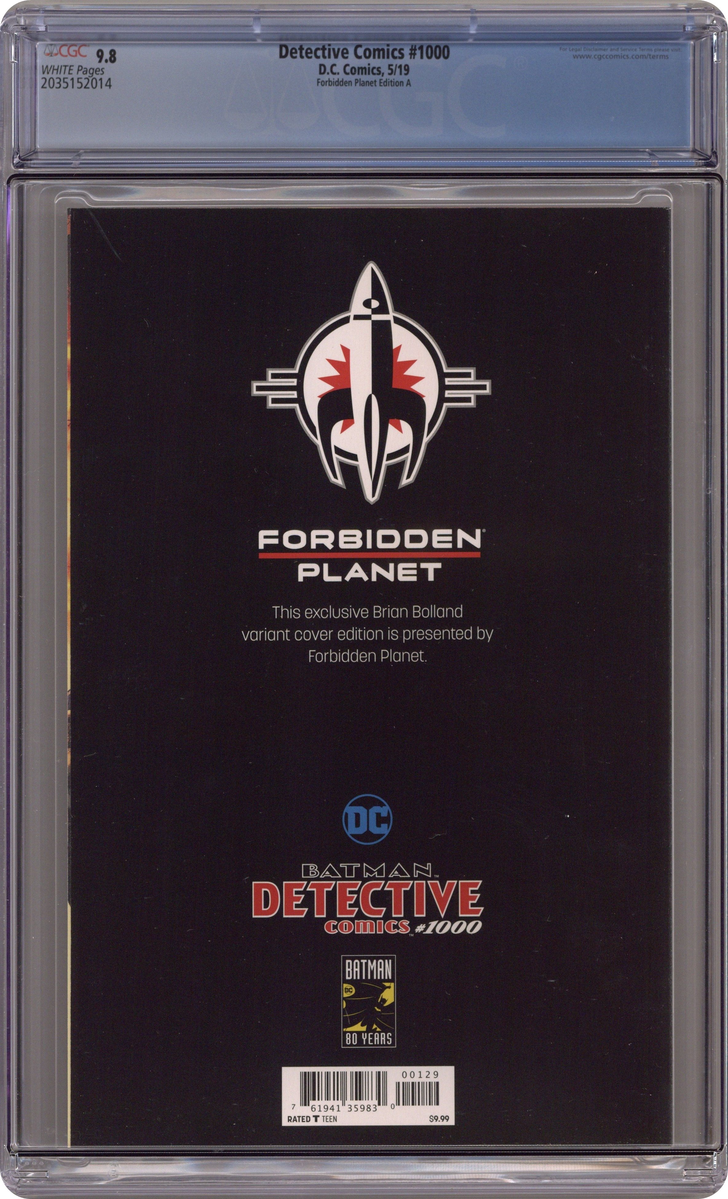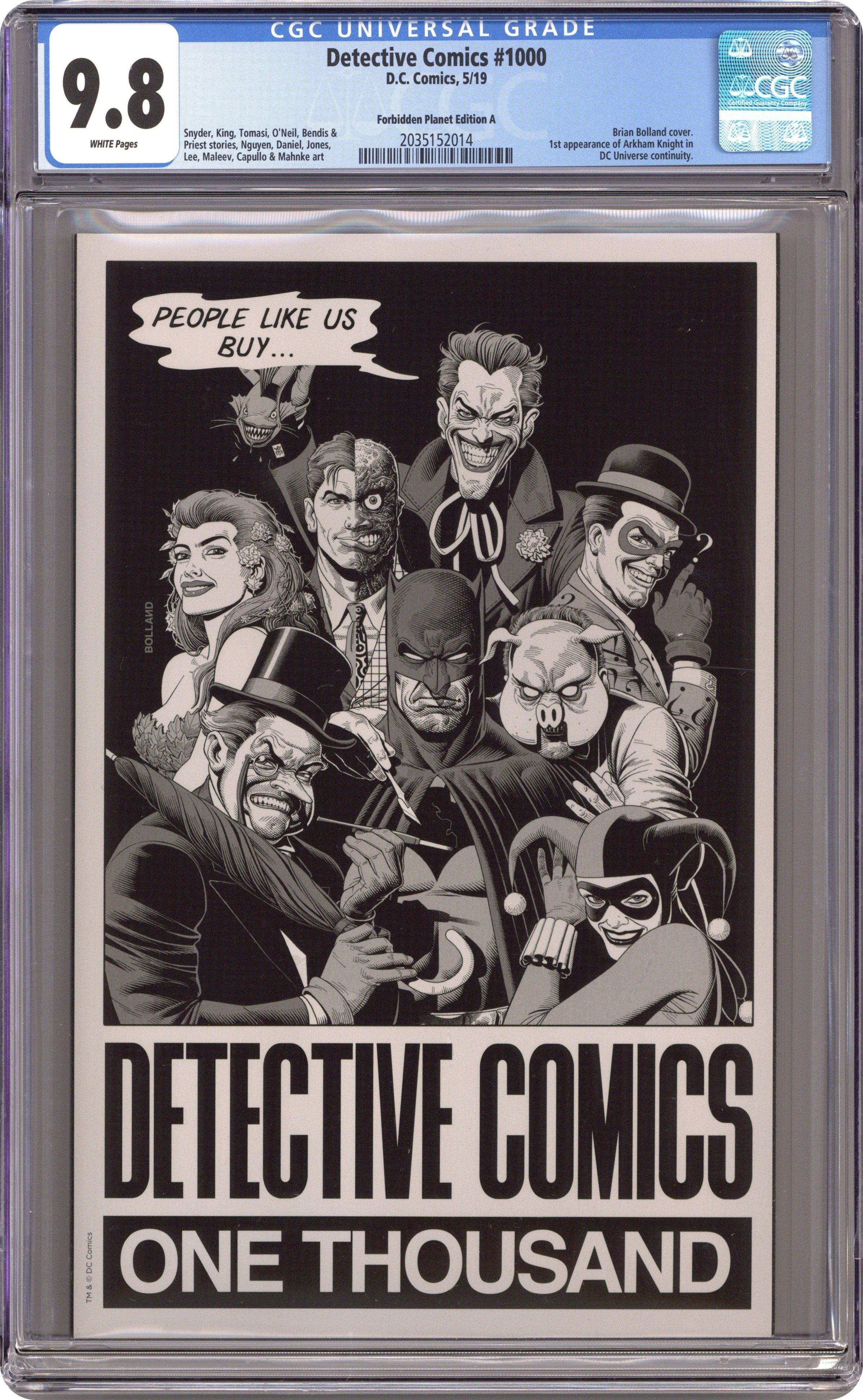 Forbidden Planet exclusive variant by Brian Bolland Written by Scott Snyder, Kevin Smith, Paul Dini, Warren Ellis, Denny O'Neil, Christopher Priest, Brian Michael Bendis, Geoff Johns, James Tynion IV, Tom King and Peter J. Tomasi. Art by Greg Capullo, Jim Lee, Dustin Nguyen, Becky Cloonan, Steve Epting, Neal Adams, Alex Maleev, Kelley Jones, Álvaro Martínez-Bueno, Tony S. Daniel, Joëlle Jones, Doug Mahnke, Jonathan Glapion, Scott Williams, Derek Fridolfs, Raul Fernandez and Jaime Mendoza. After 80 years, it's here -- the 1,000th issue of DETECTIVE COMICS, the title that literally defines DC! This 96-page issue is stacked with an unbelievable lineup of talent that will take you on a journey through Batman's past, present and future...plus a sensational epilogue that features the first-ever DC Universe appearance of the deadly Arkham Knight! But who is under the mask? And why do they want Batman dead? The incredible future of Batman adventures begins here! Featuring: "Batman's Longest Case" by Scott Snyder, Greg Capullo and Jonathan Glapion; "Manufacture for Use" by Kevin Smith, Jim Lee and Scott Williams; "The Legend of Knute Brody" by Paul Dini, Dustin Nguyen and Derek Fridolfs; "The Batman's Design" by Warren Ellis and Becky Cloonan; "Return to Crime Alley" by Denny O'Neil and Steve Epting; "Heretic" by Christopher Priest and Neal Adams; "I Know" by Brian Michael Bendis and Alex Maleev; "The Last Crime in Gotham" by Geoff Johns and Kelley Jones; "The Precedent" by James Tynion IV, Álvaro Martínez-Bueno and Raul Fernandez; "Batman's Greatest Case" by Tom King, Tony S. Daniel and Joëlle Jones; and the Arkham Knight in "Medieval" by Peter J. Tomasi, Doug Mahnke and Jaime Mendoza (continues next issue). Plus pin-ups by Mikel Janín, Jason Fabok and Amanda Conner. 96 pages, full color. Rated T