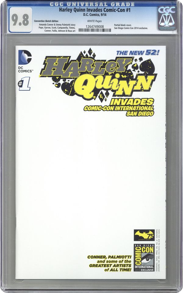 San Diego Comic Con Exclusive Blank Cover by Amanda Conner. Written by Amanda Conner and Jimmy Palmiotti. Art by Amanda Conner, Marco Failla, Javier Garron, Dave Johnson, Paul Pope, Stephane Roux, Damion Scott, Rob Campanella and John Timms. Cover by Amanda Conner. The title says it all! Our favorite little troublemaker, Harley Quinn, takes on Comic-Con International: San Diego in this over the top issue! She'll have to battle long lines, crazy crowds and the dread con crud, all in the quest to get her own comic book published! 48 pages, full color.