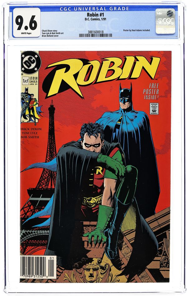 1st printing. Newsstand Edition. Tim Drake heads to Paris to study under the Tibetan Rahul Lama, then finds himself in a brawl with the Ghost Dragons gang in "Big Bad World." Script by Chuck Dixon, art by Tom Lyle and Bob Smith. Includes a poster of Robin by Neal Adams. Cover by Brian Bolland. See also Batman # 457. Cover price $1.00.