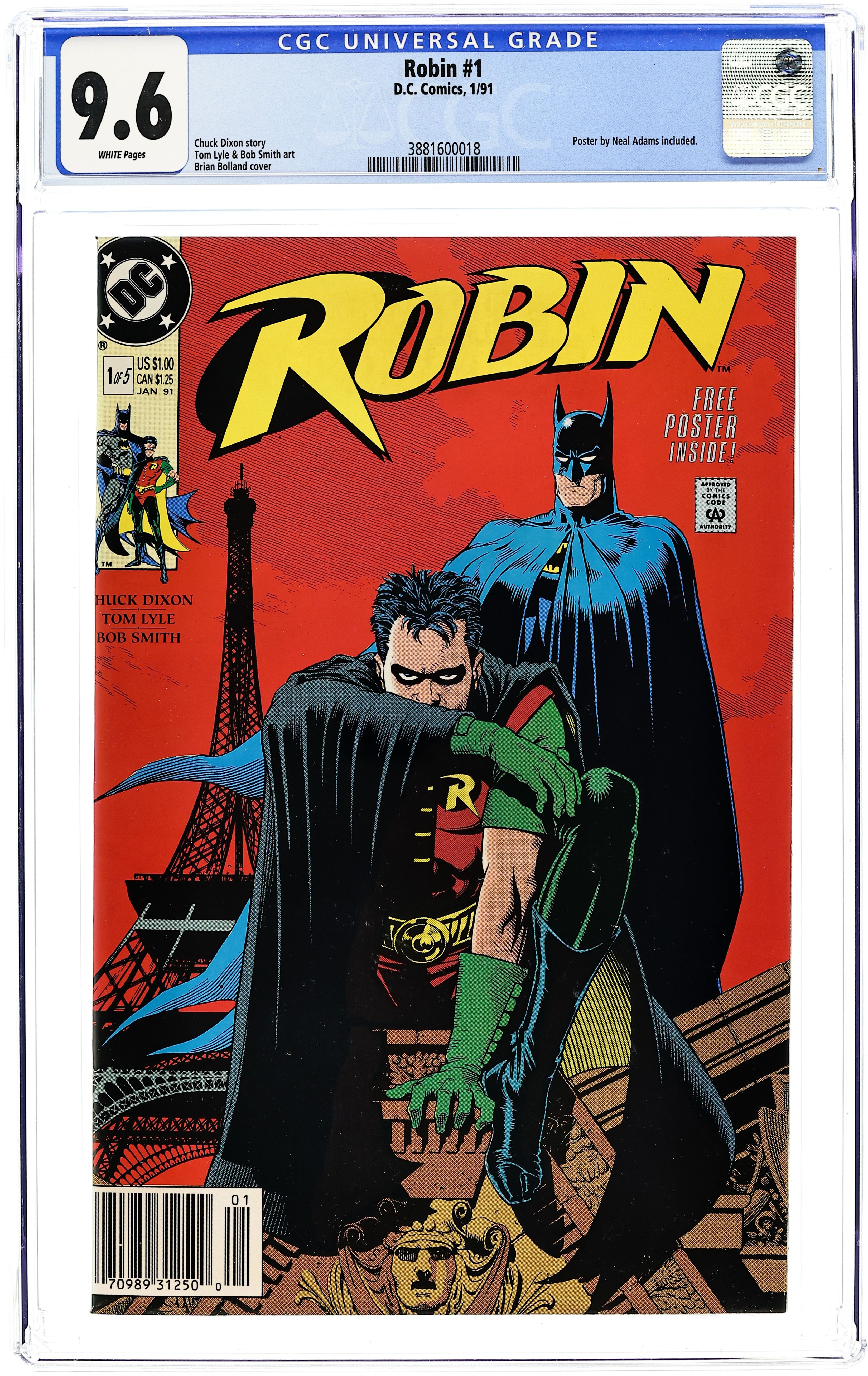 1st printing. Direct Edition. Tim Drake heads to Paris to study under the Tibetan Rahul Lama, then finds himself in a brawl with the Ghost Dragons gang in "Big Bad World." Script by Chuck Dixon, art by Tom Lyle and Bob Smith. Includes a poster of Robin by Neal Adams. Cover by Brian Bolland. See also Batman # 457. Cover price $1.00.