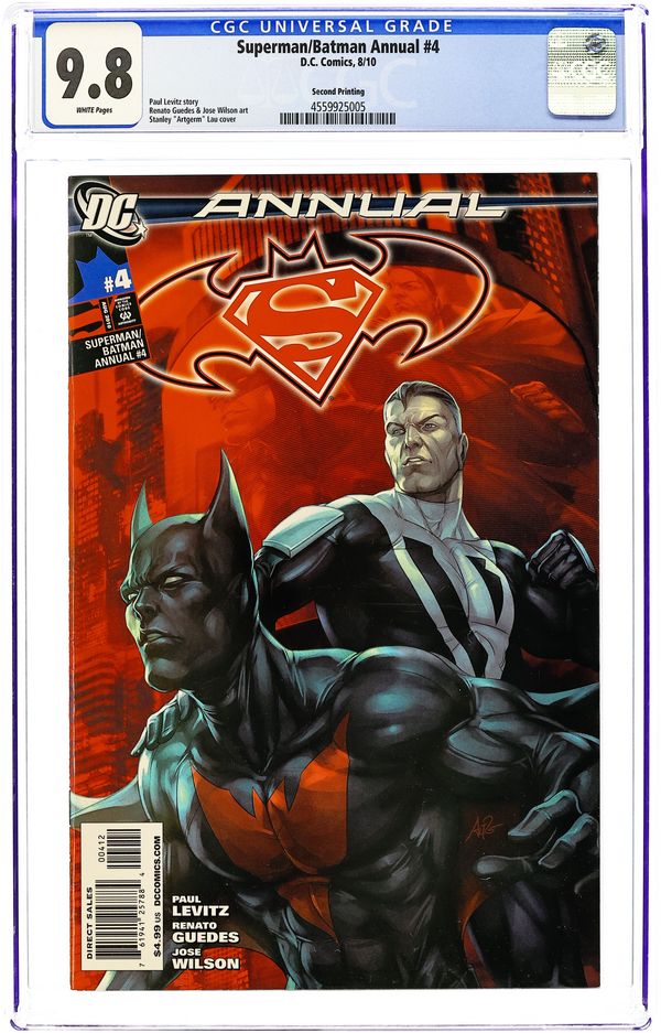 SECOND PRINTING Variant Cover by STANLEY 'ARTGERM' LAU. Written by PAUL LEVITZ Art by RENATO GUEDES and JOSE WILSON. Expanding on the hit TV show Batman Beyond, this year's annual travels to the not-so-distant future where an aged Bruce Wayne oversees a new Batman, and the fate of a certain Man of Steel is very much in question. Metropolis is becoming crime-free, as someone is ridding the city of its criminal element permanently. Now, Terry McGinnis must uncover what's happening in Superman's home and face a very old and vindictive nemesis! Cover price $4.99.