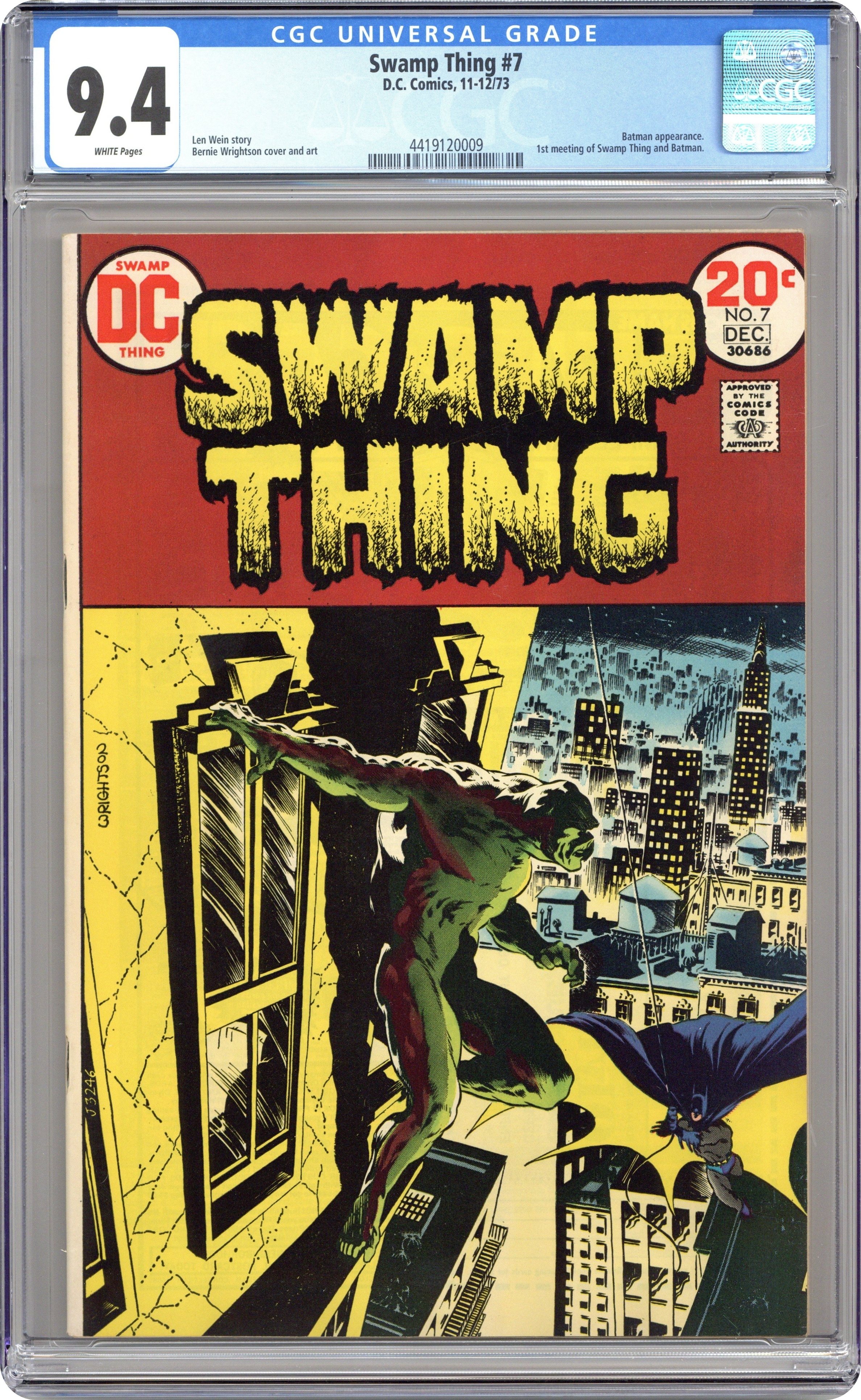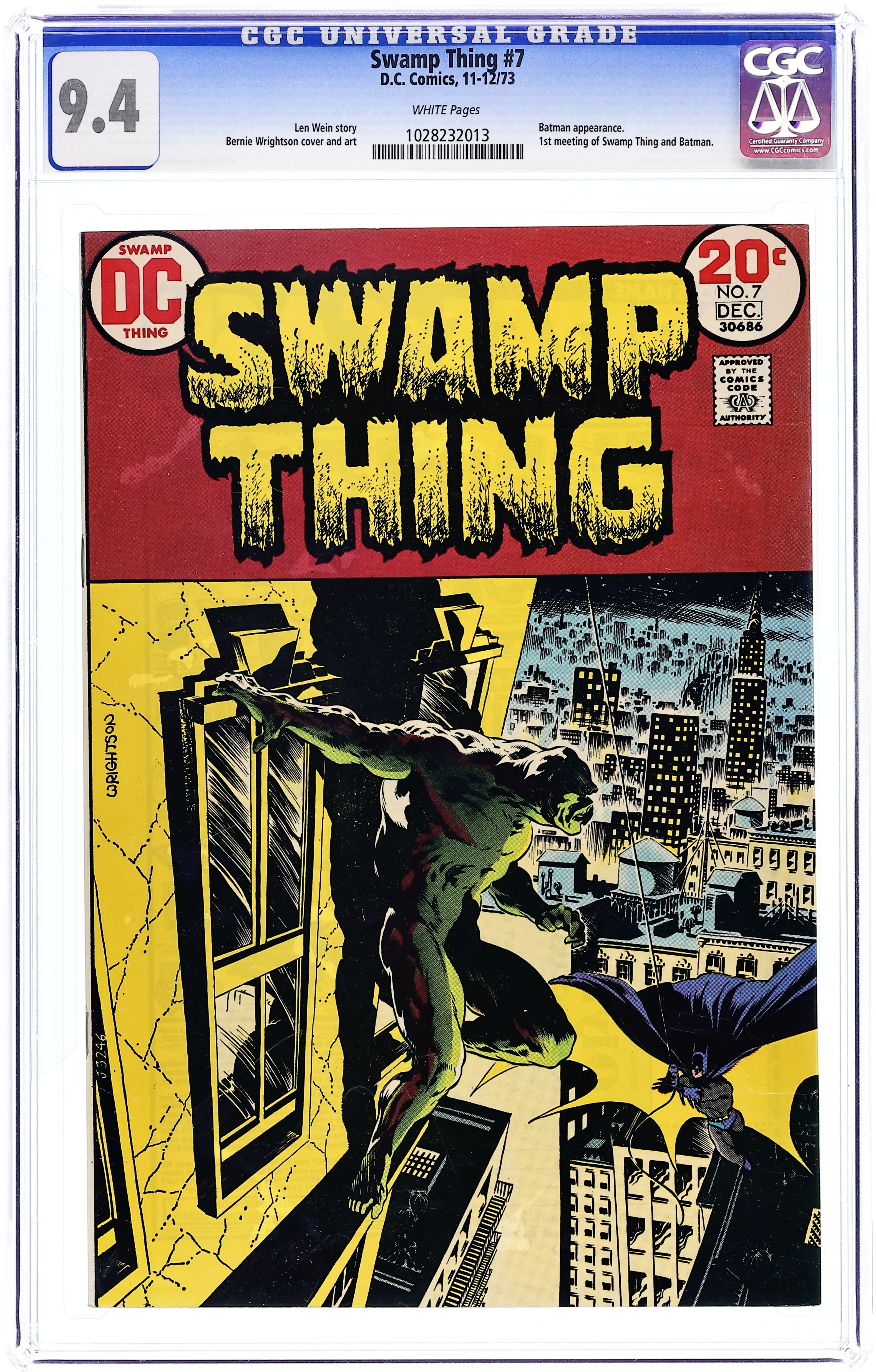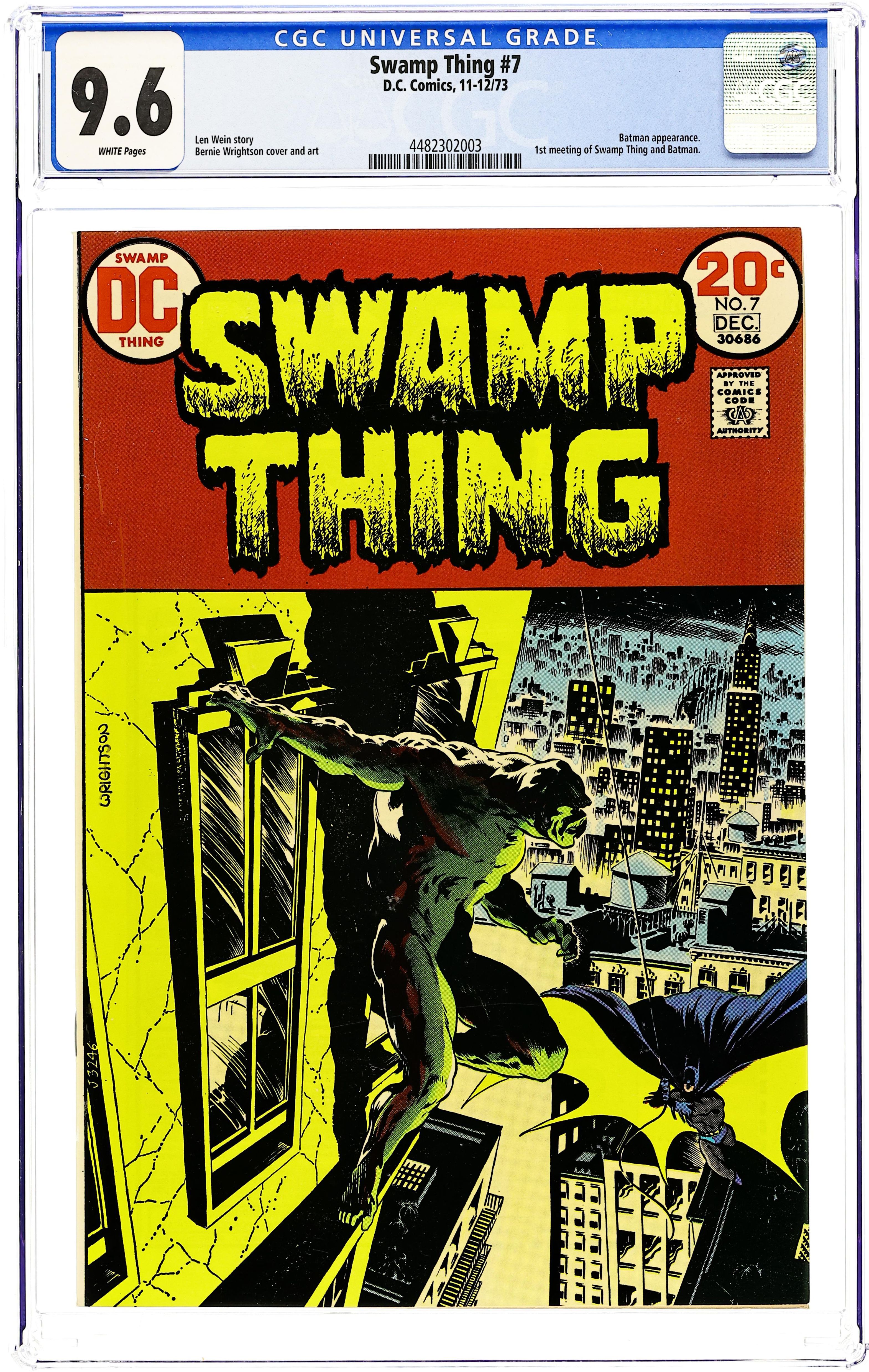 "Night of the Bat." Swamp Thing goes to Gotham City and encounters Batman. Both are after Mr. E, who is leader of the Conclave. Script by Len Wein, art and cover by Berni Wrightson. Cover price $0.20.