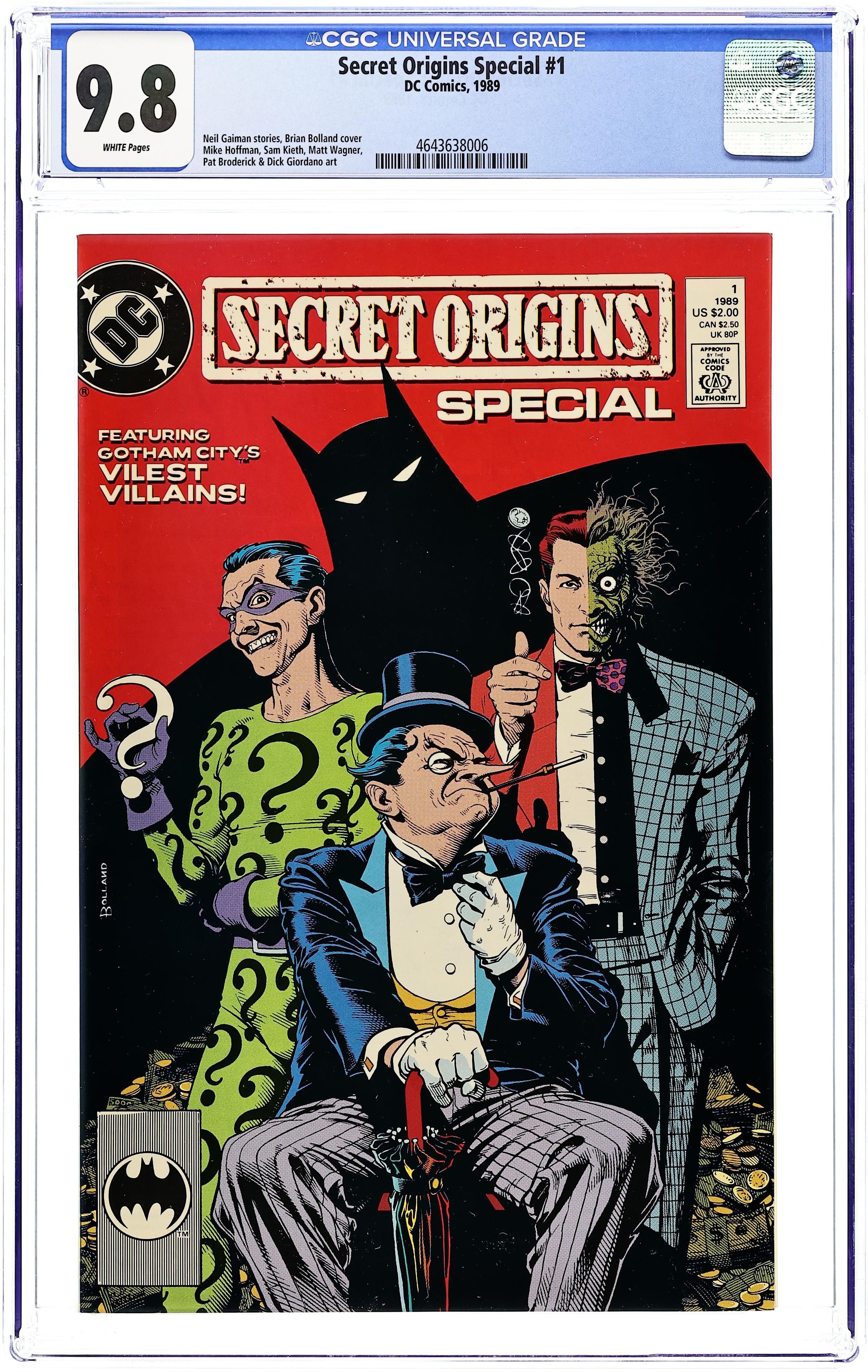 A look at the secret origins of Penguin, the Riddler and Two-Face. Framing sequence is the making of a 'Steve Jones Investigates' special, taking a look at the costumed criminals of Gotham, in "Original Sins." Script by Neil Gaiman, art by Mike Hoffman & Kevin Nowlan. Origins: Penguin in "The Killing Peck." Script by Alan Grant, art by Sam Kieth; the Riddler in "When is a Door." Script by Neil Gaiman, art by Bernie Mireault & Matt Wagner; Two-Face in an untitled tale. Script by Mark Verheiden, art by Pat Broderick & Dick Giordano. Cover by Brian Bolland. Cover price $2.00.