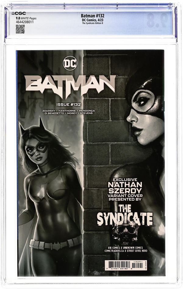 The Syndicate (The 616 Comics, Unknown Comics, Comic Traders, and Street Level Hero) exclusive Batgirl Virgin Cover by Nathan Szerdy. Written by Chip Zdarsky. Art by Mike Hawthorne, Adriano Di Benedetto. The mean streets of Gotham City have gotten meaner as the likes of Harvey Dent and Killer Croc roam free, brutalizing the population. Where is Batman and why hasn't he responded to the cries of a city in peril?! Can Bruce Wayne find the answers before the mysterious Red Mask captures him? And in the backup story, Tim Drake's hunt for Batman continues. Will Metropolis's newest Superman, Jon Kent, be able to help the Boy Wonder with this Multiversal mystery, or will they both run afoul of an overpowered Toyman?! 40 pages, full color. T+