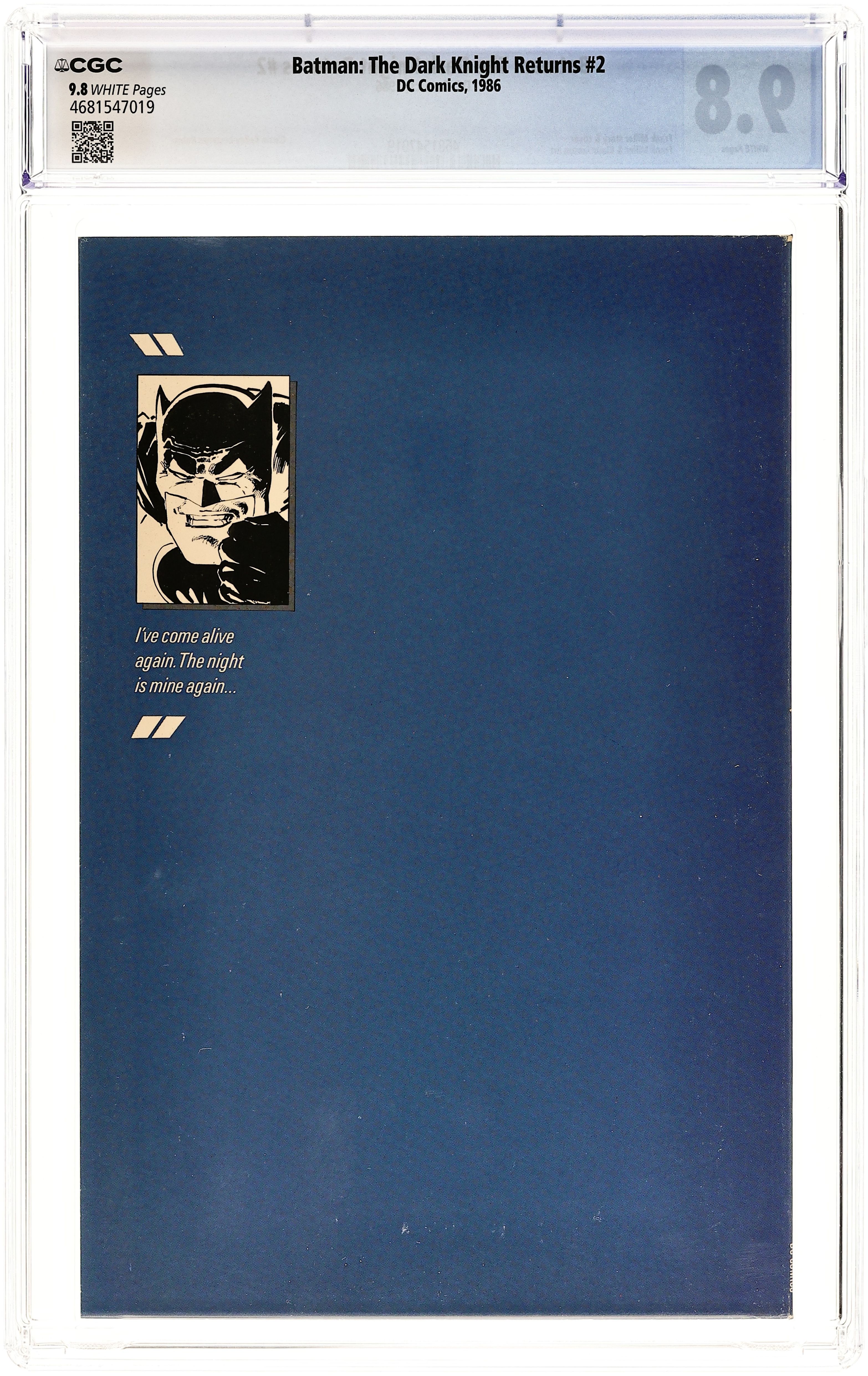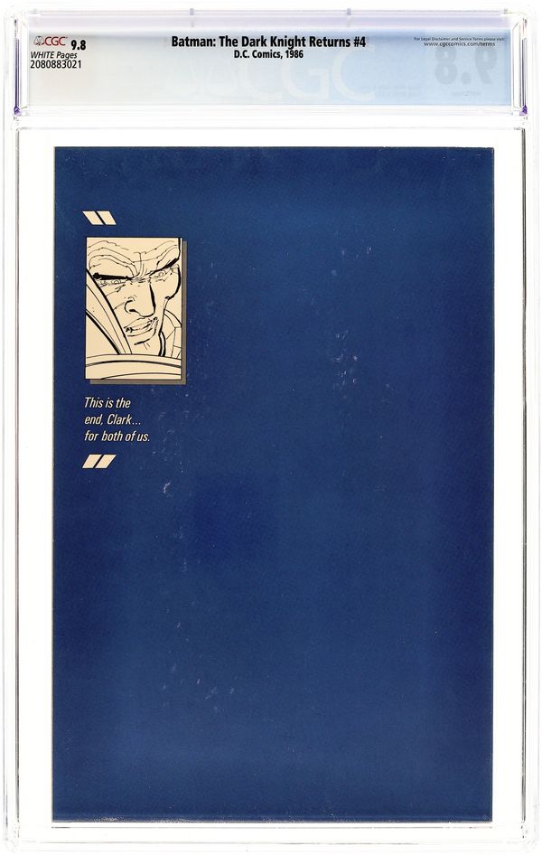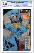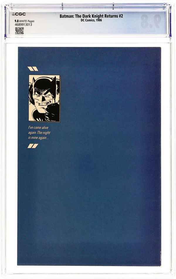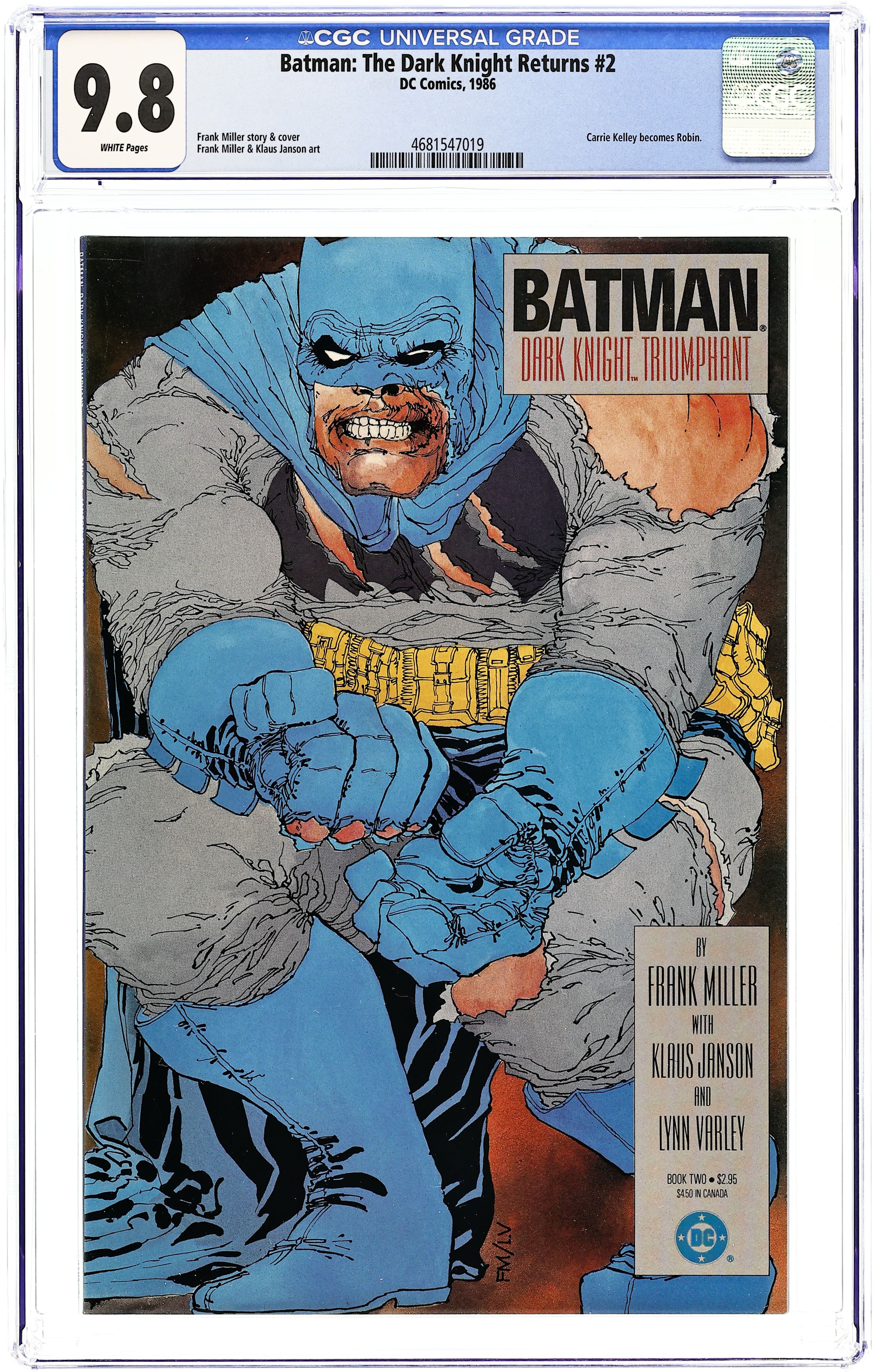 First printing. Direct Edition. NOTE: 1st printing has almost matching grey background on inside front cover and facing page. 2nd printing doesn't have matching gray background--grays are very different. 3rd printings are labeled as such. Cover by Frank Miller. "Dark Knight Triumphant," script by Frank Miller, pencils by Frank Miller, inks by Klaus Janson; an aging Batman battles the Mutant gang and their anonymous leader; While walking to work, considering retirement, Jim Gordon is almost killed by a 17-year old boy with an M60; Carrie Kelly, a young girl who owes her life to Batman, seeks out her hero and becomes Robin. 52 pgs., full color. Cover price $2.95.