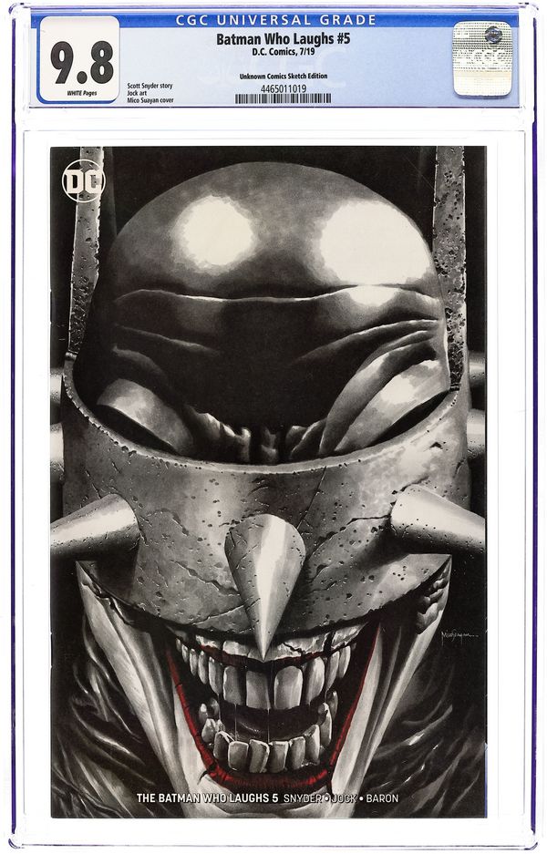 Unknown Comics Virgin Cover by Mico Suayan and David Baron. Written by Scott Snyder. Art by Jock. Left rattled by the events of DARK NIGHTS: METAL, Bruce Wayne must come face to face with the nightmares spawned from the Dark Multiverse. But even though evil devoured evil in the collapse of Challengers Mountain, the Dark Knight still has his doubts. He discovers that the Batman Who Laughs not only survived the fight with The Joker at the end of METAL, but now he is enacting a sinister plan across the Multiverse-something both terrifying and oddly familiar. But when Bruce Wayne realizes the only way to stop this madman is to kill him, he must consider violating the very rule Batman won't break…the same rule that created this insatiable villain-the Batman Who Laughs! 32 pages, full color. Rated T+