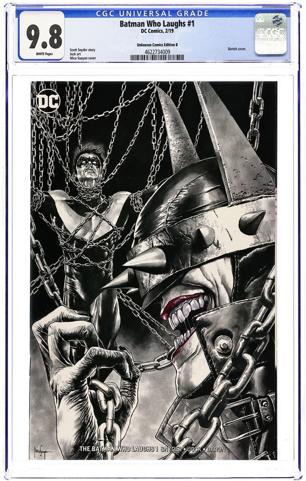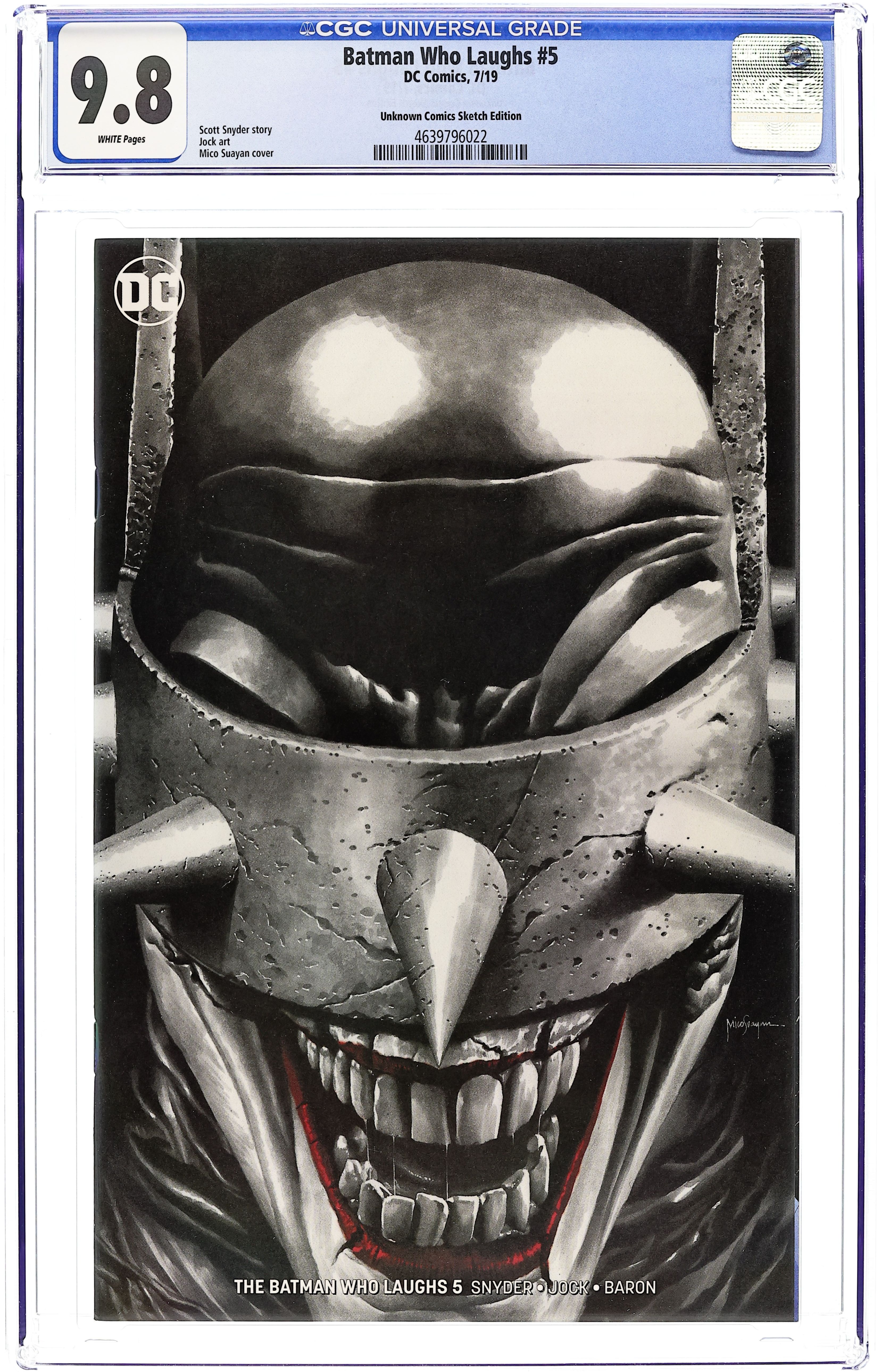 Unknown Comics Exclusive Virgin Cover by Mico Suayan and David Baron. Written by Scott Snyder. Art by Jock. Left rattled by the events of DARK NIGHTS: METAL, Bruce Wayne must come face to face with the nightmares spawned from the Dark Multiverse. But even though evil devoured evil in the collapse of Challengers Mountain, the Dark Knight still has his doubts. He discovers that the Batman Who Laughs not only survived the fight with The Joker at the end of METAL, but now he is enacting a sinister plan across the Multiverse-something both terrifying and oddly familiar. But when Bruce Wayne realizes the only way to stop this madman is to kill him, he must consider violating the very rule Batman won't break…the same rule that created this insatiable villain-the Batman Who Laughs! 32 pages, full color. Rated T+