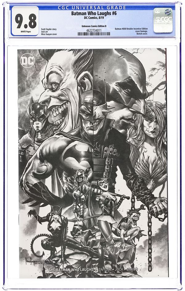 Unknown Comics Exclusive B&W Minimal Trade Dress Variant Cover by Mico Suayan. Written by Scott Snyder. Art by Jock. True happiness begins in the heart. Our memories and emotions can play tricks on us, though, and divert one's reality into something completely different. The Batman Who Laughs has based his entire worldview on this very concept, and it is in this moment that he must finally confront the one man who stands in his way, the one man who could complete or halt his plan…the last Bruce Wayne. It is here, on the home turf of Wayne Manor, that Bruce relives the happiest moment of his life-the moment he became the Batman Who Laughs. Will Batman be able to outthink the Dark Multiverse version of himself and stop his most sinister end? Or will the original Dark Knight succumb fully and let go of his morality? While good almost always wins, this issue is the start of something more…setting up a larger plan based in the ultimate betrayal of infection, loyalty and true happiness. This is not the end…it's only the beginning. 32 pages, full color. RATED T+