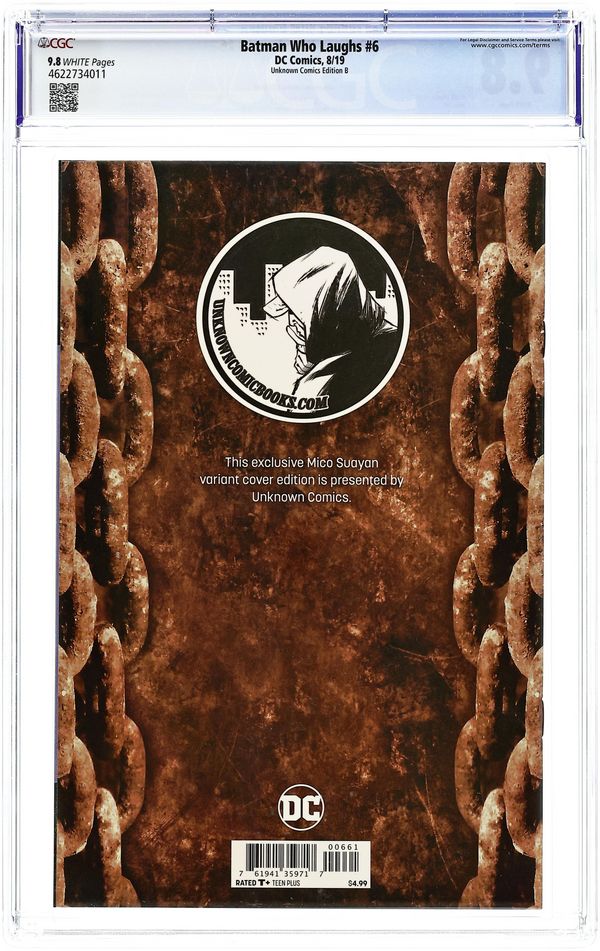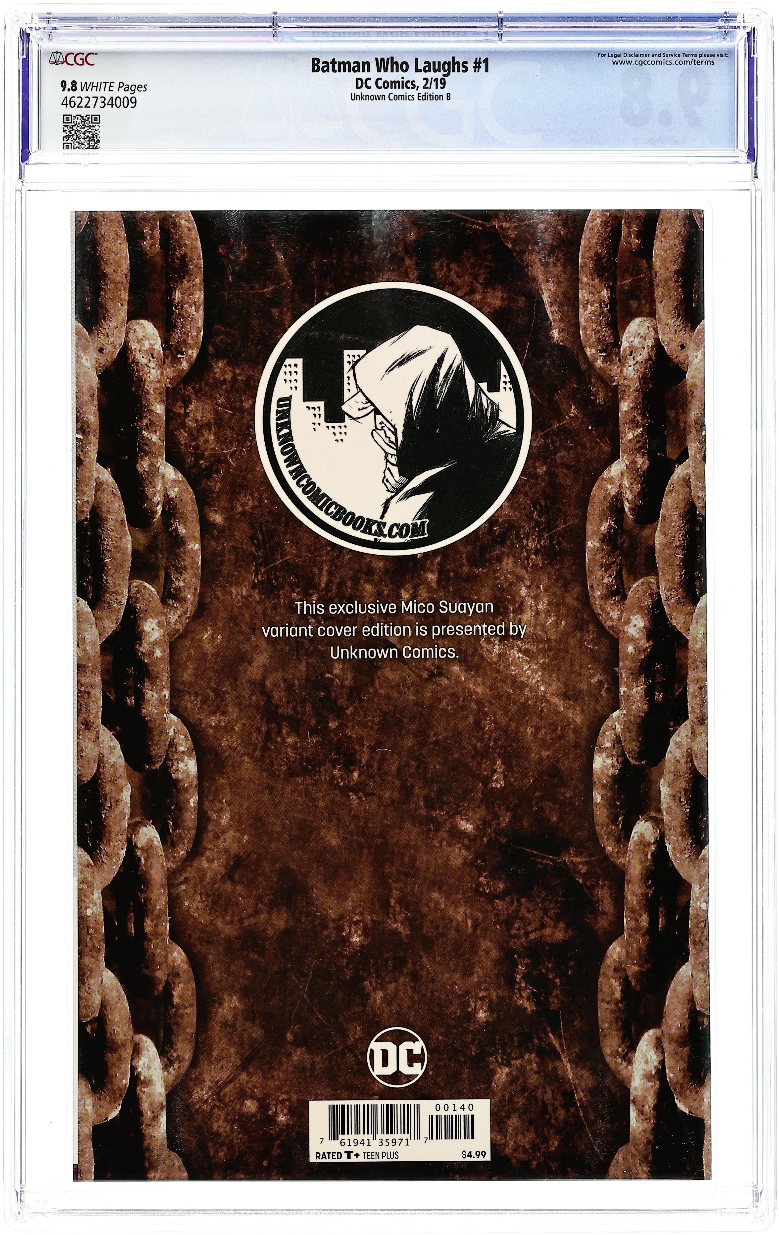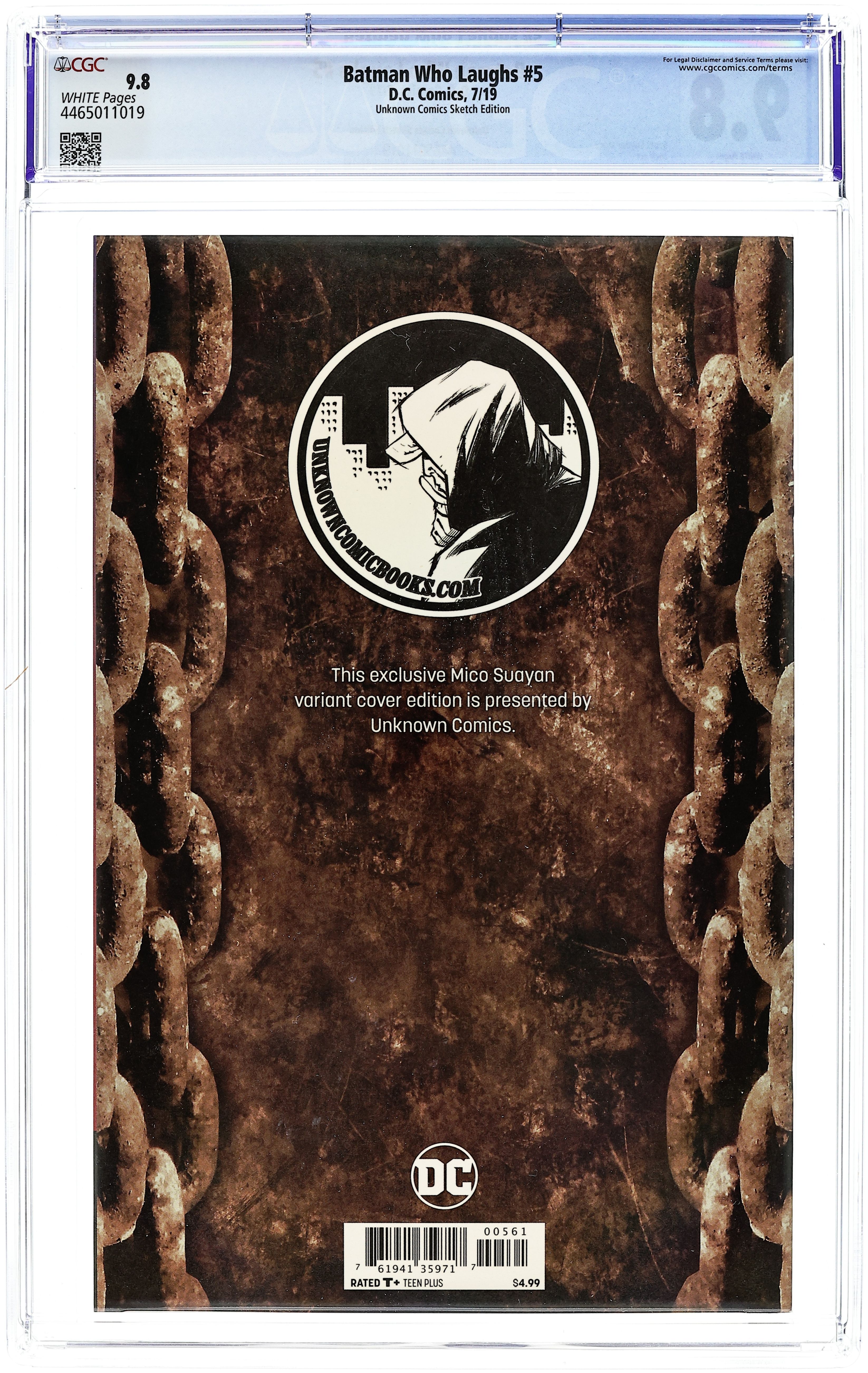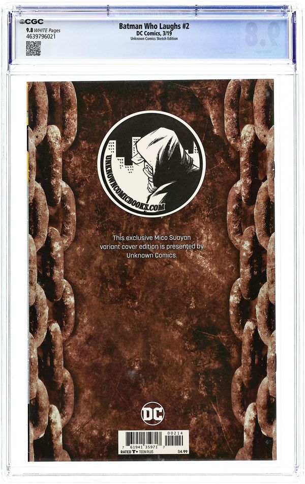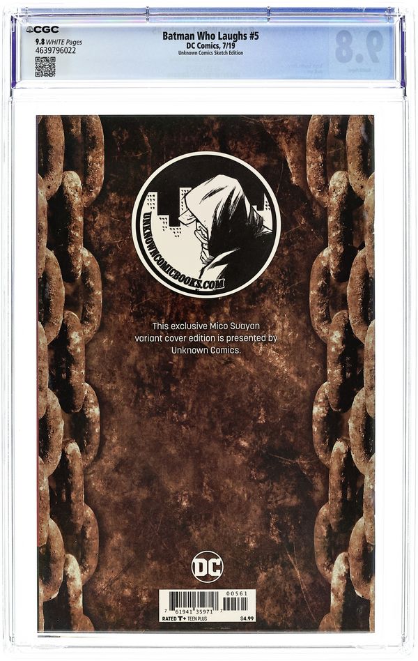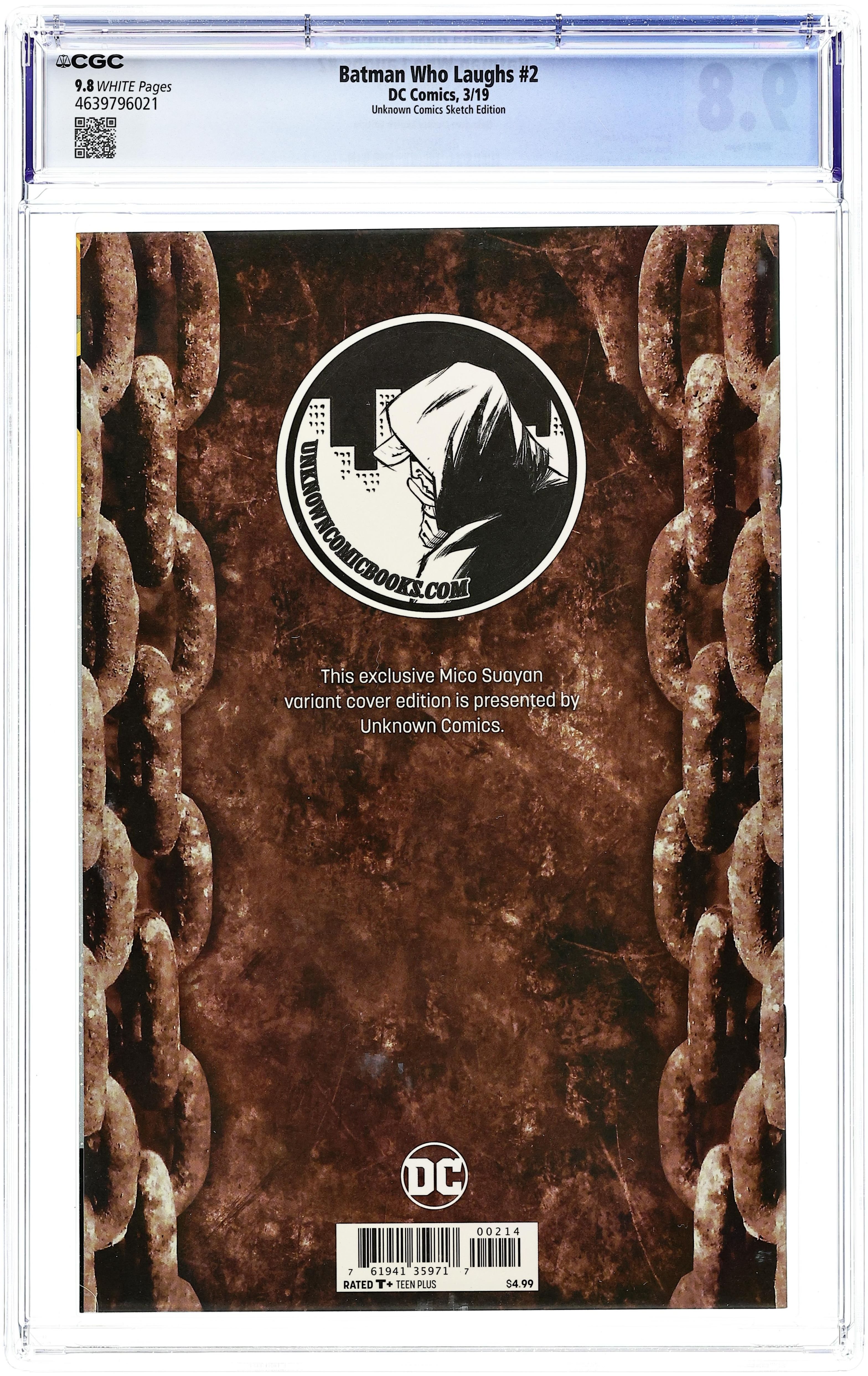 Unknown Comics exclusive variant by Mico Suayan. Written by Scott Snyder. Art by Jock. After the shocking ending of issue #1, a ticking clock sets Batman on a trail throughout the different realities of the Multiverse. He starts to see all the iterations of his life, and what could have been…but more importantly, Bruce Wayne begins to deduce that his current life is somehow wrong, and that all the mistakes he's made are somehow connected. Meanwhile, the Batman Who Laughs raises the curtain on his second act, pulling out the big guns to break into Arkham Asylum… enter one of the most punishing Batmen of the Dark Multiverse: the Grim Knight! 32 pages, full color. Rated T+