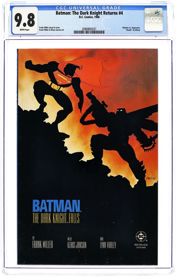 1st printing. NOTE: 2nd printing of #3 is clearly labeled as such on the inside cover. "Hunt The Dark Knight," script and pencils by Frank Miller, inks by Klaus Janson and Frank Miller; Batman battles the Joker, who has convinced his psychiatrist, Dr. Bartholomew Wolper, that he is sane and regretful; Seeking to discredit Batman, Wolper exhibits the Joker on a late-night show ("David Endochrine", parodying Late Night with David Letterman) to try and show that the Joker is actually a victim of Batman's own psychosis; As the police attack Batman, the Joker murders everyone in the studio; Batman follows him to Selina Kyle's place, where the former Catwoman has become a depressed alcoholic; Superman is introduced as an undercover agent for the American government. 52 pgs., full color. Cover price $2.95.