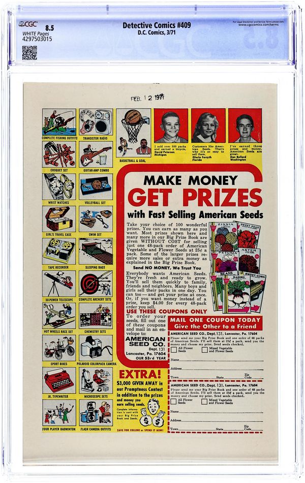 Starts Dec 8 52-page giant issue. Cover pencils by Neal Adams, inks by Dick Giordano. "Challenge of the Consumer Crusader," script by Frank Robbins, pencils by Bob Brown, inks by Dick Giordano; Batman helps save a consumer advocate from murder and discovers the extortionist who is shielding herself behind his front. "Death Shares the Spotlight!", script by Frank Robbins, art by Don Heck; Continuing from last issue, when taken out on a date by Jason Bard to see the play "Invitation to Murder," the couple soon finds themselves entangled in an attempted murder of Hollywood's "Royal Couple" Robbie and Tiz Marlow; Leaving Jason behind to guard the starlets, Babs goes off to call the police. "The Forbidden Trick!", script by Bill Woolfolk, art by Leonard Starr, story originally printed in Detective Comics #211. "The Case of the Finders Keepers," art by John Prentice, story originally printed in Gangbusters #54. Letter to the editor from Mike W. Barr. Ancient Crime-Detection Methods! fact page. 52 pgs., full color. $0.25. Cover price $0.25.