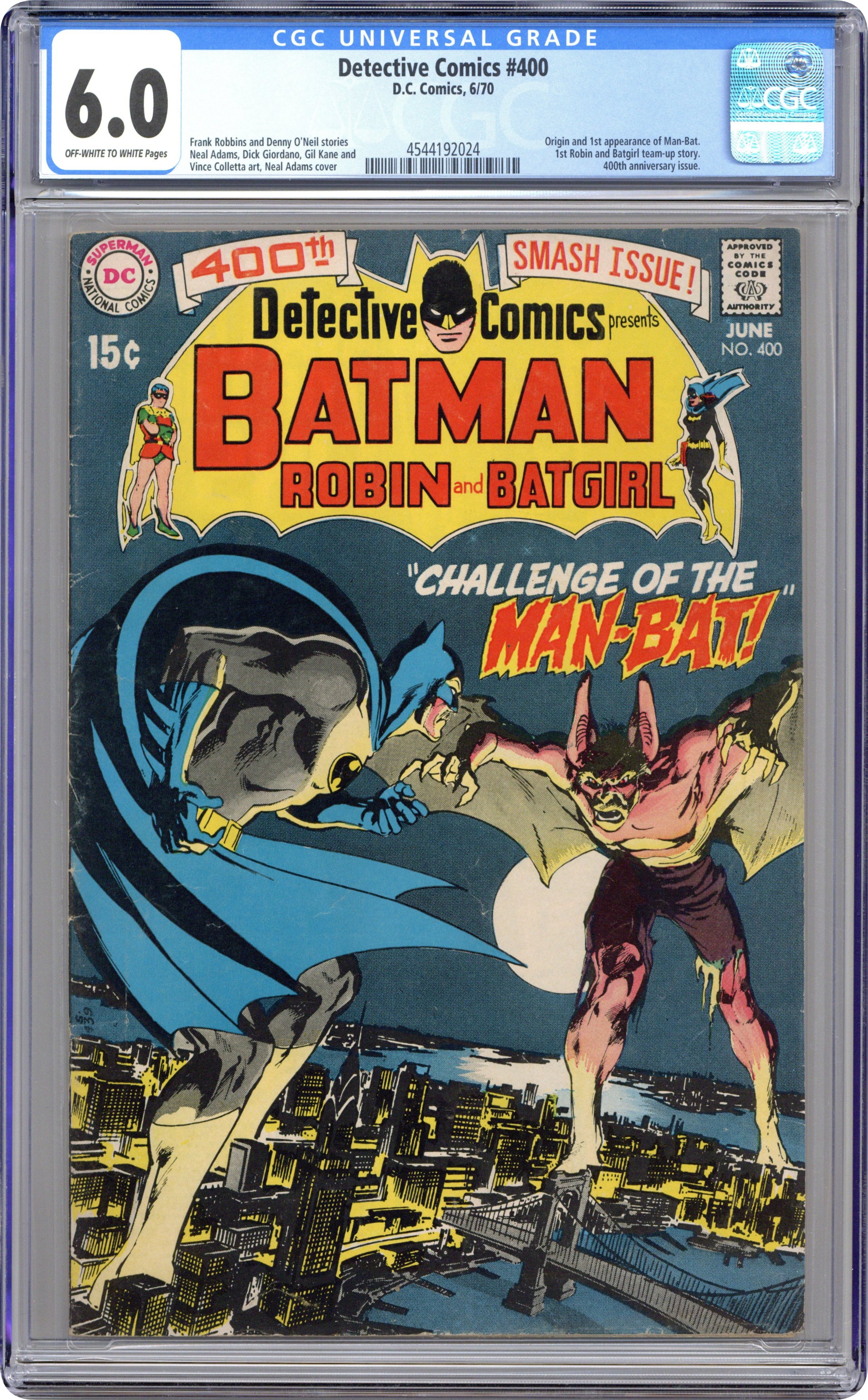 Cover by Neal Adams. Milestone issue featuring 1st appearance of Man-Bat in "Challenge of the Man-Bat!", script by Frank Robbins, pencils by Neal Adams, inks by Dick Giordano; Zoologist Kirk Langstrom is working late at the Gotham Natural History Museum putting together a bat habitat; he aims to perfect a serum that can endow people with enhanced auditory abilities via a specialized bat gland extract; Elsewhere in the city, a group of thieves known as the Blackout Gang break into a vault; Back at the museum, Kirk Langstrom is pleased with his progress and decides to test his new formula upon himself; he mutates into Man-Bat. "A Burial for Batgirl!," script by Denny O'Neil, pencils by Gil Kane, inks by Vince Colletta; Barbara Gordon has come to Hudson University to help with a Edgar Allen Poe festival; She discovers a murder and captures Hank Osher, who appears to be the murderer; Batgirl begins to believe that Hank has been framed and investigates further, which leads to her being captured and bricked into a wall. Letter to the editor from writer Alan Brennert. 36 pgs., full color. $0.15. Cover price $0.15.