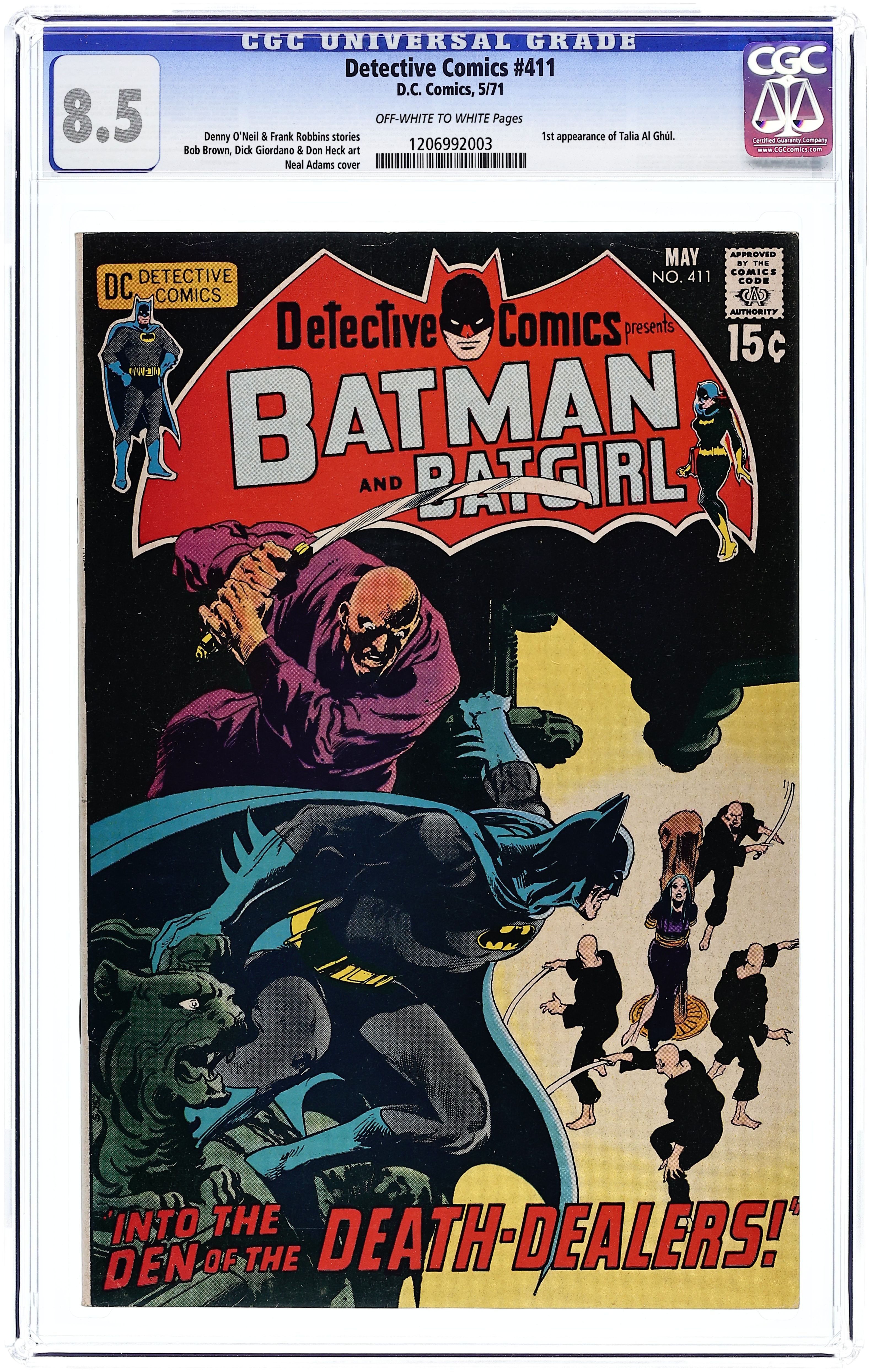 Cover by Neal Adams. Ra's Al Ghul and the first appearance of his daughter, Talia, in "Into the Den of the Death-Dealers!," script by Denny O'Neil, pencils by Bob Brown, inks by Dick Giordano; Batman scales the side of Gotham's Statue of Freedom for a secret meeting with an informant inside the torch; The informant wants police protection in exchange for turning over evidence on Doctor Darrk and the League of Assassins; Before the criminal can reveal anything however, an assassin sneaks into the chamber and stabs him from behind. "Cut... and Run!," script by Frank Robbins, pencils by Don Heck, inks by Dick Giordano; Continuing from last issue, Batgirl has stumbled upon criminal activity involving the latest fashion sensation of the worlds greatest fashion model Mamie Archeson, a discovery that has her strapped onto a fabric cutter by the crook known as Serpy. Letter of comment from letter hack Guy Lillian. 36 pgs., full color. $0.15. Cover price $0.15.