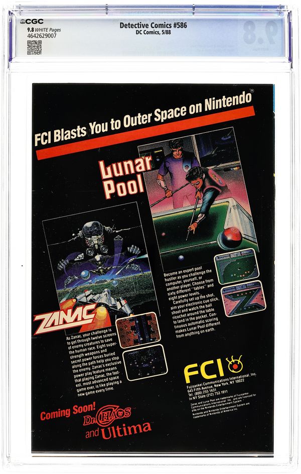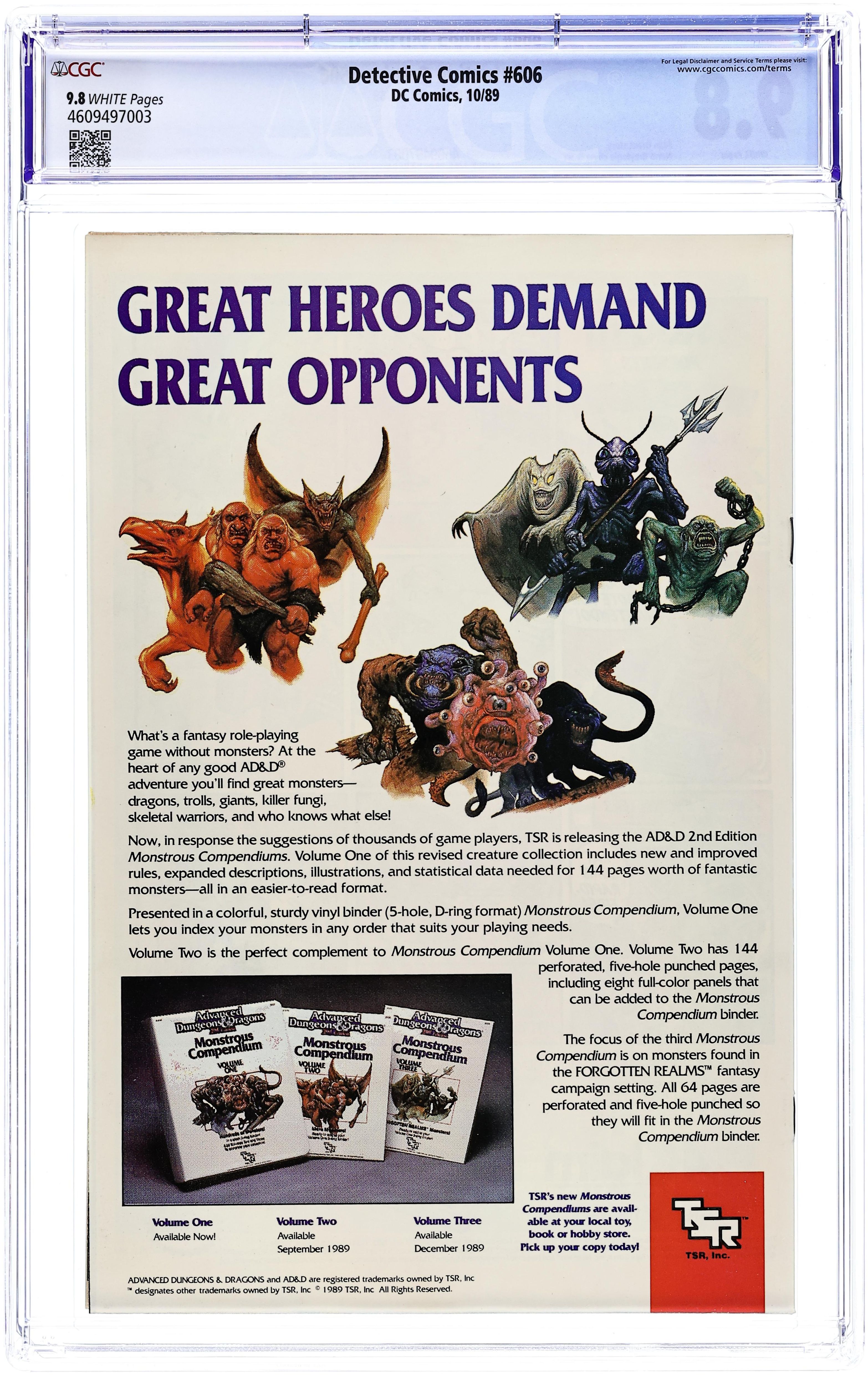 80-pg anniversary issue celebrating Batman's 600th appearance in Detective Comics. Includes a reprint of "The Case of the Chemical Syndicate" from Detective Comics #27 (Batman's first appearance) by Bob Kane & Bill Finger. The rest of the comic features 3 other versions of the same plot, to demonstrate how the Dark Knight has both changed and remained constant. The first of the 3 is "The Cry of Night is - - 'Kill!'" from Detective Comics #387 by Mike Friedrich, Bob Brown & Joe Giella, commissioned in 1969 to commemorate the 30th Anniversary of Batman's debut. The remaining 2 tales are brand new: "The Case of the Chemical Syndicate" by Marv Wolfman, Jim Aparo & Mike DeCarlo, and "The Case of the Chemical Syndicate" by Alan Grant, Norm Breyfogle & Steve Mitchell. Cover by Norm Breyfogle. 84 pgs. Cover price $2.95.