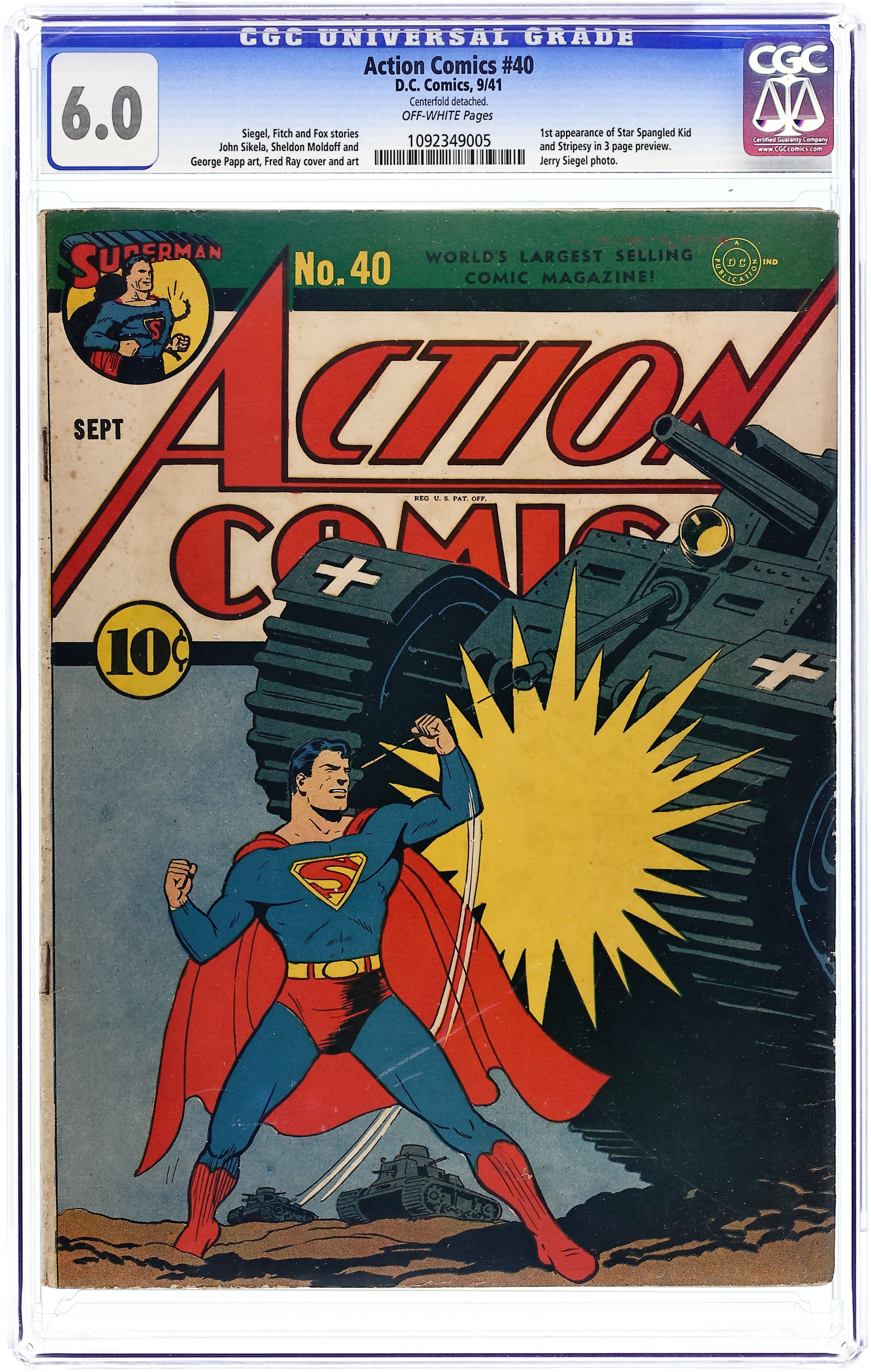 Cover art by Fred Guardineer. Superman story, script by Jerry Siegel (as Jerome Siegel), art by Joe Shuster. Scoop Scanlon, Five Star Reporter story, art by Will Ely. Pep Morgan story, script by Gardner F. Fox, art by Fred Guardineer (as Gene Baxter). Adventures of Marco Polo story, art by Sven Elven. Tex Thomson story, art by Bernard Baily. Chuck Dawson story, art by Homer Fleming. The Mad Lama starring Zatara Master Magician, script by Gardner F. Fox, art by Fred Guardineer. Candid Comic Camera one-pager, art by Bob Kane. 68 Pages, Full Color. $.10 Cover price $0.10.
