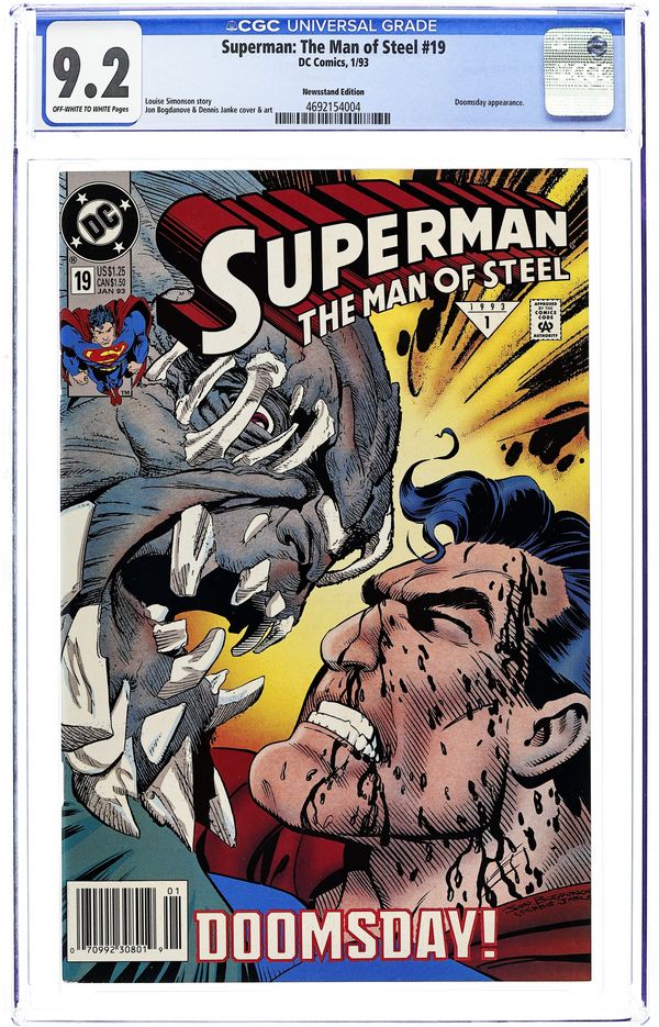 First Printing. Newsstand Edition. Written by Louise Simonson, with art and cover by Jon Bogdanove and Dennis Janke. Part 6 of the critical 7-part series 'Doomsday' that leads to a pivotal event in the life of the Man of Steel, continued from Action Comics (1938 DC) #684. The fight to the death intensifies as Doomsday and Superman hit Metropolis - hard! Concludes in Superman (1987) #75. Cover price $1.25.