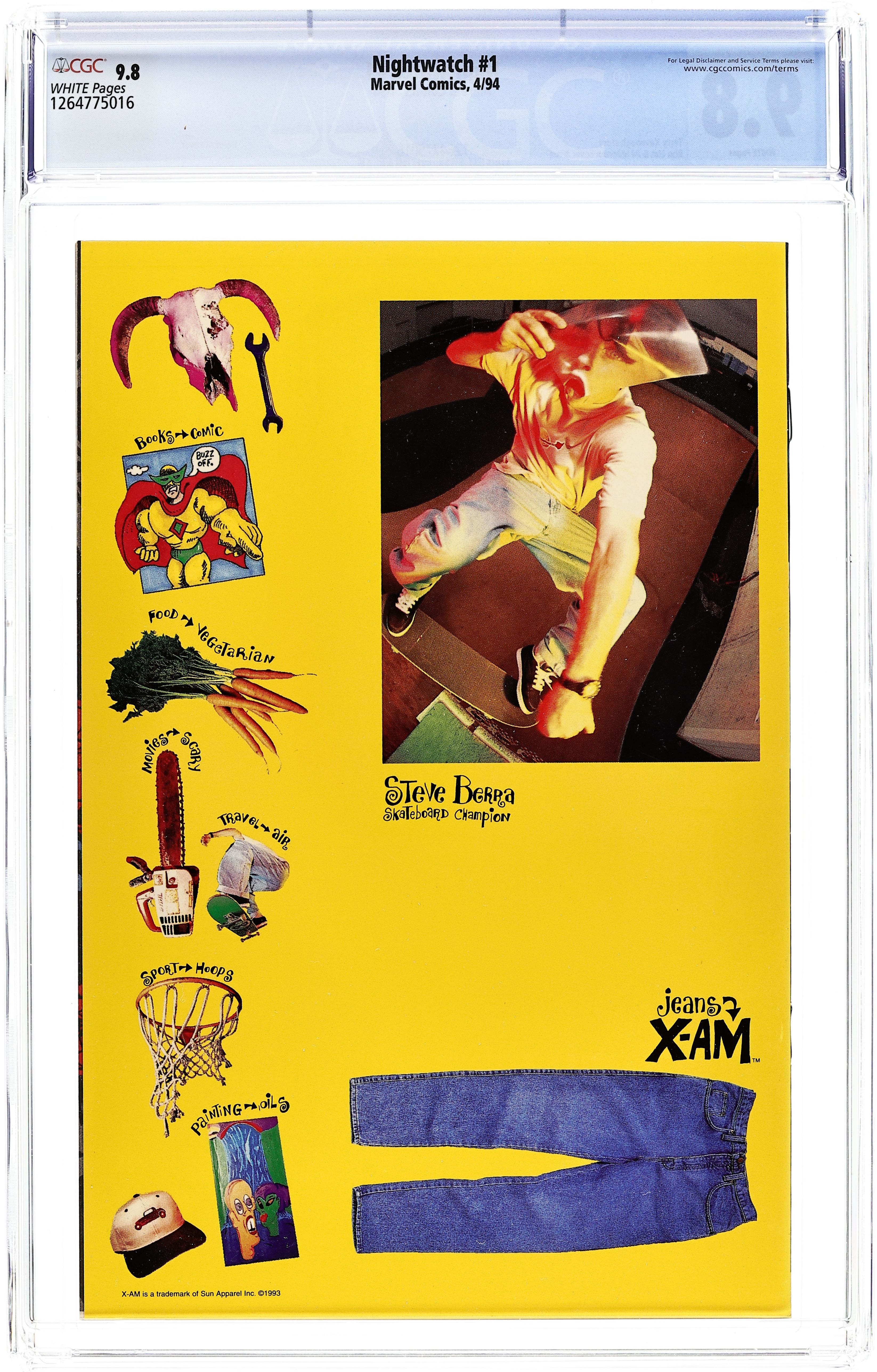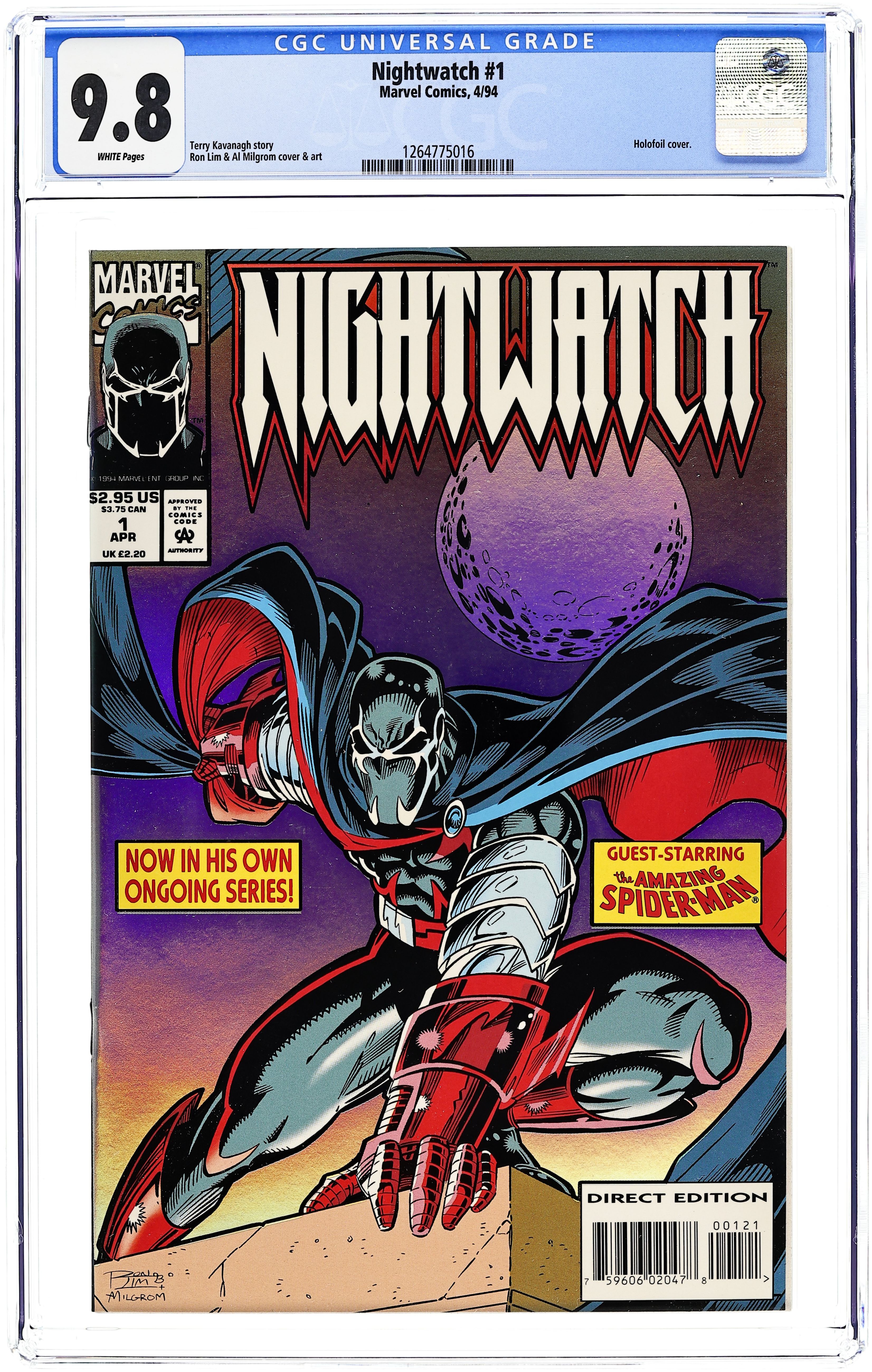 Direct Collector's Edition. Foil Cover. Cover pencils by Ron Lim, inks by Al Milgrom. "Life on the Edge," script by Terry Kavanagh, pencils by Ron Lim, inks by Al Milgrom; Web Of Spider-Man supporting character, Nightwatch, debuts in his first true clash with Spider-Man, and tackling a major new villain; After ten years of self-imposed exile, Nightwatch returns to New York to complete the cycle of his catastrophic legacy in this new monthly series; The mysterious Nightwatch, covered in perpetual darkness by his powerful costume, seeks answers to his origin and the loss of his long-lost love; Ten years ago, Dr. Kevin Trench mysteriously came to possess the powerful Nightwatch costume; Failing to save his love from a plane hijack, Dr. Trench hid from the world on a desolate island; His road to discovery begins with a search for the truth to his past, which happens to be our future; Standing in his way is a vicious new enemy, hell bent on keeping him from discovering the facts. Nightwatch llustration, pencils by Ron Lim, inks by Al Milgrom; Original cover design for the issue before they changed Nightwatch's costume, and made the cover foil. 36 pgs., full color. Cover price $2.95.