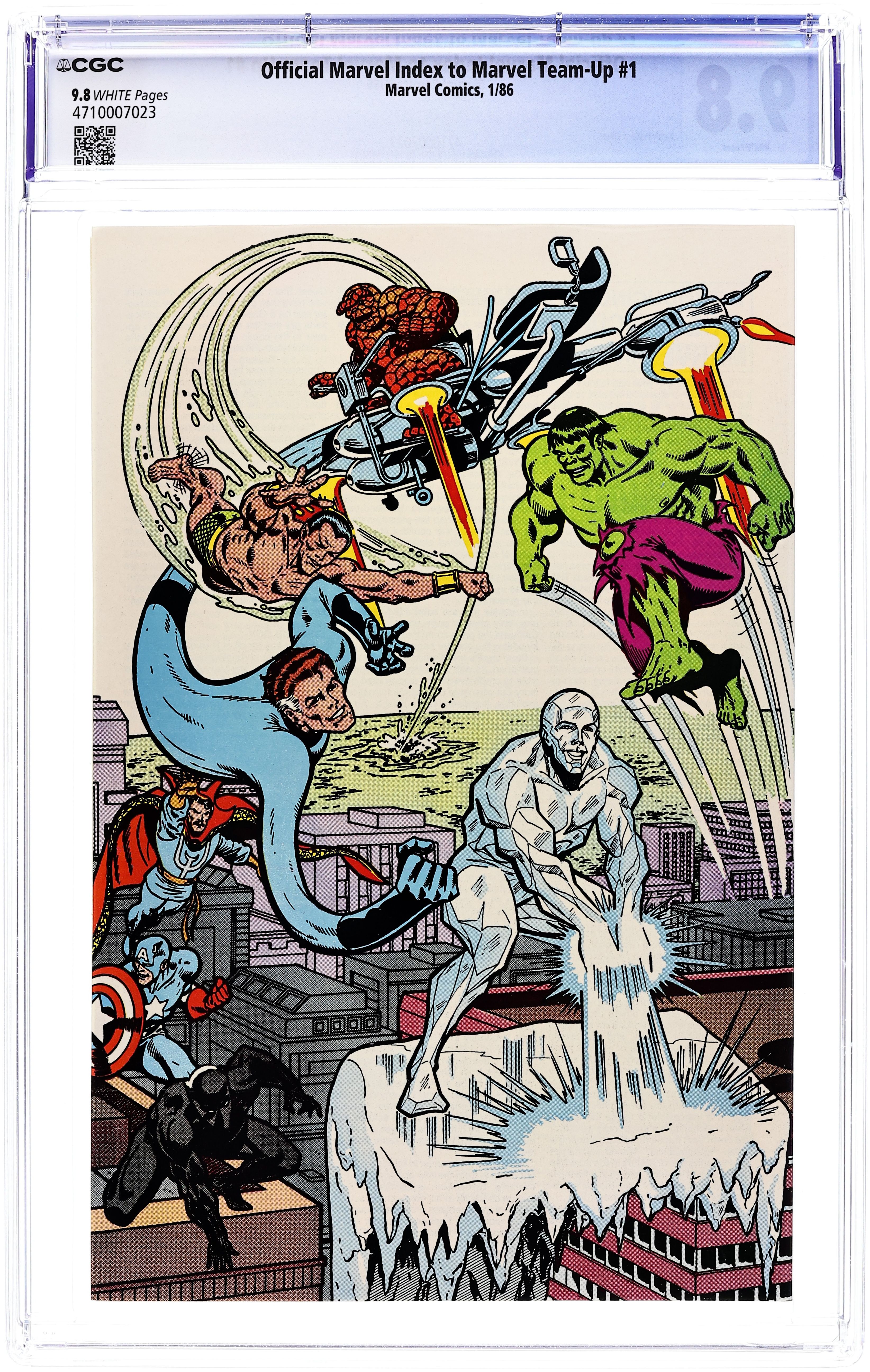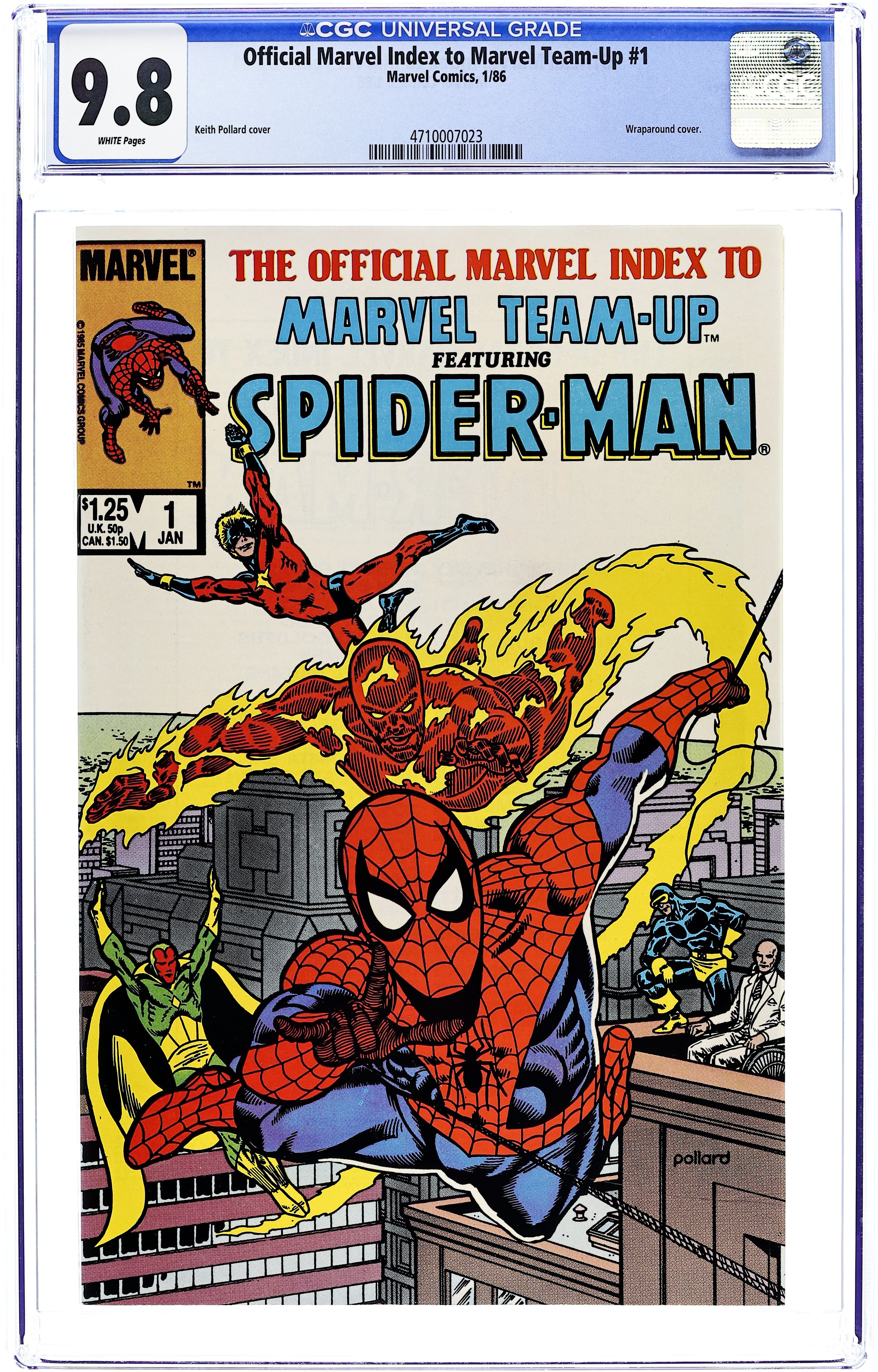 This issue covers Marvel Team-Up 1 thru 20. Each issue reviewed in the index has a one-and-a-half page summary and a reduced-size reprint of the original cover. Index contributors and consultants include George Olshevsky, Peter Garcia, Chuck Huber, Dennis Mallonee, Lou Mougin, Murray Ward, Mark Gruenwald, and Peter Sanderson. Cover by Keith Pollard. The wraparound cover portrays Spider-Man and the super-heroes he teamed up with in the first twenty issues. The Black Panther, Captain America, Doctor Strange, Hulk, Iceman, Mister Fantastic, Sub-Mariner, and the Thing are shown on the back side. The splash page features an essay on the history of the Marvel-Team Up title and a reduced-size version of the splash page from Marvel Team-Up 1. The back inside cover describes the plan and purpose for the Marvel Index series. (Notes: There are six issues in the Marvel Team-Up Index. There are not any ads in the index issues.) 32 pages Cover price $1.25.