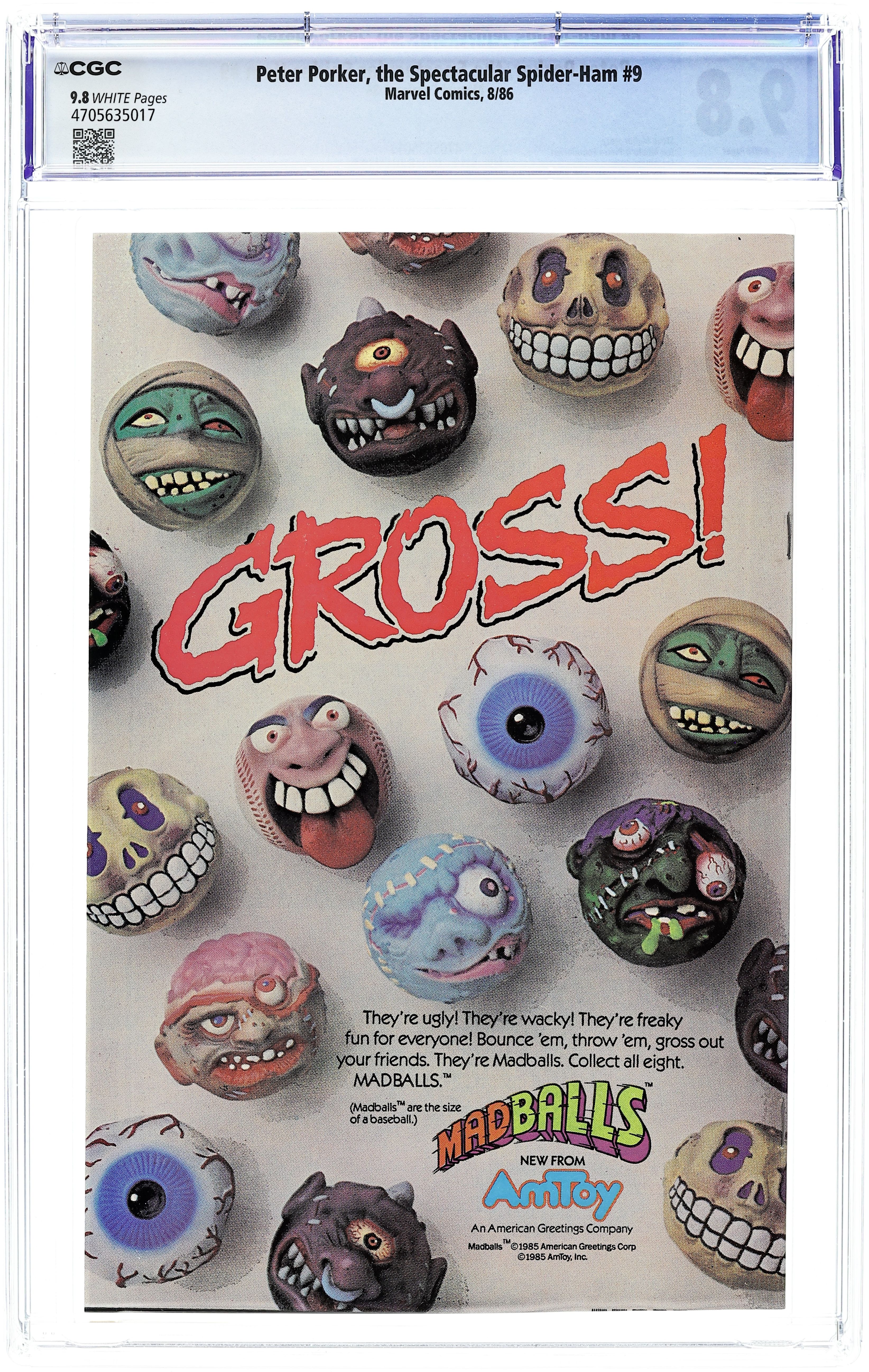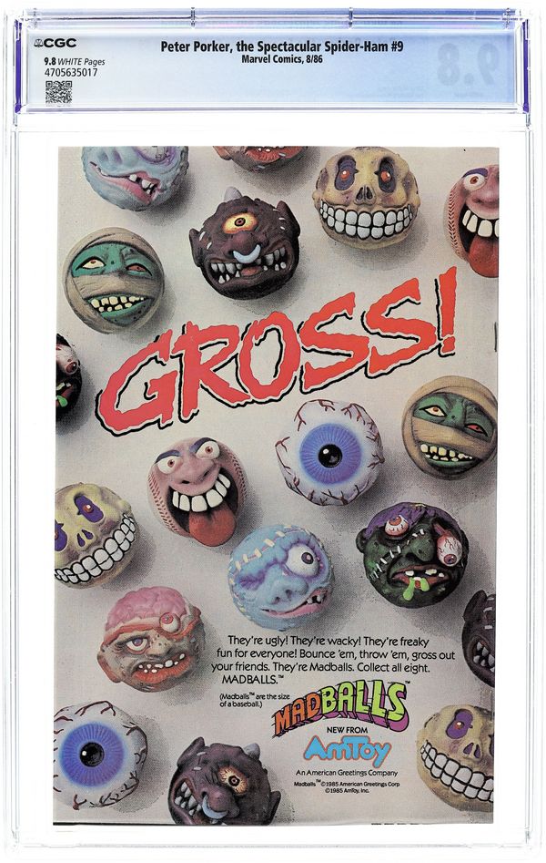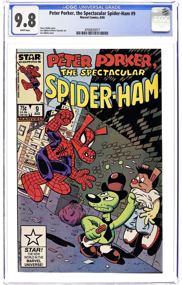 Direct Edition. Cover pencils by Mark Armstrong, inks by Joe Albelo. "The Old Goats at Home," script by Steve Skeates, pencils by Mark Armstrong, inks by Joe Albelo; Spider-Ham fails to stop the Senior Simians from robbing a bank. Jonah is fired by the Daily Beagle's new owner-editor, Charles Foster Pupp, who tries to befriend the three interns; Trying to make it as a reporter, Jonah misses several big stories, but discovers the hideout of the Senior Simians, who are then captured by Spider-Ham. "Tails of Arfgard," script and art by Steve Mellor; After chasing cars, Thrr returns to Arfgard, realm of the dogs, where he sees Herbdill the Watchdog, the great tree Hygga-Dygga, the awesome Odarn, and the evil Looky; They defeat Schmageggi, dogcatcher of the universe, and Thrr returns to car-chasing. 36 pgs., full color. $0.65. Cover price $0.65.