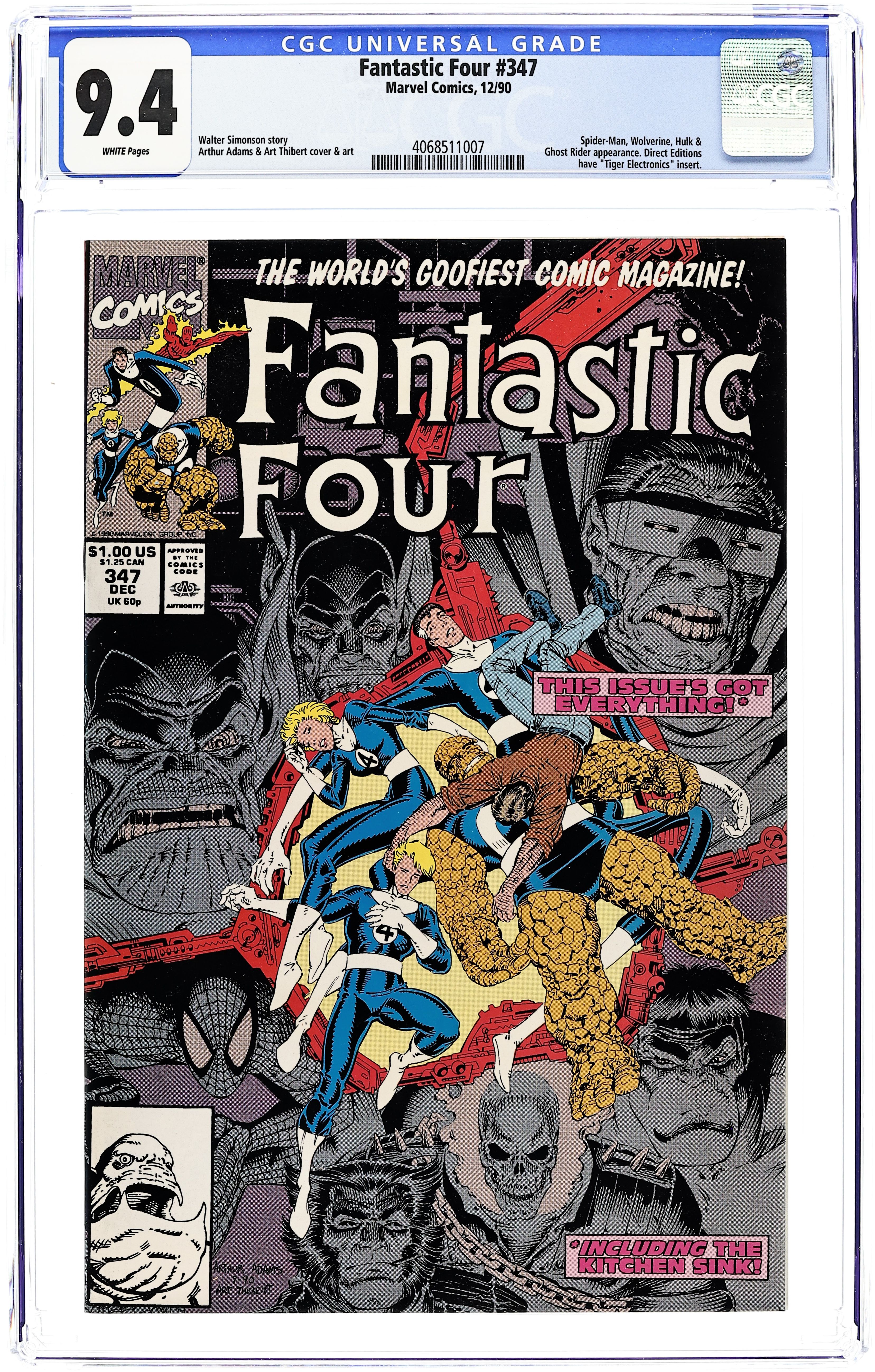 Direct Edition. "Eggs got Legs (or...Love Conquers All)!" Part 3 of 3. Guest-starring Spider-Man, Wolverine, Ghost Rider, and the Hulk. Punisher cameo. Story by Walt Simonson. Art and cover by Arthur Adams, Gracine Tanaka, Al Milgrom, and Art Thibert. Cover by Arthur Adams and Art Thibert. Spider-Man, Wolverine, Ghost Rider, and the Hulk have arrived on Monster Island only to find that there is more to this mystery than meets the eye. This one has it all - heroes, monsters, mutants, Skrulls, the Mole Man, even the Punisher. Don't miss the exciting conclusion to the New Fantastic Four Saga! 36 pgs. Cover price $1.00.