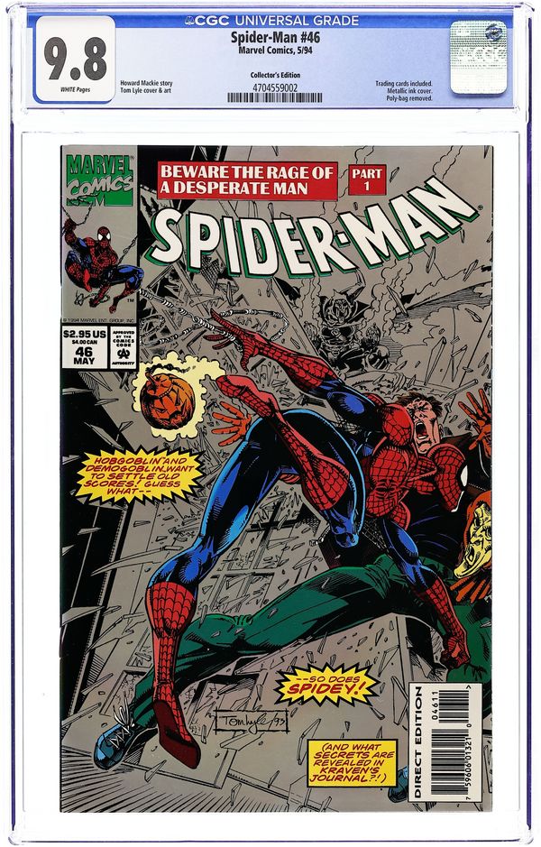 Unbagged Direct Collector's Edition. Does not include animation cel. Beware the Rage of a Desperate Man: Part 1 of 4. "Directions!" Story by Howard Mackie. Art by Tom Lyle and Scott Hanna. The sinister Hobgoblin and Demogoblin set out to settle their differences once and for all, and, as usual, Spidey is caught in the middle. Cover price $2.95.