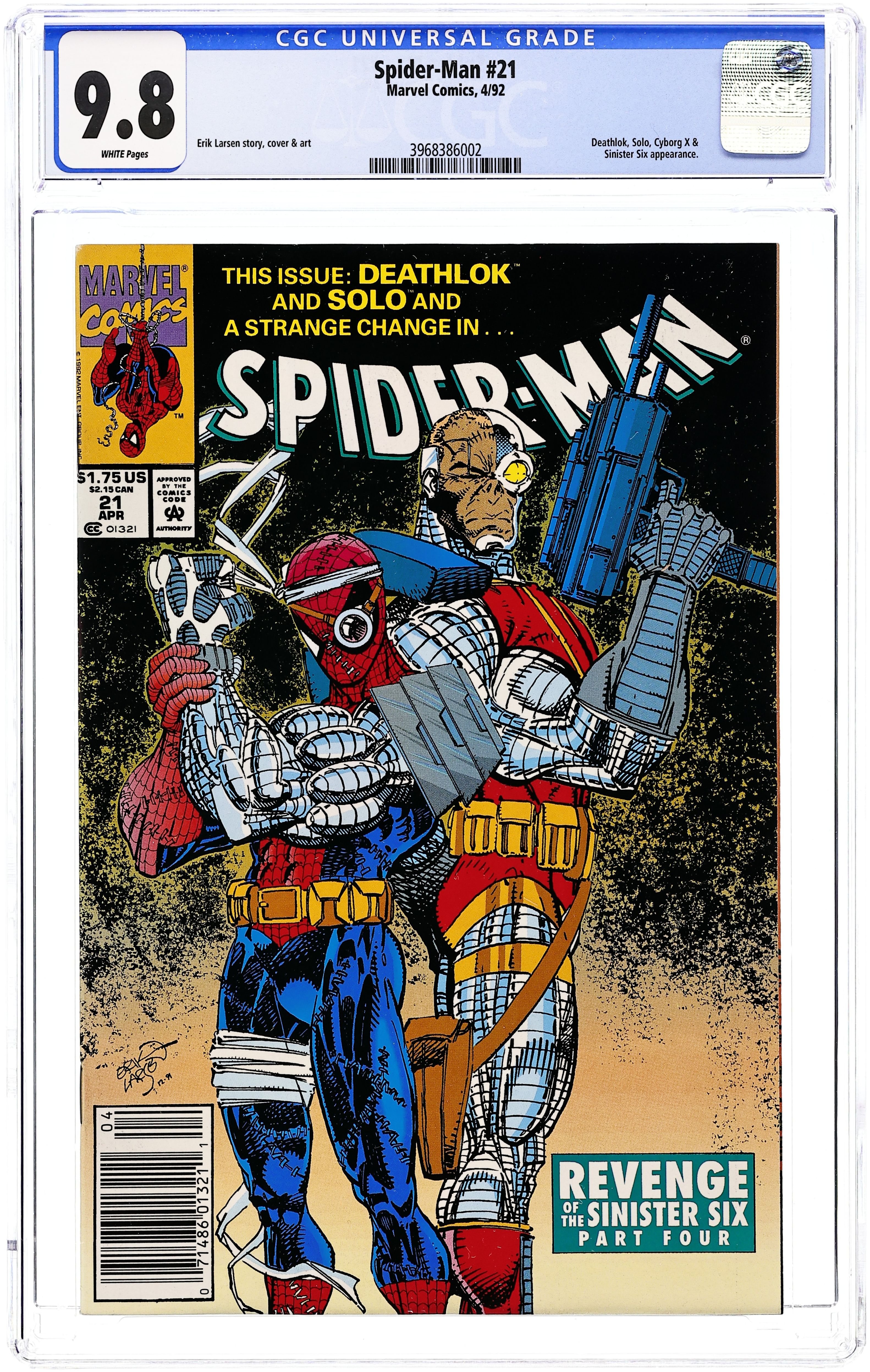 Newsstand Edition. Revenge of the Sinister Six: Part 4 of 6. "Dealing Arms!" Guest-starring Deathlok and Solo. Story, art, and cover by Erik Larsen. If Spidey is going to contend with an assemblage of his deadliest adversaries, he's going to need an upgrade. The cybernetic hero Deathlok and an all new Spidey set out to bring the Sinister Six down once and for all. They'll soon find that easier said than done. Cover price $1.75.