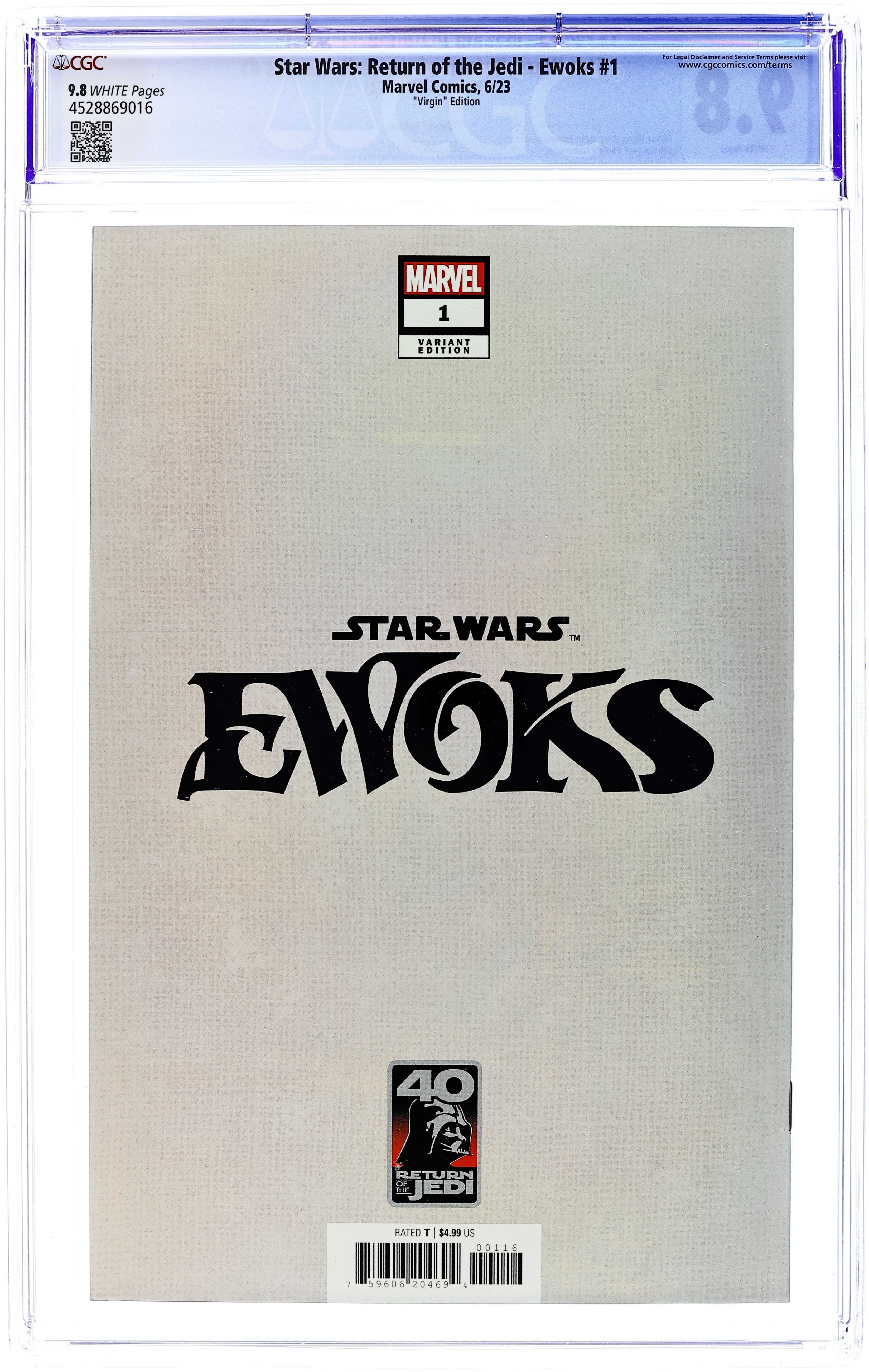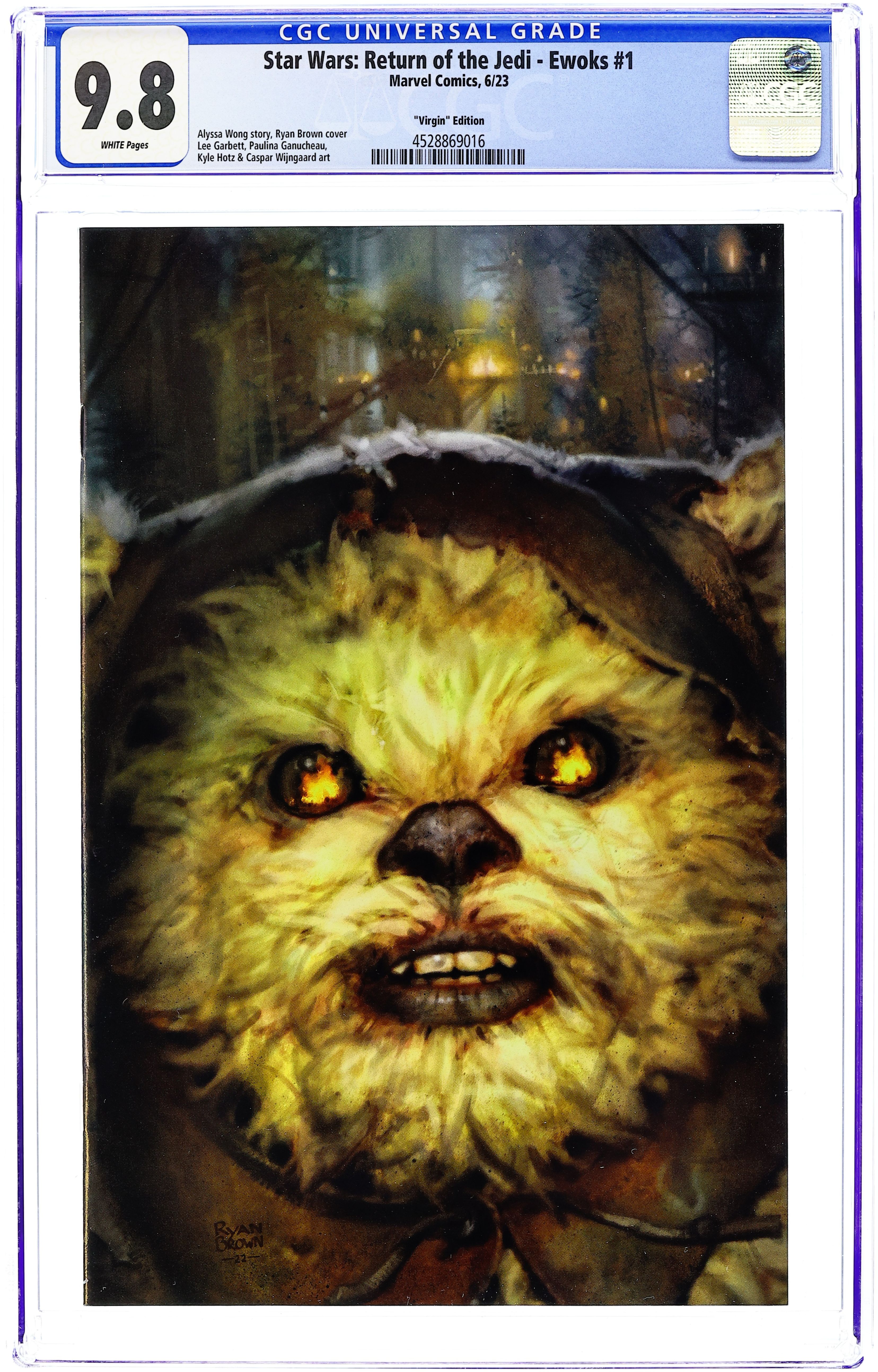 Limited 1 for 100 Retailer Incentive Variant Cover. Written by Alyssa Wong. Art by Caspar Wijngaard; Kyle Hotz; Lee Garbett . Cover by Ryan Brown TALES OF THE EWOKS! • On the moon of Endor occupied by the species called Ewoks, a group of these stout creatures has gathered around the fire to recount tales of triumph, defeat…and horror! • In the art-forward manner of storytelling, watch an eclectic group of artists interpret the stories from the unique minds of Ewoks in a manner only they can envision! • This cant-miss issue for Star Wars fans of mirth, merriment and artistry is the book you've been craving! 36 pages, full CP/B&W. Rated T Cover price $4.99.