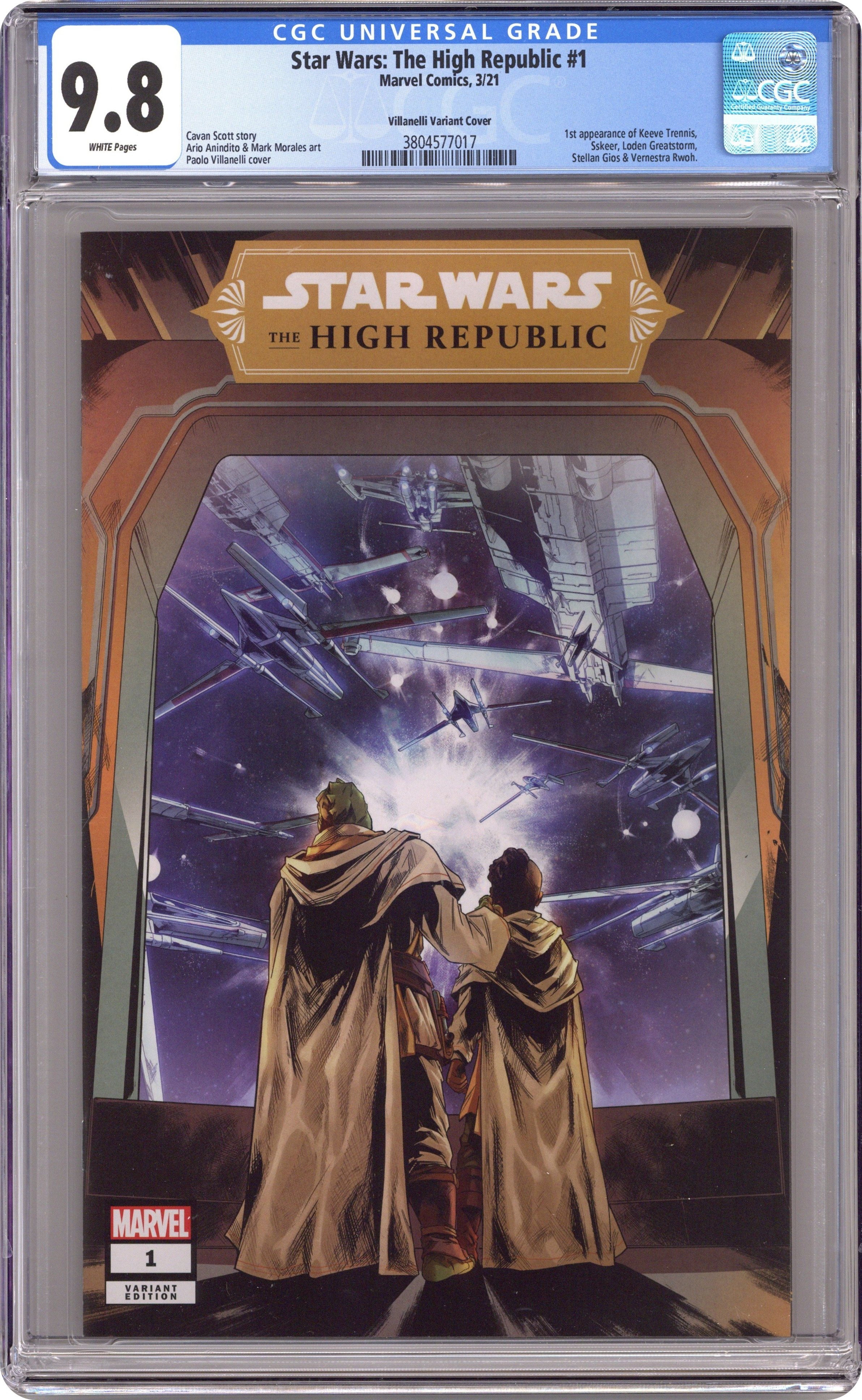 Written by Cavan Scott. Art by Ario Anindito and Mark Morales. Cover by Stephanie Hans. BEFORE THE SKYWALKER SAGA! THE GOLDEN AGE OF THE JEDI! A new era of STAR WARS storytelling begins. It is centuries before the SKYWALKER SAGA. The JEDI are at their height, protecting the galaxy as REPUBLIC pioneers push out into new territories. As the Frontier prepares for the dedication of majestic STARLIGHT BEACON, PADAWAN KEEVE TRENNIS faces the ultimate choice - will she complete her Jedi Trials or rescue the innocent from disaster? New Jedi! New ships! New evils to fight! 28 pages, full color. Rated T Cover price $3.99.