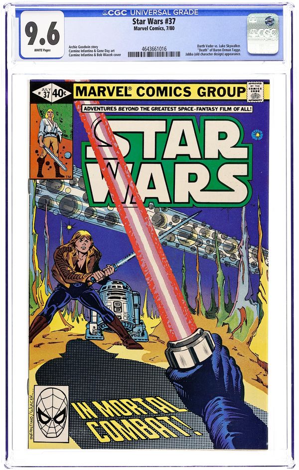 Direct Edition. "In Mortal Combat!" Written by Archie Goodwin. Art by Carmine Infantino and Gen Day. Before "The Empire Strikes Back," there was this harrowing tale which finds young Luke Skywalker facing the most feared person in all the galaxy, Darth Vader. Barely trained int eh ways of the force, can Luke survive an encounter with the deadliest man in the galaxy on a world whose terrain is just a deadly as his adversary? Cover price $0.40.