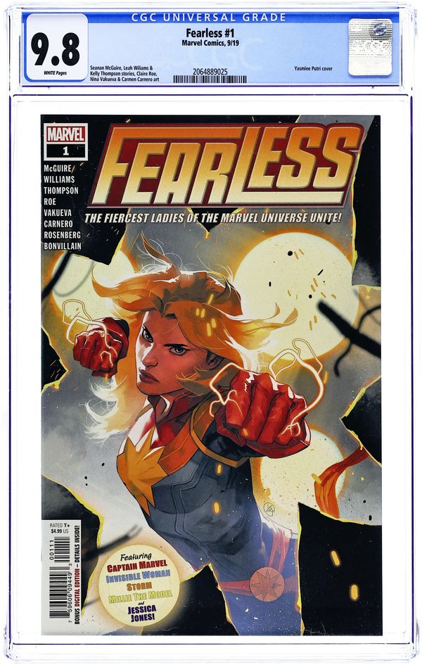 Written by Seanan McGuire, Leah Williams, and Kelley Thompson. Art by Claire Roe, Rachelle Rosenberg, Nina Vakueva, Carmen Carnero, and Tamara Bonvillain. Cover by Yasmin Putri. THE FIERCEST LADIES OF THE MARVEL UNIVERSE - ON AND OFF THE PAGE! Straight off her silver-screen debut, Captain Marvel takes the world by storm! And speaking of the weather, Storm of the X-Men faces a problem only a goddess could solve. Add the Invisible Woman, and you've got an unstoppable trio in a story by Hugo-nominated novelist and SPIDER-GWEN: GHOST-SPIDER writer Seanan McGuire! Then, Leah Williams takes us back to the golden days of romance with Millie the Model! PLUS: Get your dose of herstory with profiles on classic and contemporary creators! 36 pages, full color. Rated T+ Cover price $4.99.