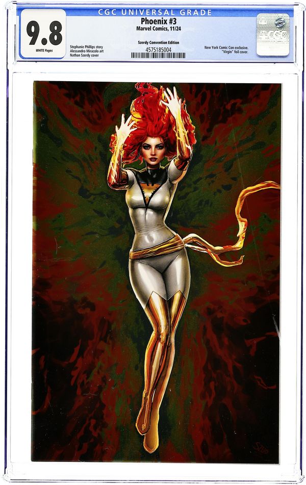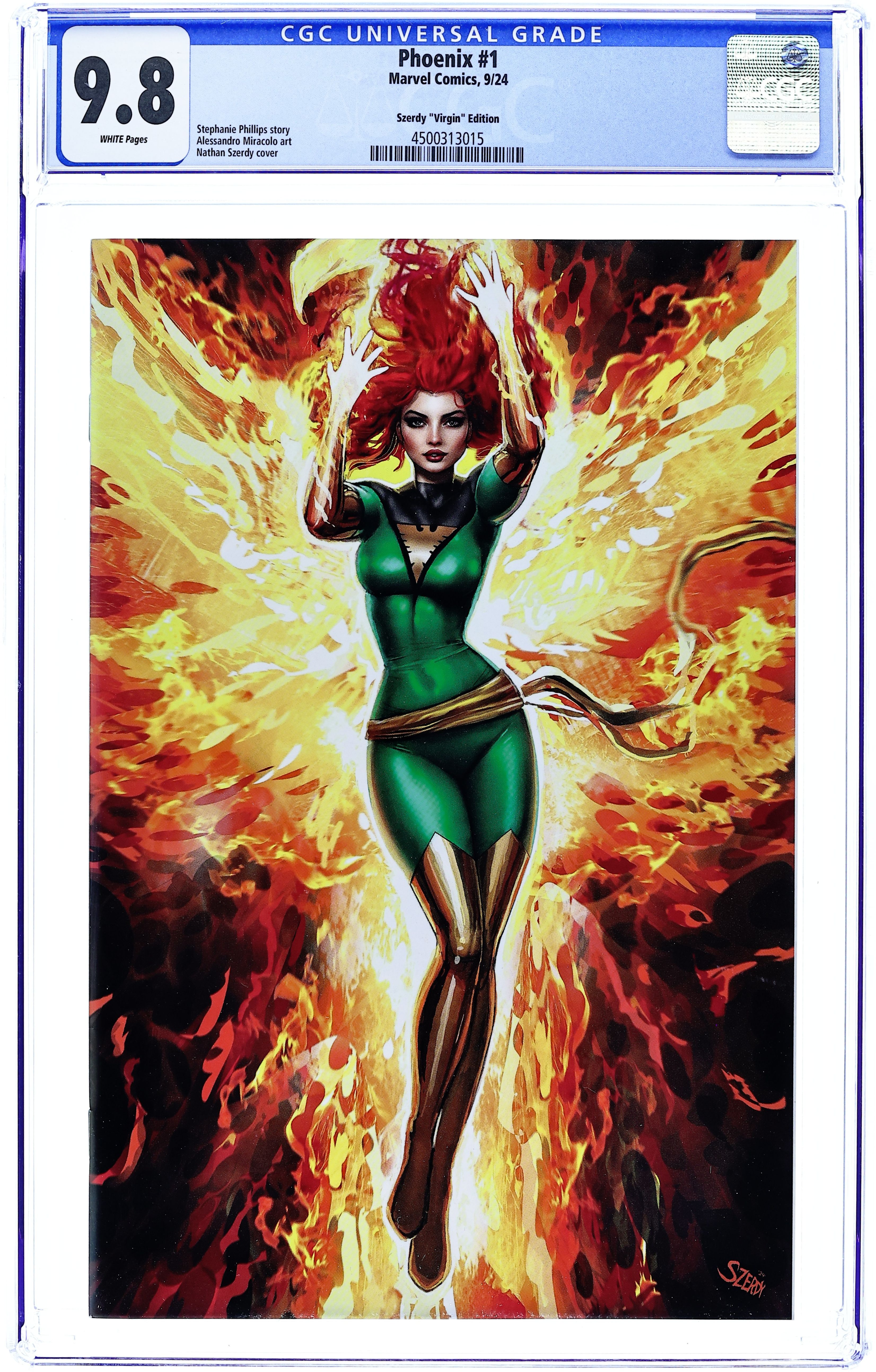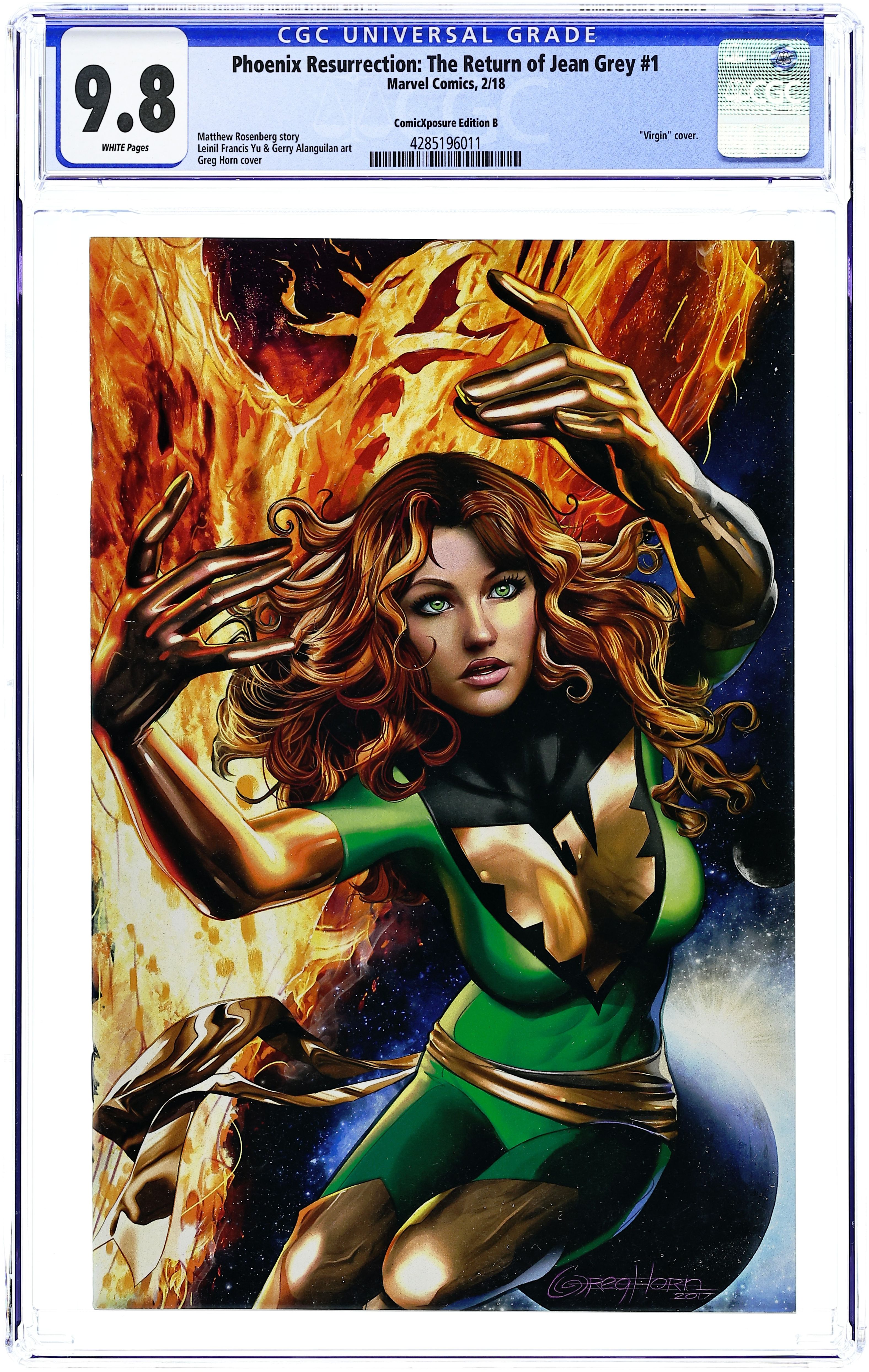 ComicXposure exclusive "Green" Edition Virgin cover by Greg Horn. Written by Matthew Rosenberg. Art by Leinil Francis Yu. She will return, like a Phoenix from the ashes. Years ago, Jean Grey died and the X-Men mourned her. Since then, the world has changed, her teammates have lived without her and died without her. And now, when strange events start happening all over the world, those teammates can only come to one conclusion - the one true Jean Grey is back! 36 pages, full color. Rated T+ Cover price $4.99.