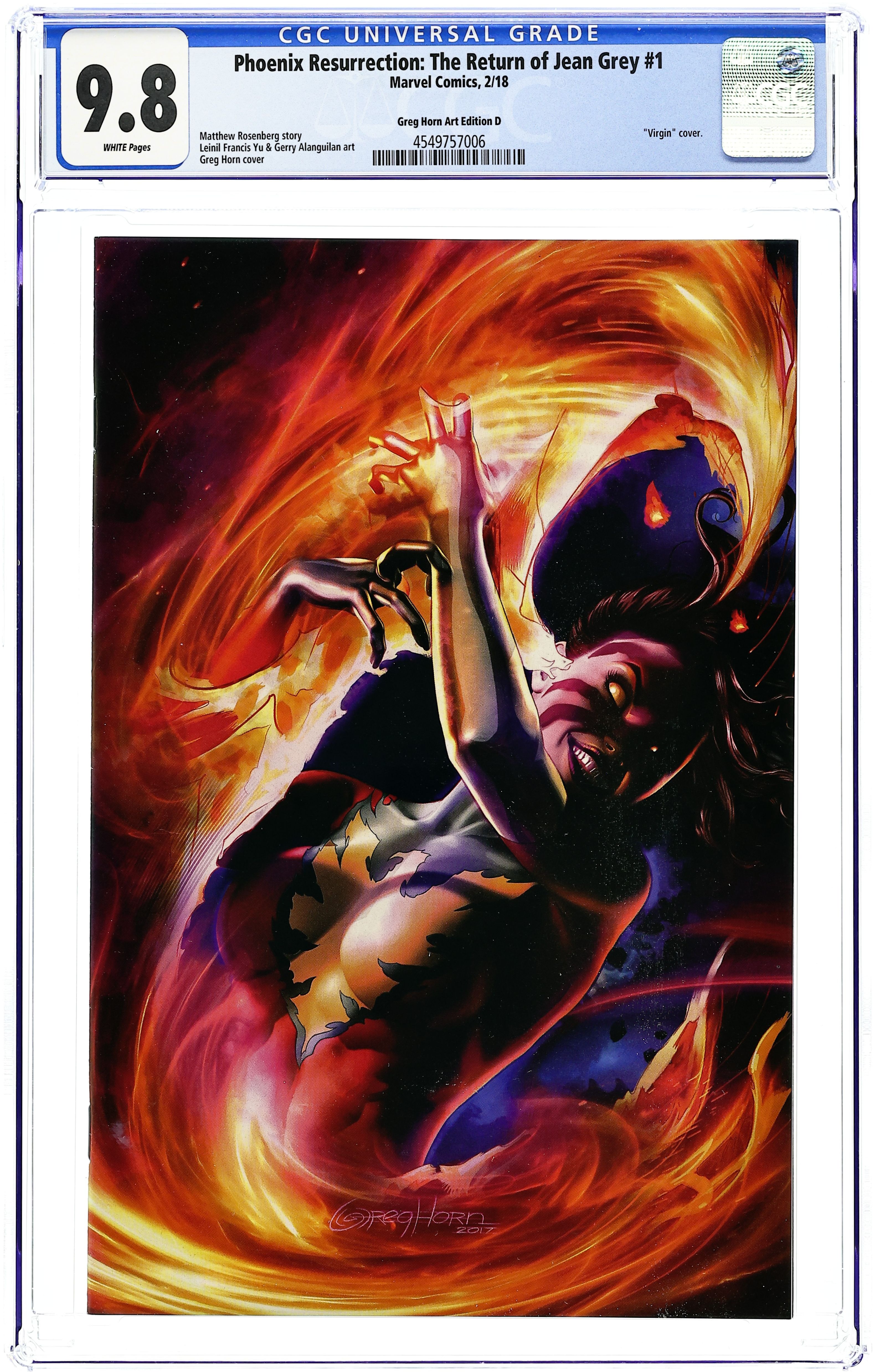 ComicXposure exclusive "Dark Phoenix" Edition Virgin Cover by Greg Horn. Written by Matthew Rosenberg. Art by Leinil Francis Yu. She will return, like a Phoenix from the ashes. Years ago, Jean Grey died and the X-Men mourned her. Since then, the world has changed, her teammates have lived without her and died without her. And now, when strange events start happening all over the world, those teammates can only come to one conclusion - the one true Jean Grey is back! 36 pages, full color. Rated T+ Cover price $4.99.