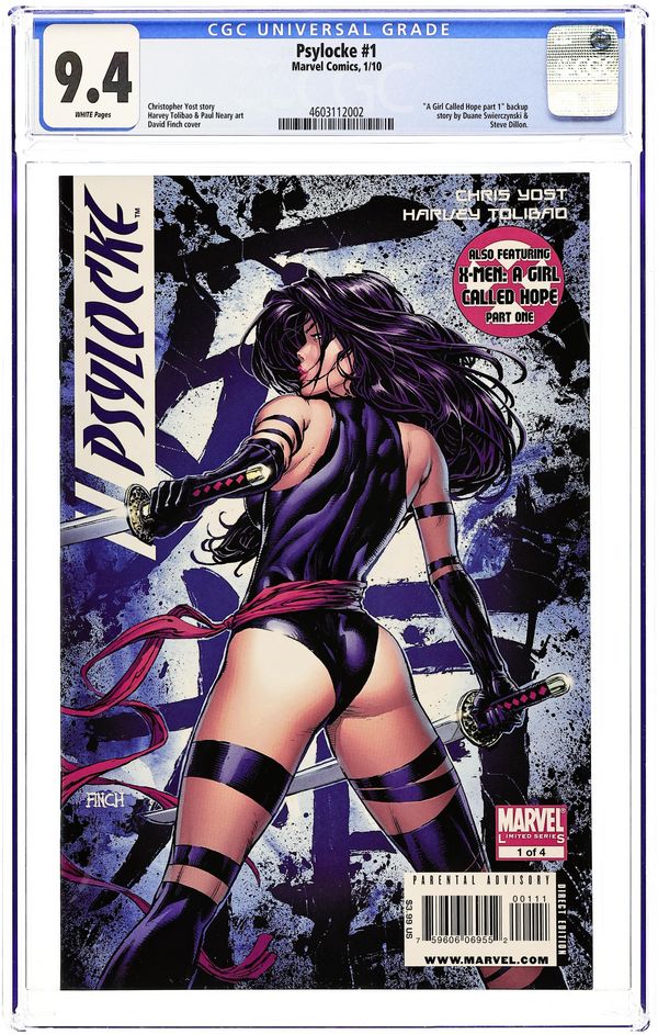 Written by CHRISTOPHER YOST. Art by HARVEY TOLIBAO. Cover by DAVID FINCH. Psylocke has returned to the X-Men! Following the defeat of Madelyne Pryor and her Sisterhood, Psylocke travels to Japan to re-inter her former body in its proper resting place. But when a swarm of Hand ninjas attack Psylocke and do the unspeakable under orders from Matsu'o-the assassin originally responsible for transplanting Psylocke's mind into the body of an Asian ninja-Psylocke determines that Matsu'o is one loose end that can no longer be left unresolved. It's a tale of carnage and revenge, brought to you by superstars Chris Yost (X-FORCE) and Harvey Tolibao (AVENGERS: THE INITIATIVE)! PLUS: Contains "X-Men: A Girl Called Hope, Part One," a 6-page Cable back-up tale by DUANE SWIERCZYNSKI andSTEVE DILLON. 40 pages, full colro. Cover price $3.99.