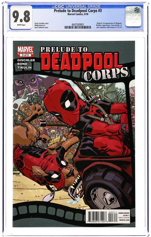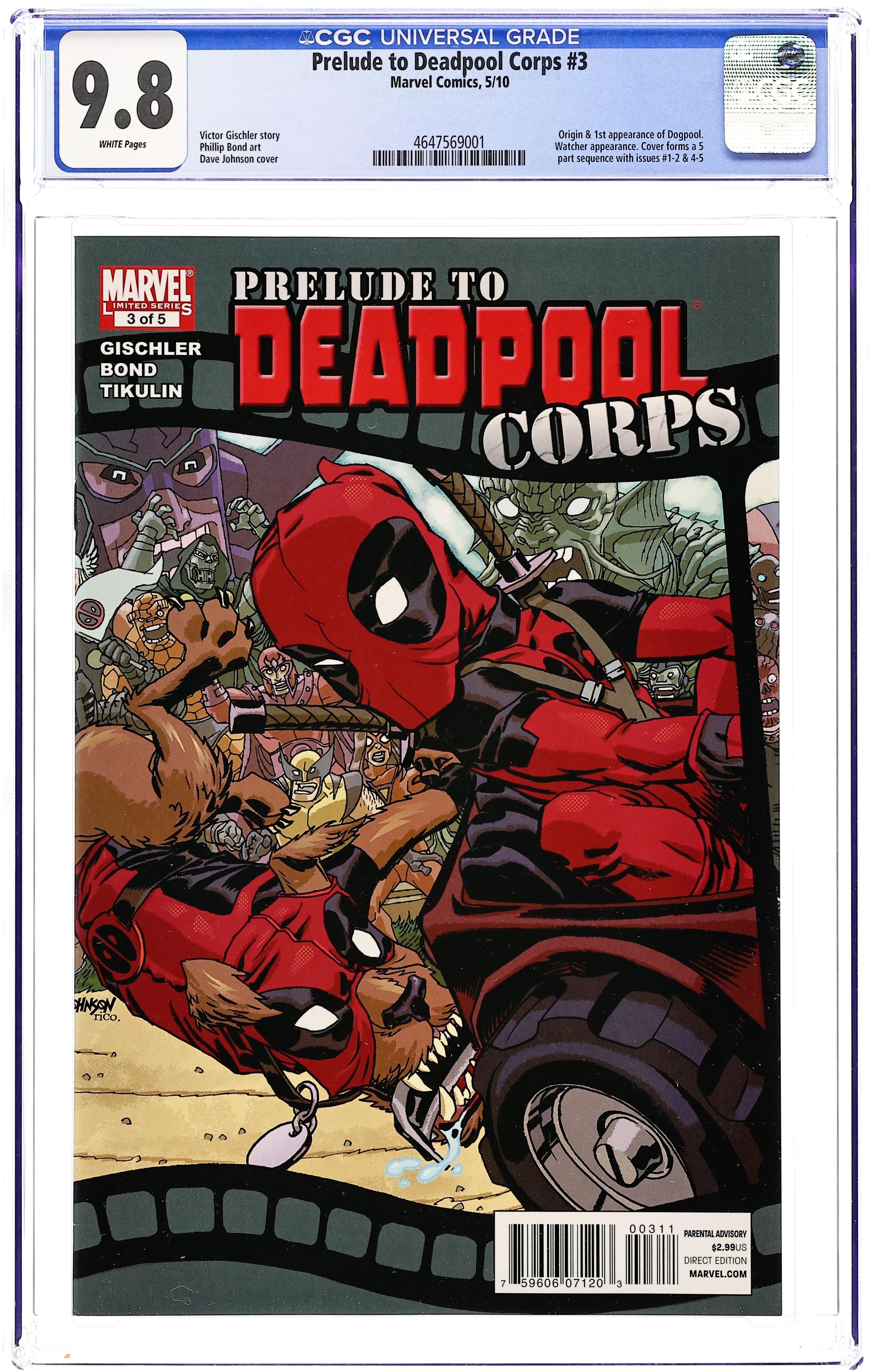 Written by VICTOR GISCHLER. Art by PHILIP BOND. Cover by DAVE JOHNSON. Witness the birth of the most important super hero team ever in a universe-spanning event that will rock the month of March! Wade Wilson has been tapped to save the Universe, and to do that he's going to need help. Enter: The sexy-but-insecure Lady Deadpool! The devious-but-lovable Headpool (a.k.a. the Zombie Deadpool Head)! The bratty-but-brilliant Kidpool! And the irascible mutt known as Dogpool! Individually, they're, well, kind of messed up, but together, they're the unstoppable force know as DPC. 32 pages, full color. Cover price $2.99.